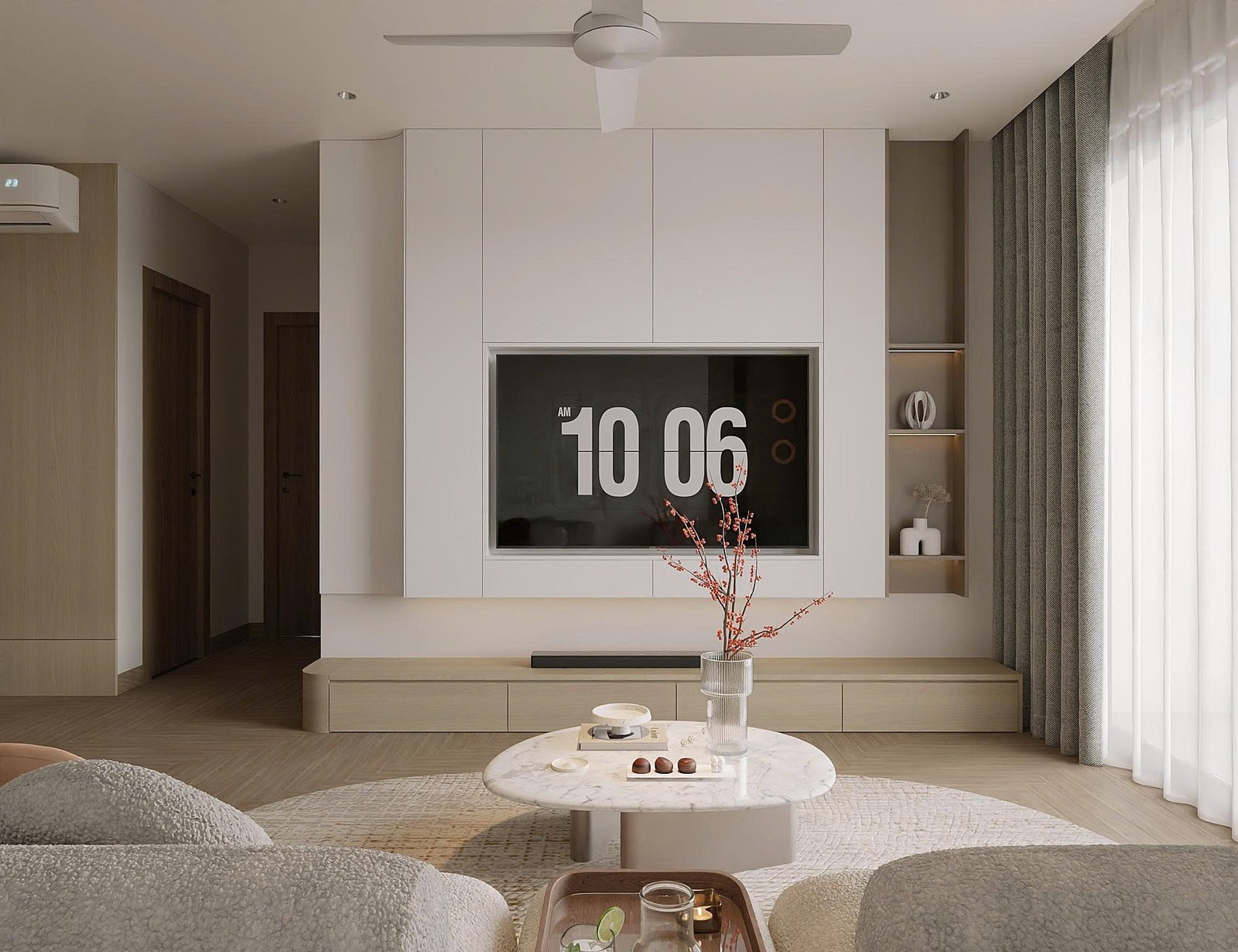 Kệ TV âm tường hiện đại tối ưu diện tích trong nội thất chung cư Khai Sơn