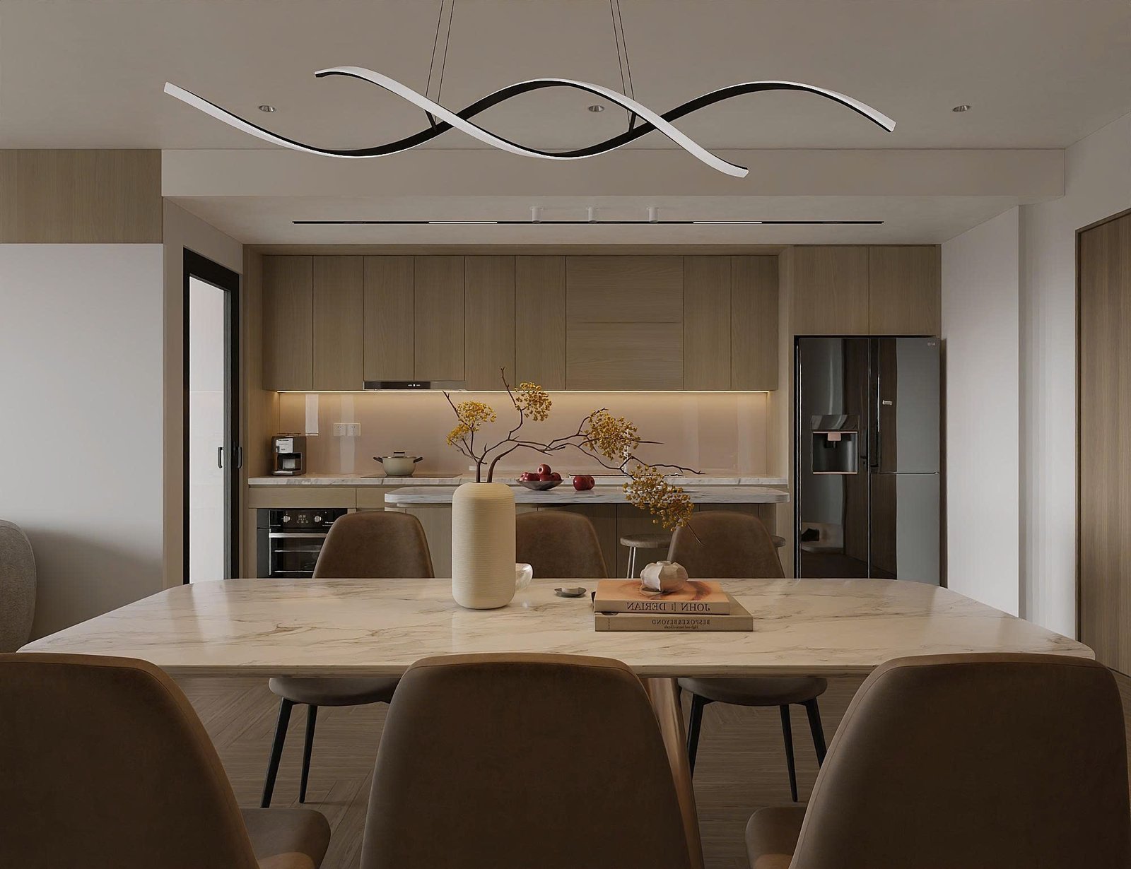 Sự kết nối mở giữa phòng khách và khu vực bếp là điểm cộng lớn trong mặt bằng nội thất chung cư Khai Sơn. Khu vực bàn ăn được định hình bởi chiếc đèn trần nghệ thuật uốn lượn như một dải lụa mềm mại đang lơ lửng giữa không trung. Ánh sáng vàng ấm từ đèn thả không chỉ chiếu sáng mà còn đóng vai trò là một tác phẩm điêu khắc trang trí, làm tôn lên vẻ đẹp của mặt bàn đá và những chiếc ghế ăn bọc da màu nâu trầm ấm.