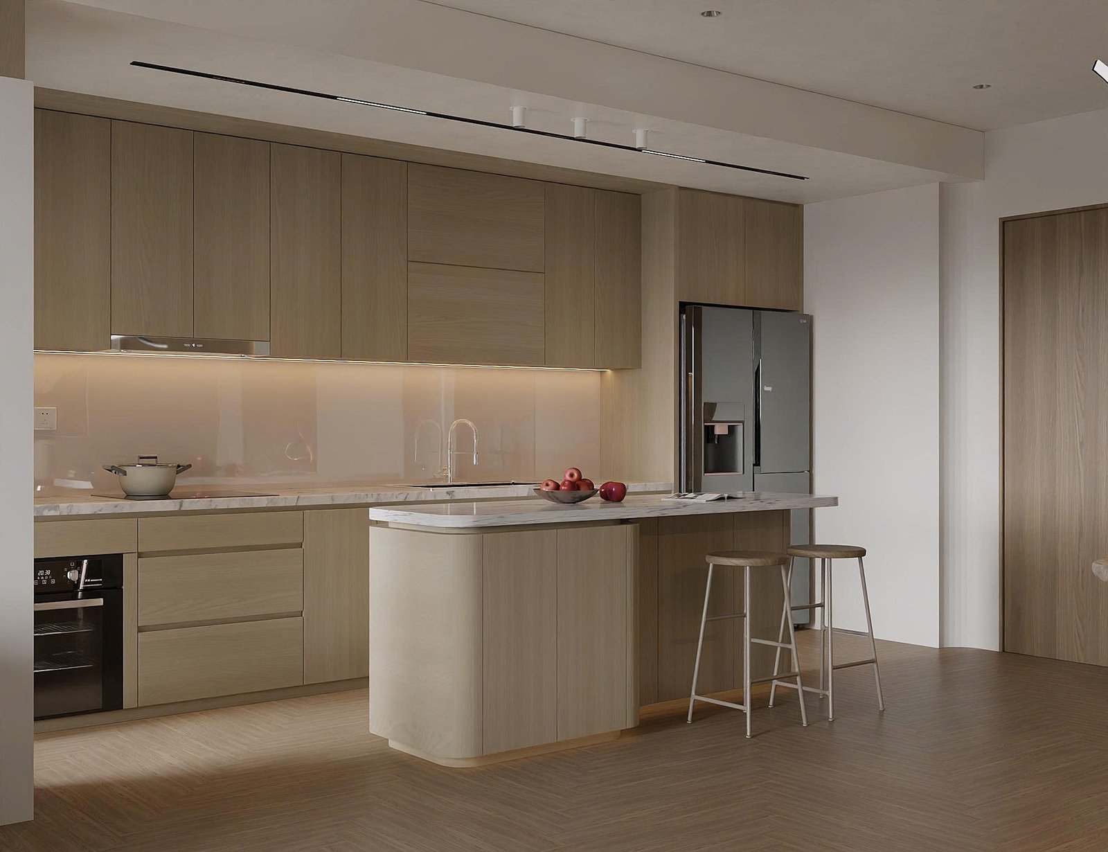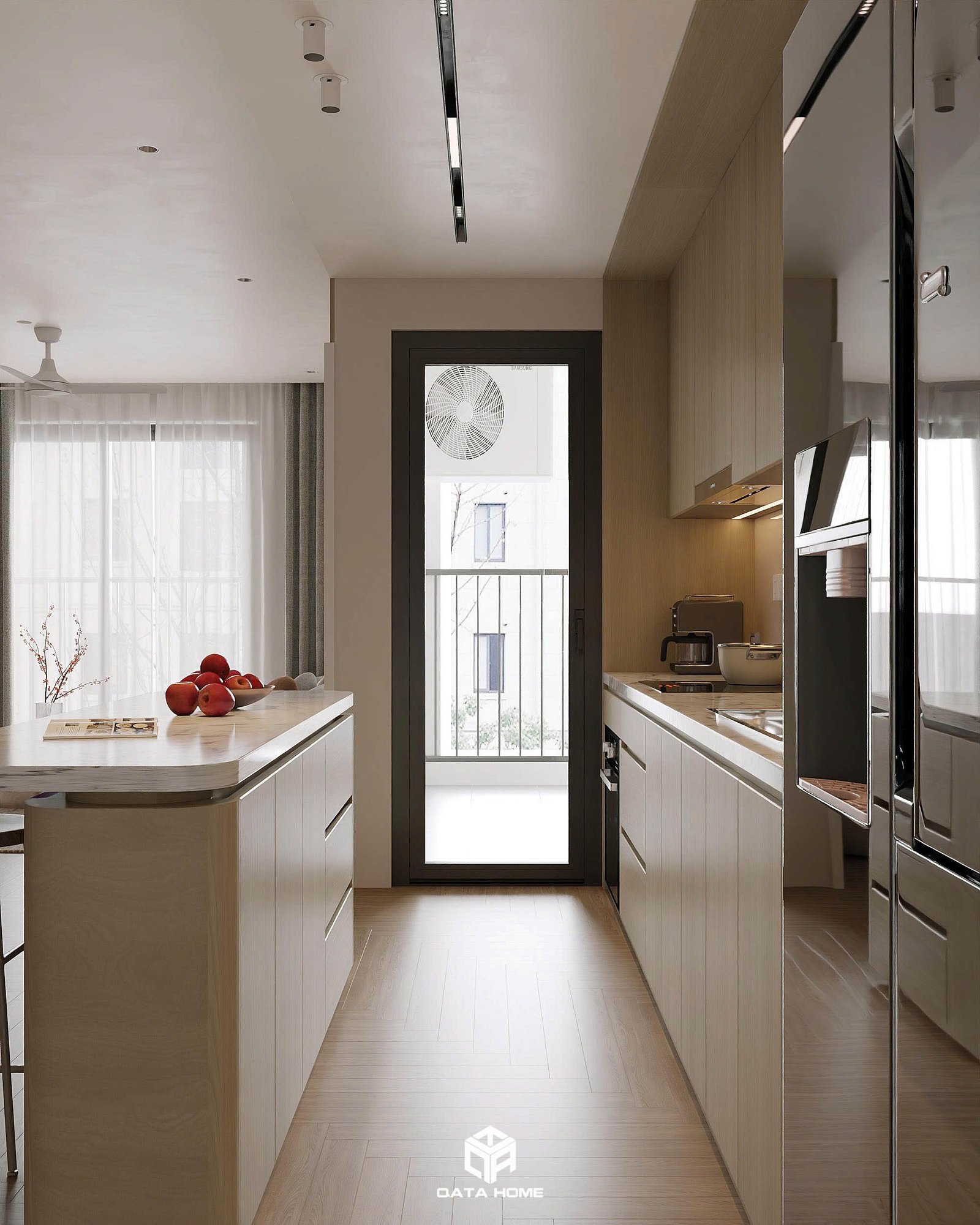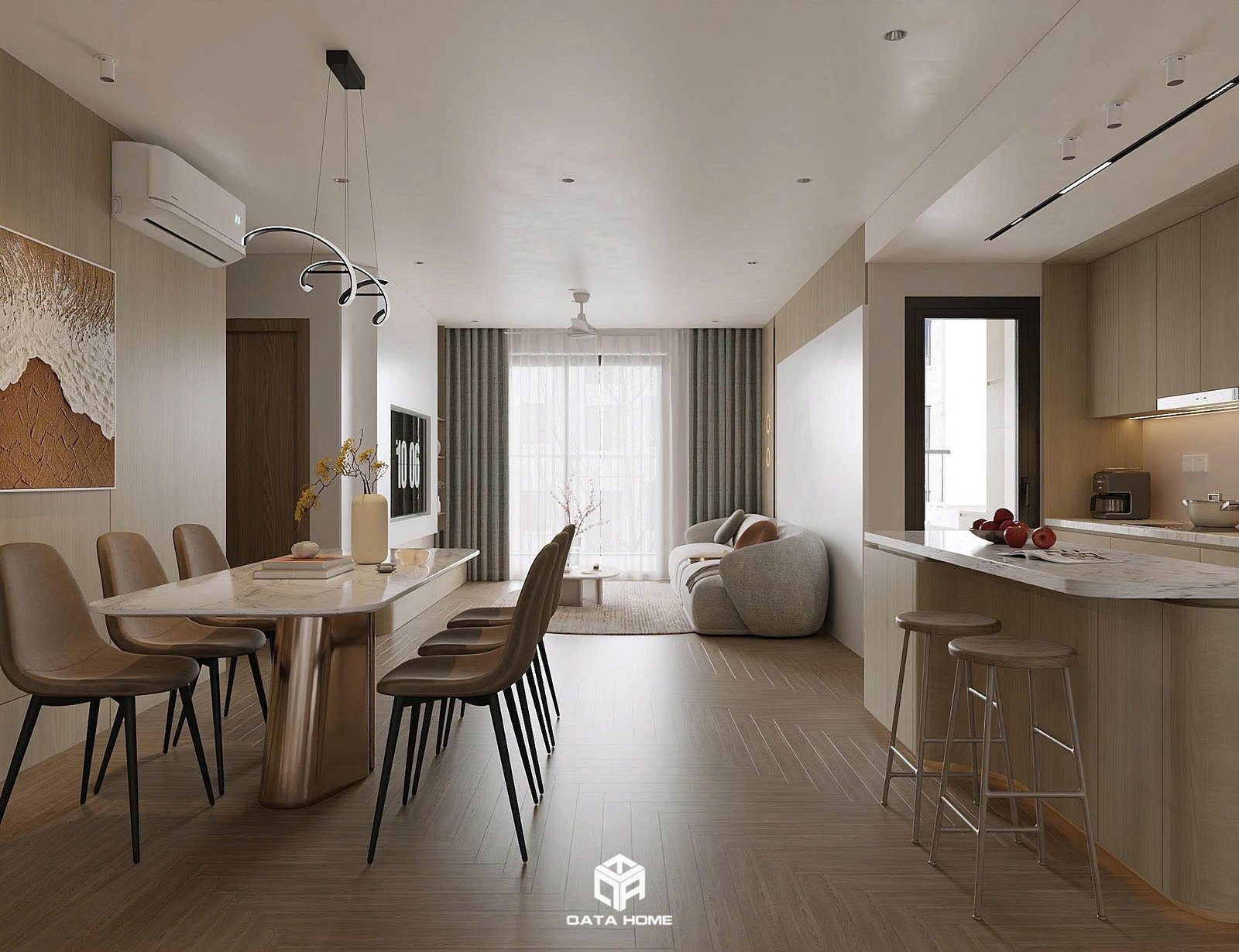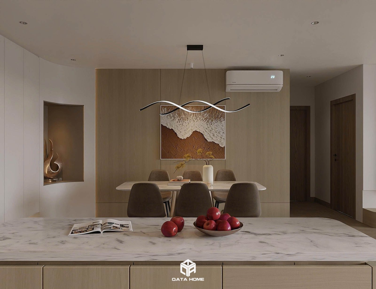 Khu vực bếp được Qata Home xử lý bằng hệ tủ gỗ sáng màu với thiết kế phẳng, không tay nắm (handleless design), tạo nên sự liền mạch tuyệt đối. Đảo bếp tích hợp quầy bar nhỏ là nơi lý tưởng để thưởng thức một ly vang hay bữa sáng nhanh gọn. Việc sử dụng ánh sáng LED âm tủ không chỉ giúp việc nấu nướng thuận tiện hơn mà còn tạo ra những khoảng tối – sáng đầy tính điện ảnh cho căn bếp vào buổi tối.