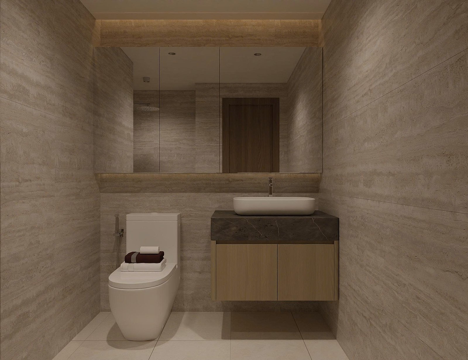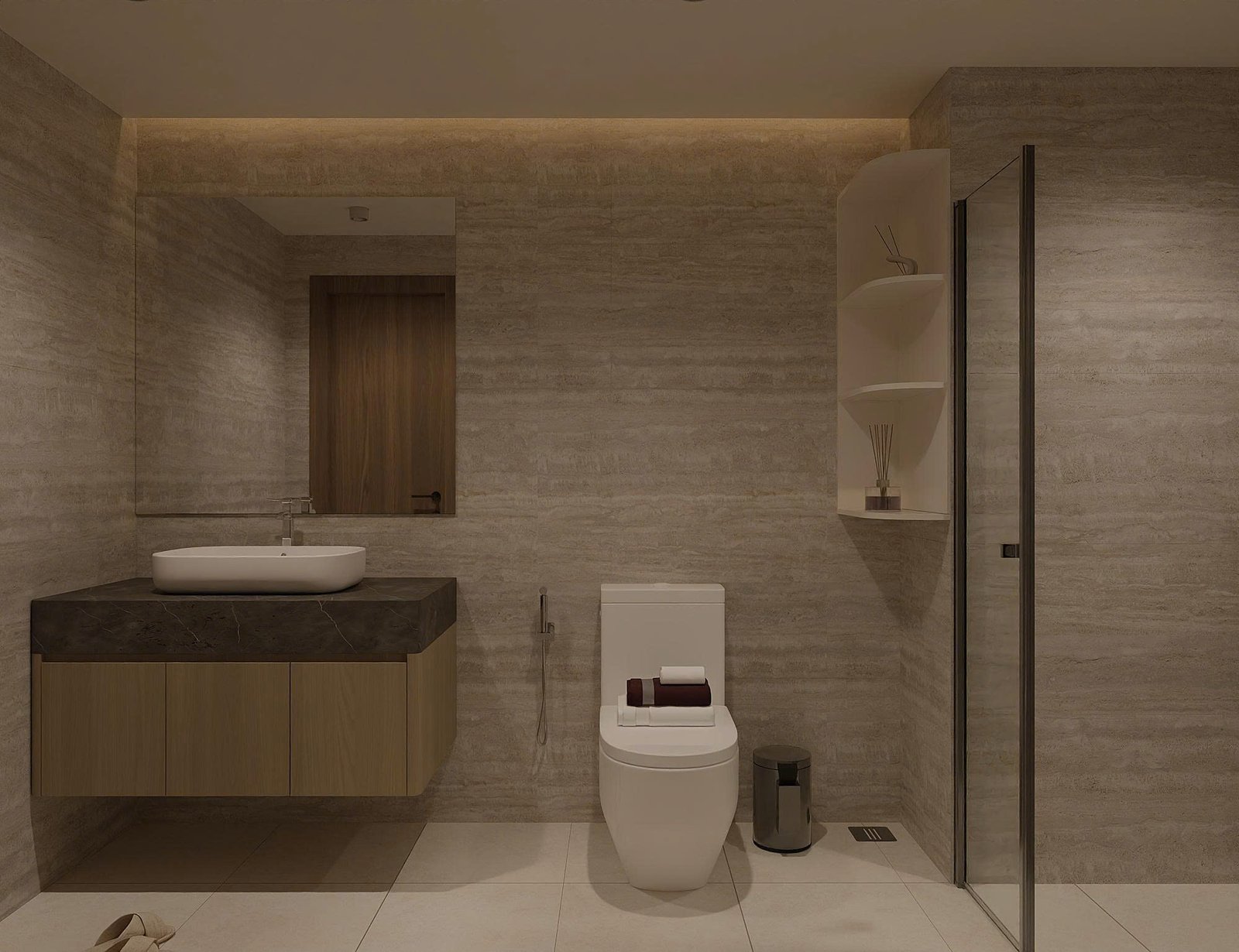 Không gian phụ nhưng mang lại giá trị hưởng thụ lớn, phòng vệ sinh tại dự án nội thất chung cư Khai Sơn được thiết kế như một phòng spa mini ngay tại gia. Qata Home sử dụng gạch ốp lát toàn phần với vân đá tự nhiên màu trung tính, tạo nên một tổng thể sạch sẽ và mở rộng về mặt thị giác. Ánh sáng vàng dịu hắt ra từ các khe gương và trần thạch cao không chỉ làm nổi bật vân đá mà còn tạo ra bầu không khí ấm cúng, xua tan cảm giác lạnh lẽo thường thấy của các khu vực vệ sinh truyền thống.