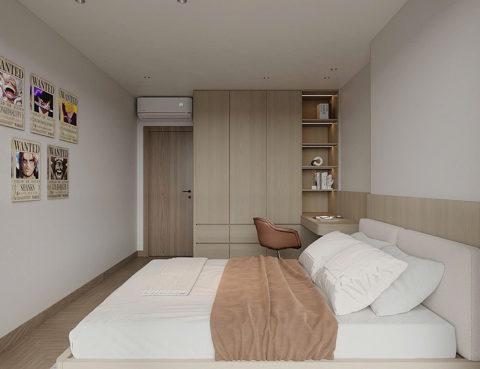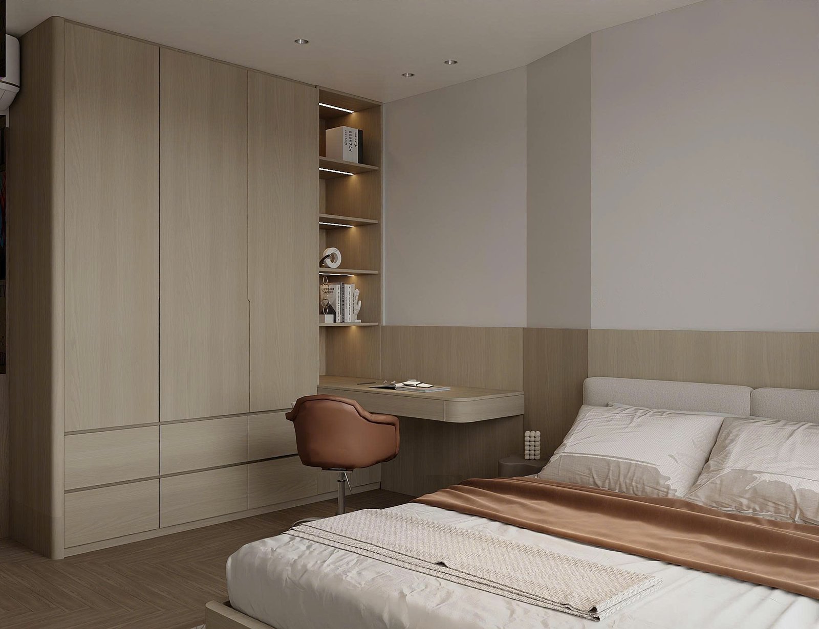 Đối với phòng ngủ phụ trong dự án nội thất chung cư Khai Sơn, Qata Home tập trung vào việc tối ưu hóa diện tích nhưng vẫn đảm bảo tính thẩm mỹ đồng bộ. Căn phòng là sự kết hợp thông minh giữa khu vực nghỉ ngơi và góc làm việc yên tĩnh. Hệ tủ quần áo kịch trần được thiết kế bo góc mềm mại ở phía ngoài, nối liền với hệ kệ trang trí có đèn LED âm tủ, tạo nên một dải công năng xuyên suốt và gọn gàng.