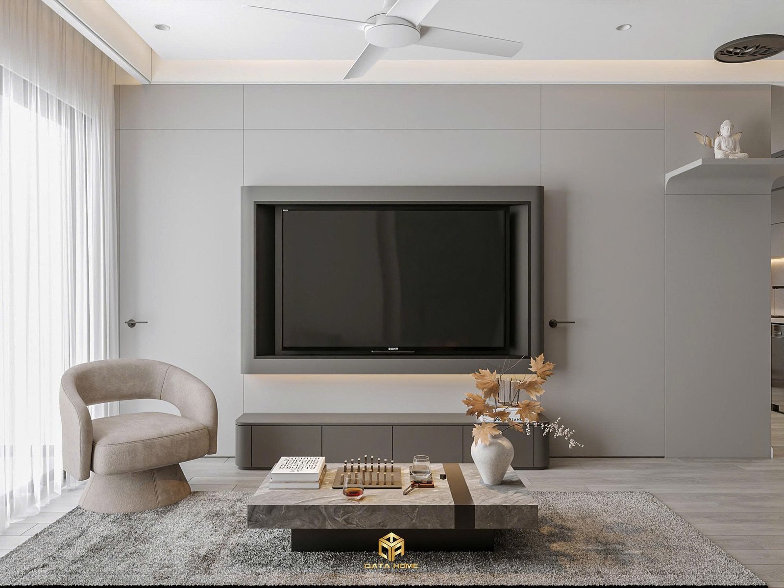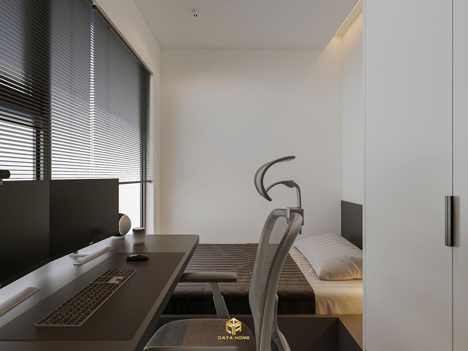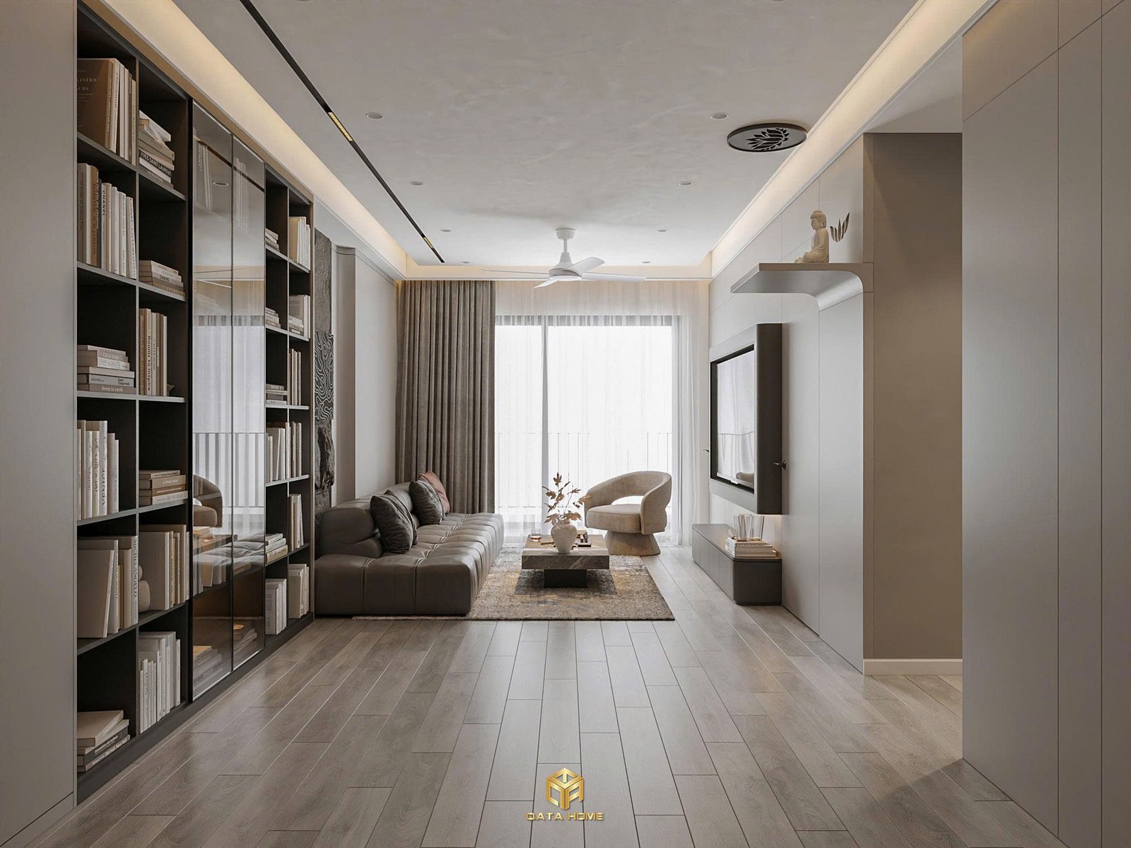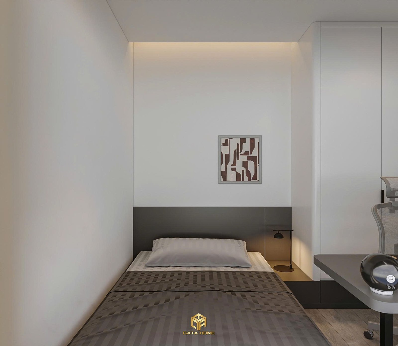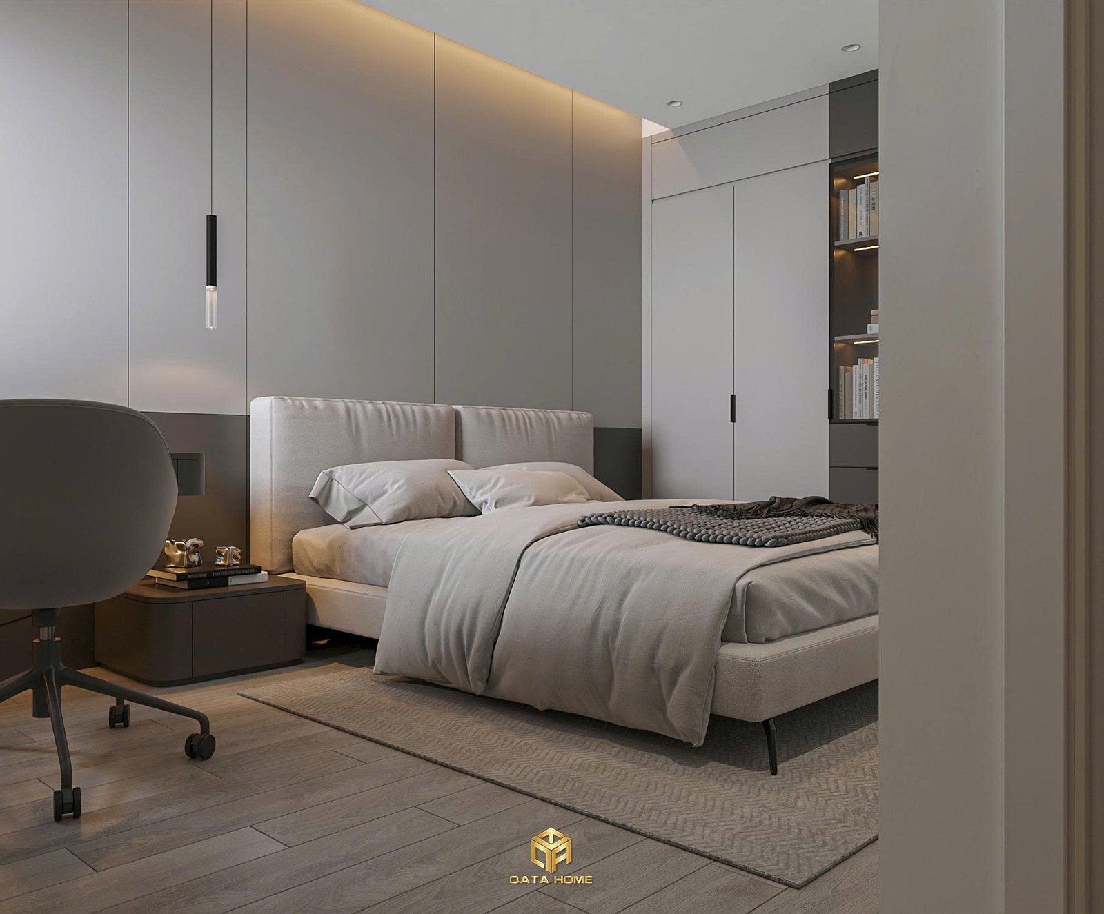 Chúng tôi đã khéo léo bố trí ghế armchair xoay phong cách hiện đại bên cạnh cửa sổ lớn, mang đến góc nhìn thoáng đãng ra ban công. Đây chính là minh chứng rõ nét cho triết lý thiết kế nội thất chung cư hiện đại của Qata Home: tối ưu công năng mà vẫn giữ được sự sang trọng.