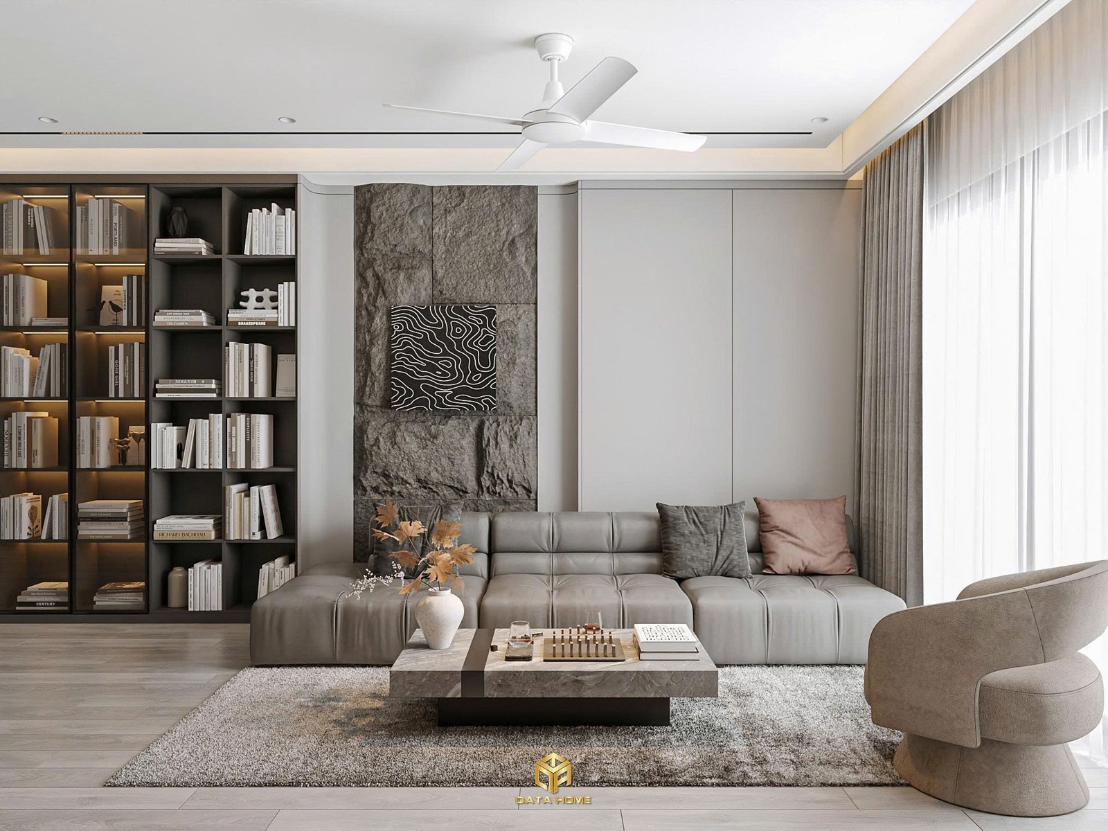 Bước vào phòng khách, bạn ngay lập tức bị cuốn hút bởi hệ kệ sách lớn chạy dọc tường với ánh sáng LED ẩn, kết hợp sofa da hiện đại và bàn trà đá marble. Thiết kế nội thất chung cư Five Star hiện đại tại khu vực này sử dụng vách đá tự nhiên tạo điểm nhấn mạnh mẽ, kết hợp quạt trần trắng tối giản và TV treo tường hiện đại. Không gian mở giúp ánh sáng lan tỏa, biến phòng khách thành nơi lý tưởng để sum vầy hoặc thư giãn sau ngày dài.