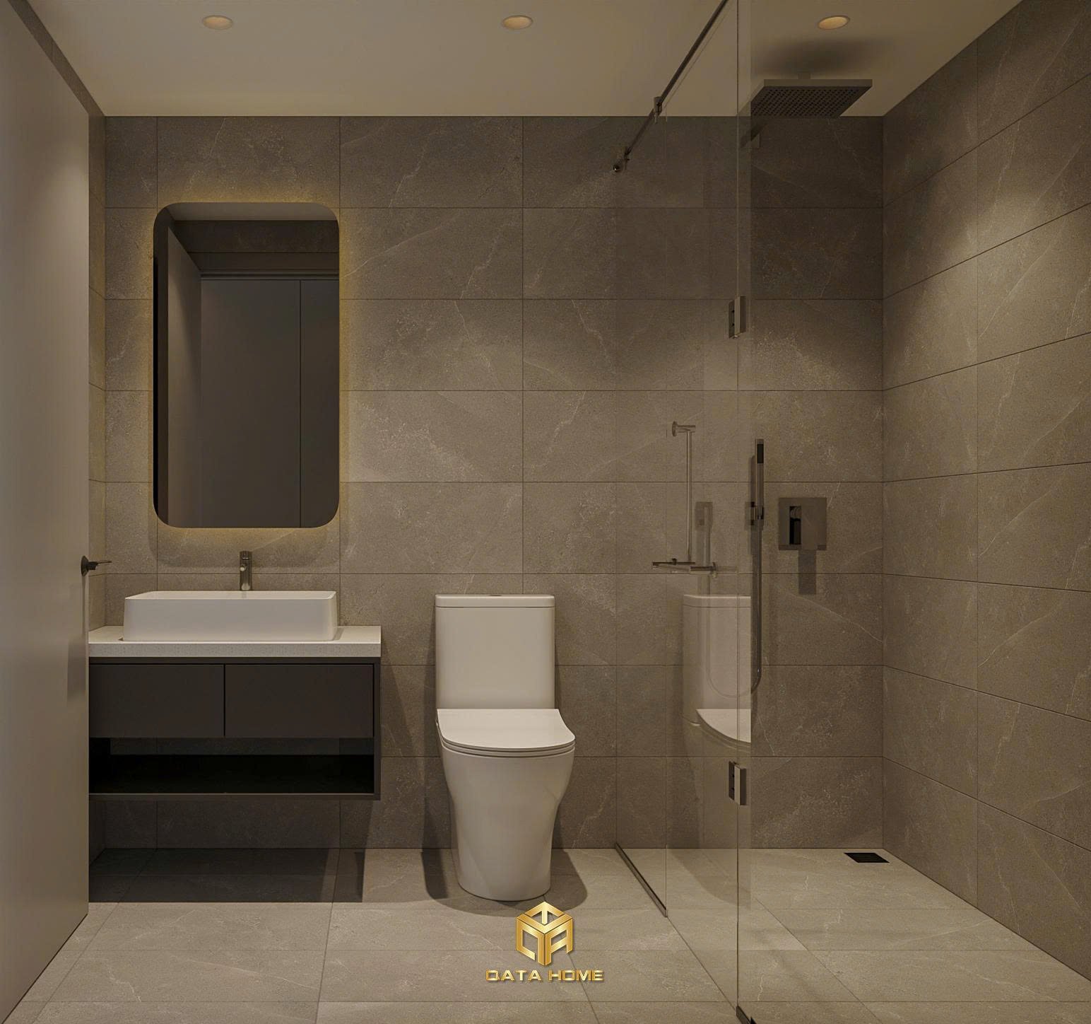 Phòng tắm sử dụng gạch marble xám sang trọng, bồn cầu thông minh, lavabo treo tường và vòi sen kính hiện đại. Thiết kế nội thất chung cư Five Star hiện đại ở khu vực này mang đến cảm giác spa tại nhà. Ban công được tận dụng tối đa với sàn gỗ composite và ghế thư giãn, biến thành góc xanh nhỏ giữa lòng chung cư.