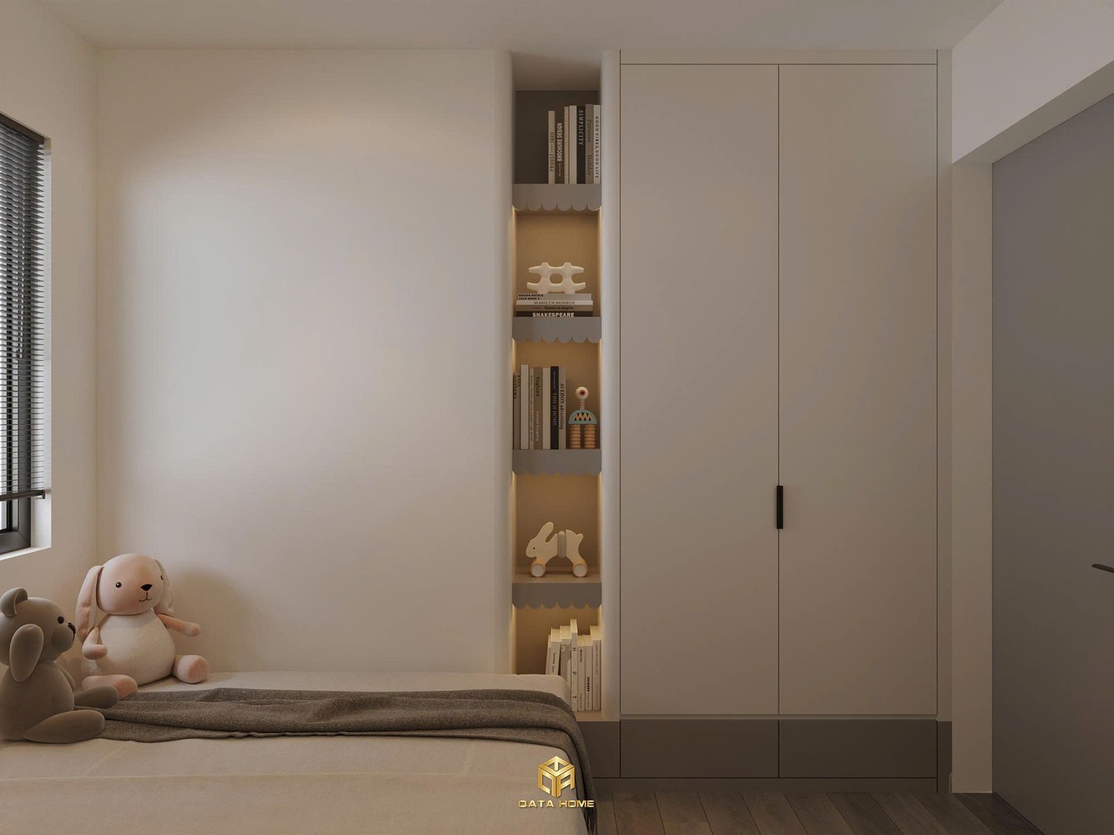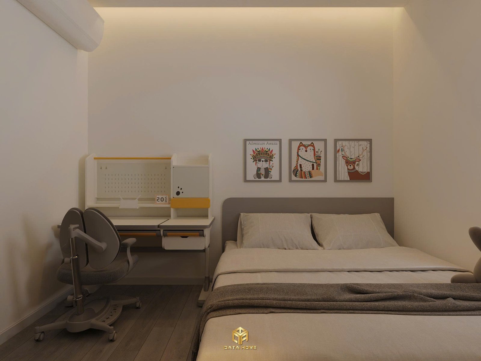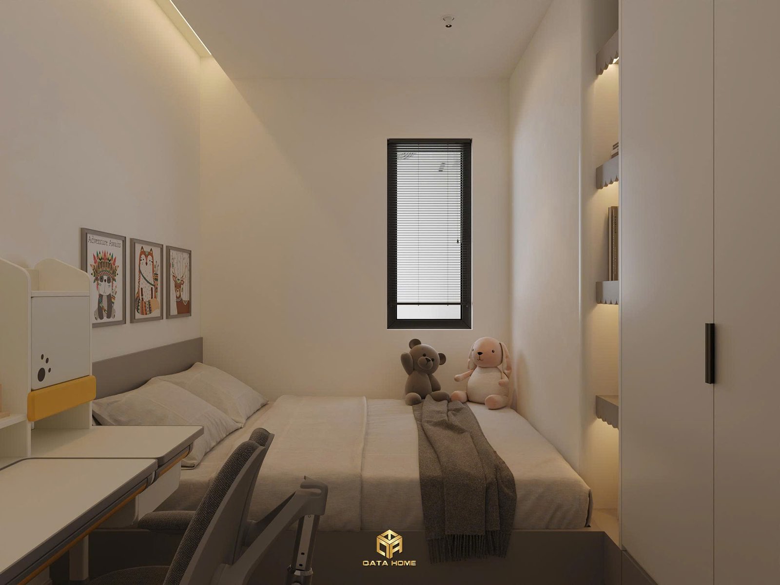 Phòng làm việc riêng biệt được bố trí bàn chữ L kết hợp ghế công thái học, kệ sách treo tường và cửa sổ lớn đón sáng. Đây là không gian lý tưởng để tập trung, hoàn toàn phù hợp với xu hướng thiết kế nội thất chung cư hiện đại dành cho gia đình trẻ.