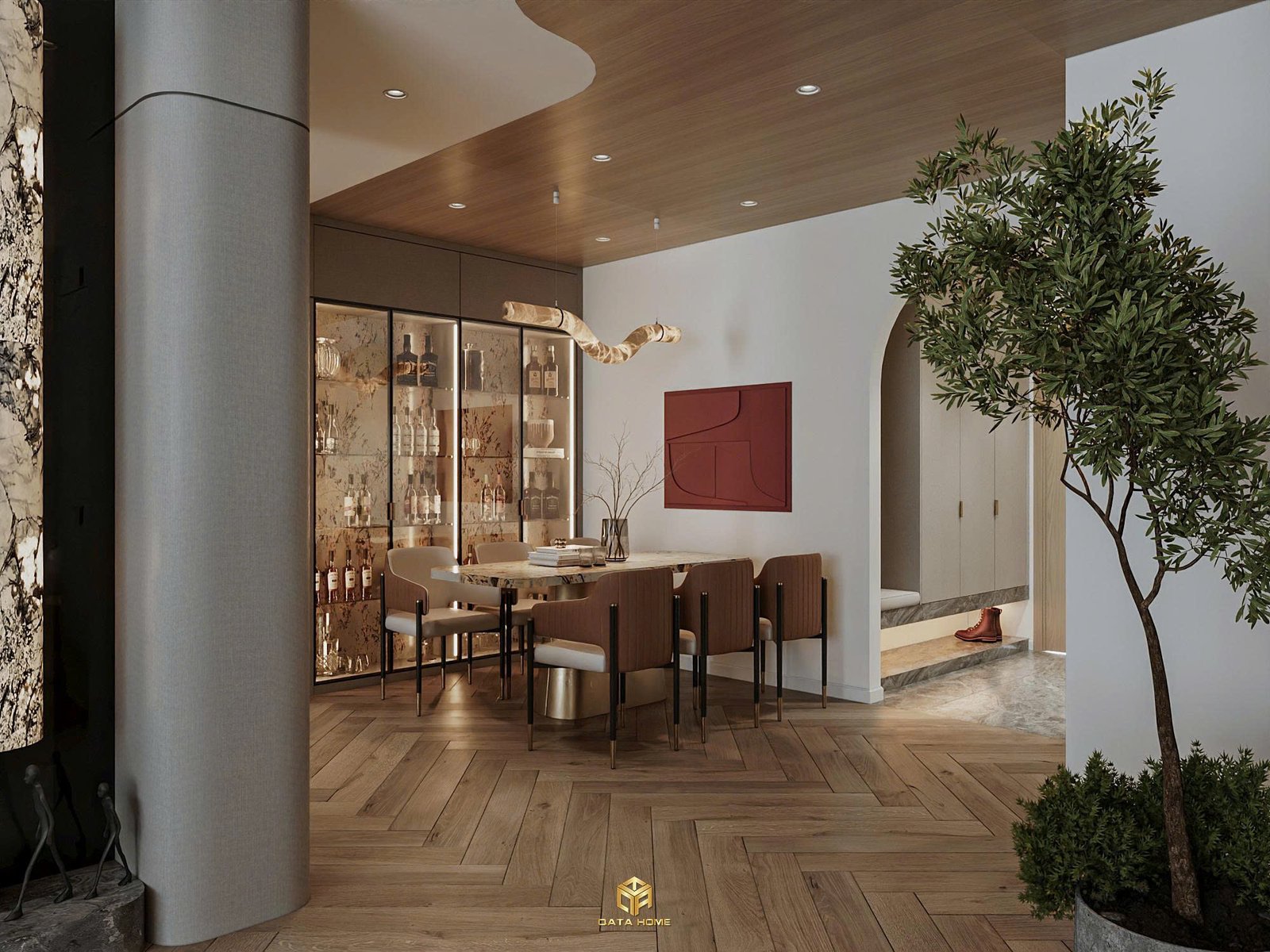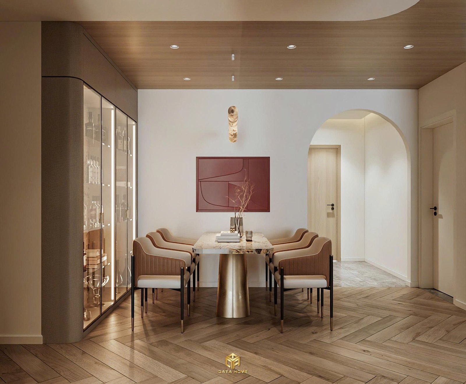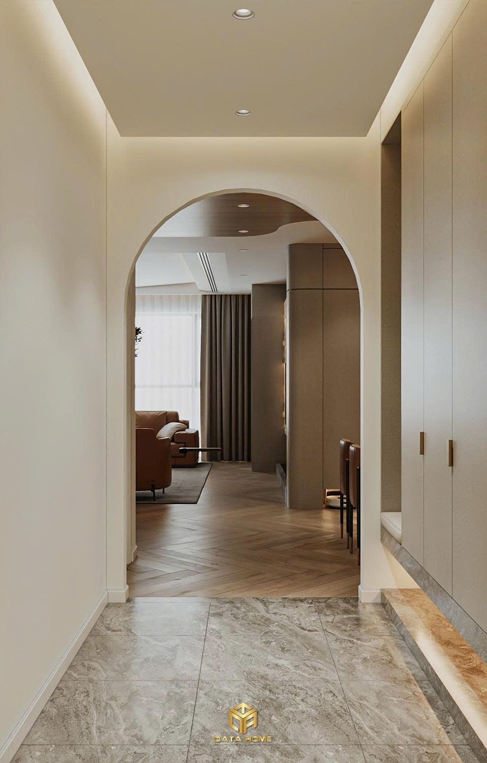 Ngay từ giây phút đầu tiên, bạn sẽ bị cuốn hút bởi hành lang dẫn vào nhà. Sàn marble xám nhẹ nhàng kết hợp ánh sáng âm trần tạo cảm giác rộng rãi và sang trọng. Điểm nhấn chính là vòm cong mềm mại – một chi tiết kiến trúc hiện đại nhưng đầy nghệ thuật. Vòm này không chỉ mở rộng tầm nhìn mà còn dẫn lối tự nhiên vào phòng khách, khiến không gian trở nên liền mạch và cuốn hút lạ thường.