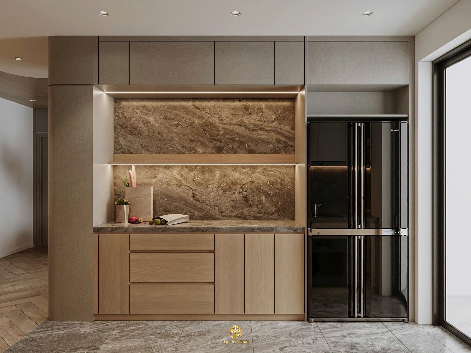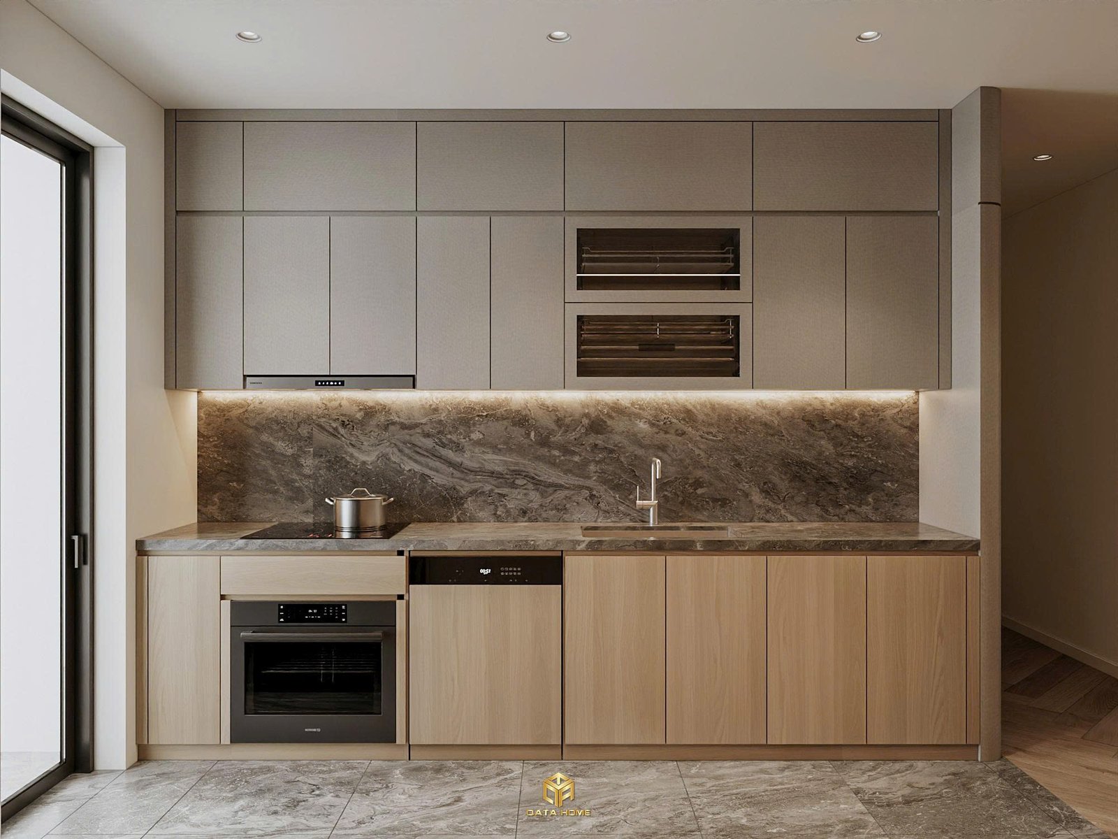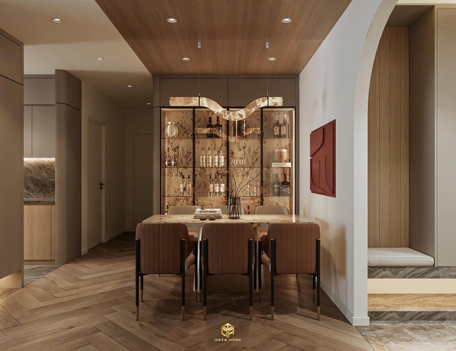 Bếp và phòng ăn là nơi Qata Home thể hiện rõ nhất sự tinh tế. Tủ bếp gỗ tự nhiên tone sáng kết hợp backsplash marble nâu tạo cảm giác ấm áp và sạch sẽ. Bàn đảo bếp được thiết kế đa năng, vừa là nơi nấu nướng vừa là góc trò chuyện thân mật.