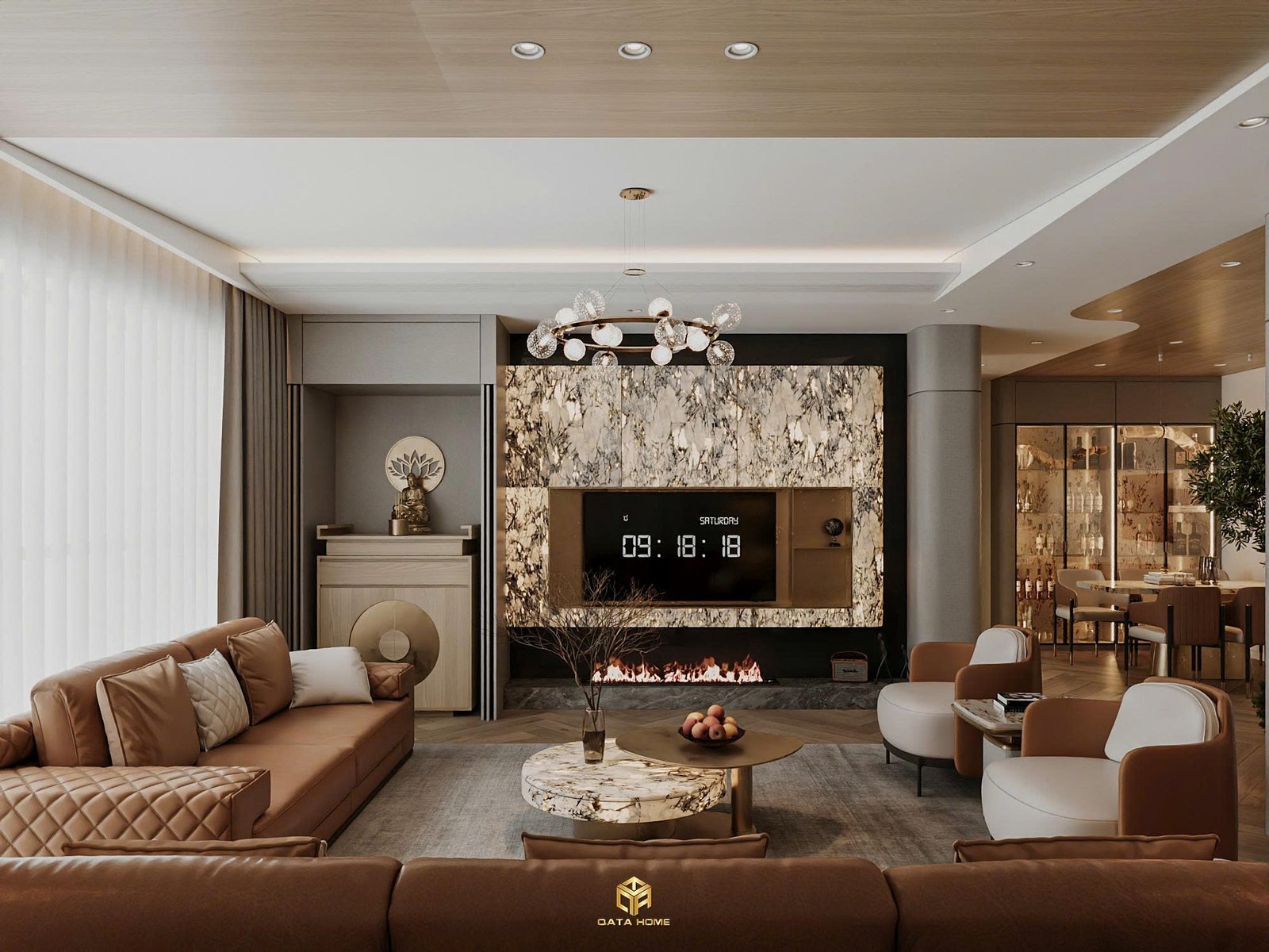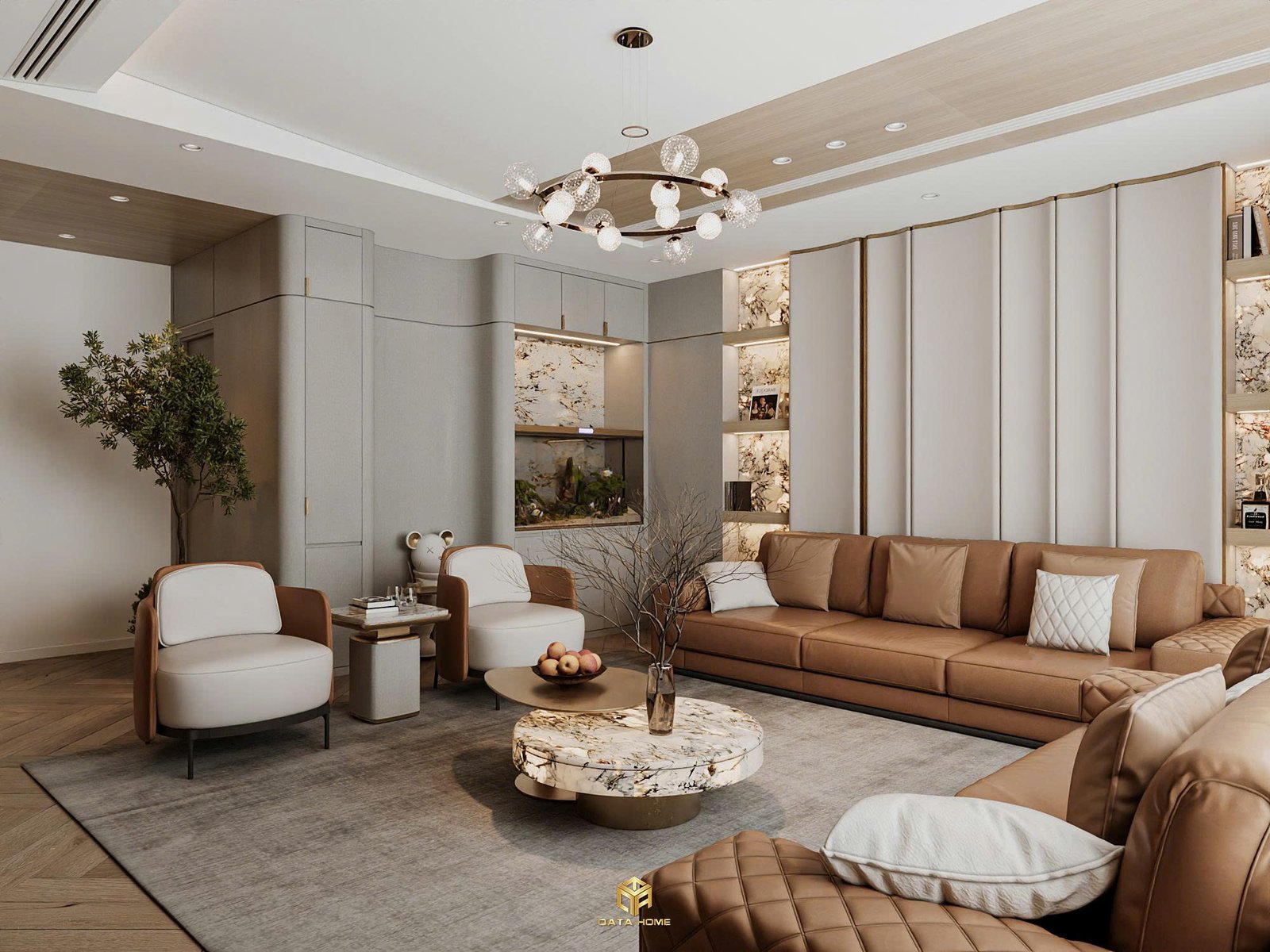 Bước qua vòm cong, phòng khách hiện ra như một bức tranh sống. Bộ sofa da nâu trầm sang trọng kết hợp ghế armchair trắng tinh tế tạo nên sự cân bằng hoàn hảo. Bàn trà marble óng ánh phản chiếu ánh sáng từ chiếc đèn chùm pha lê hiện đại, biến không gian thành điểm nhấn nghệ thuật.