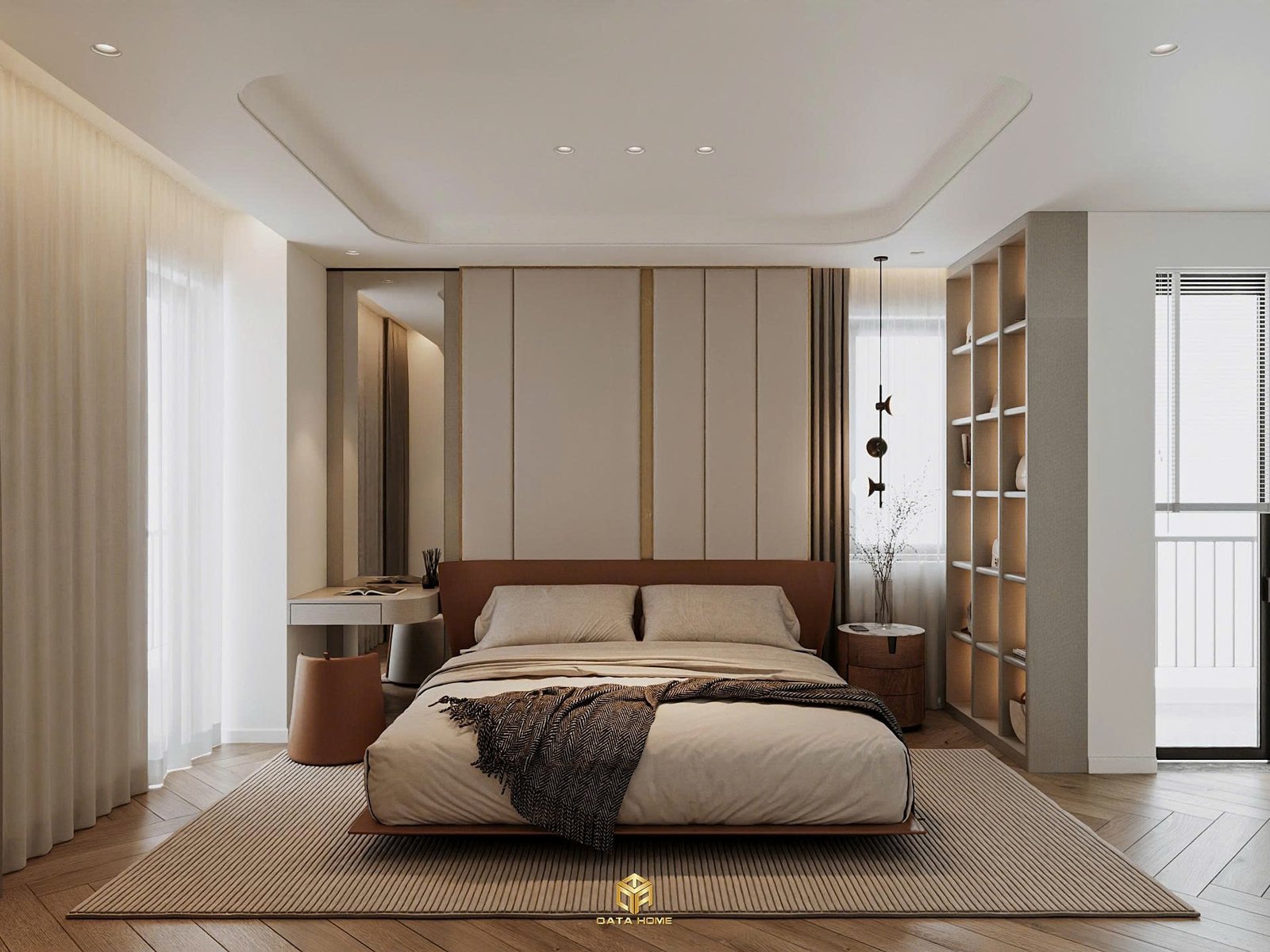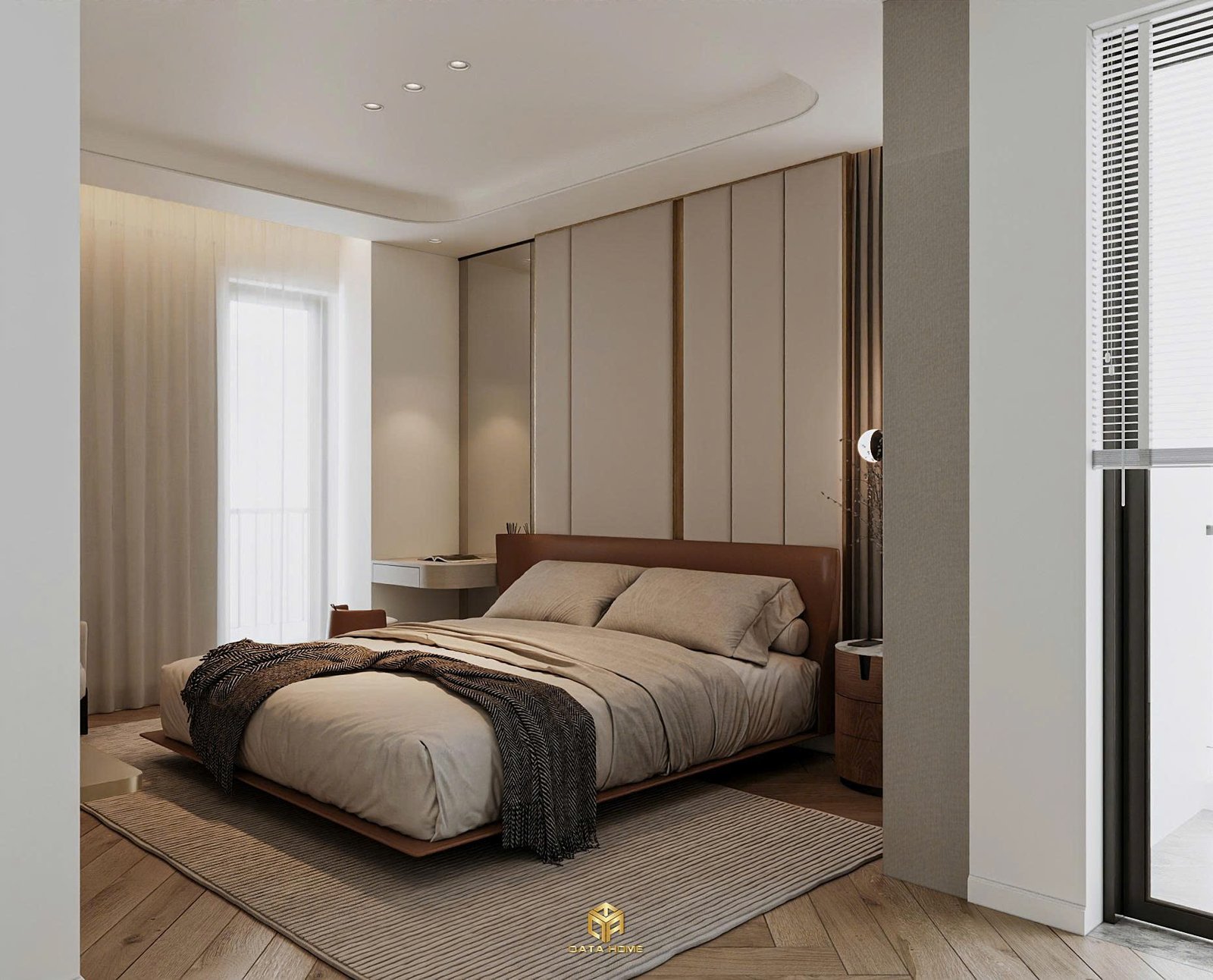 Phòng ngủ master là nơi thư giãn tuyệt đối. Giường lớn với đầu giường da nâu ấm áp, chăn ga tone beige nhẹ nhàng, kết hợp kệ đầu giường gỗ tự nhiên. Tủ quần áo âm tường liền mạch với hệ thống chiếu sáng gián tiếp tạo cảm giác sang trọng và gọn gàng.