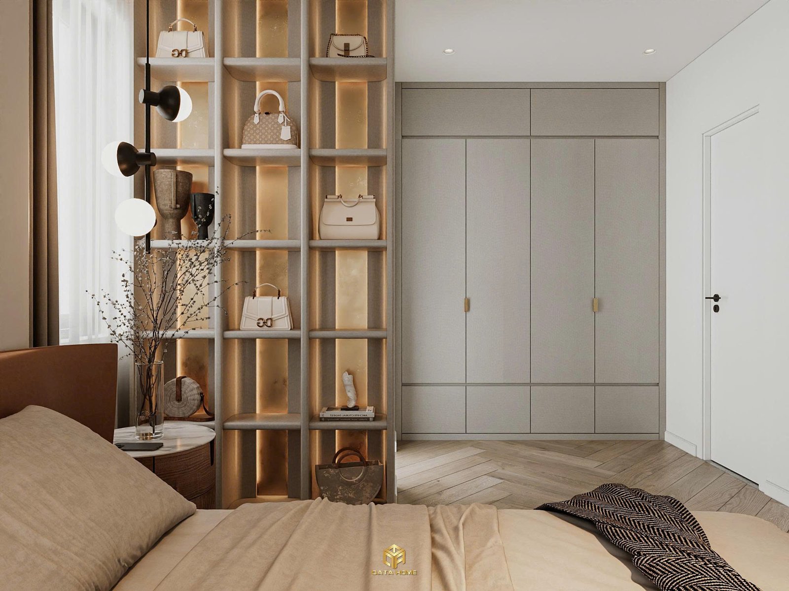 Đặc biệt, khu vực thay đồ và tủ kính trưng bày túi xách được thiết kế như một phòng thay đồ mini cao cấp. Ánh sáng vàng ấm lan tỏa khắp không gian, khiến bạn chỉ muốn nằm dài và tận hưởng từng giây phút.