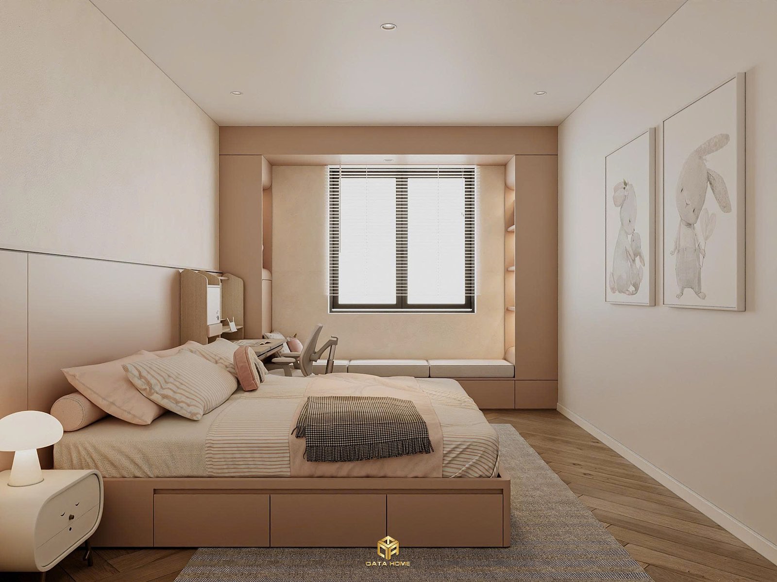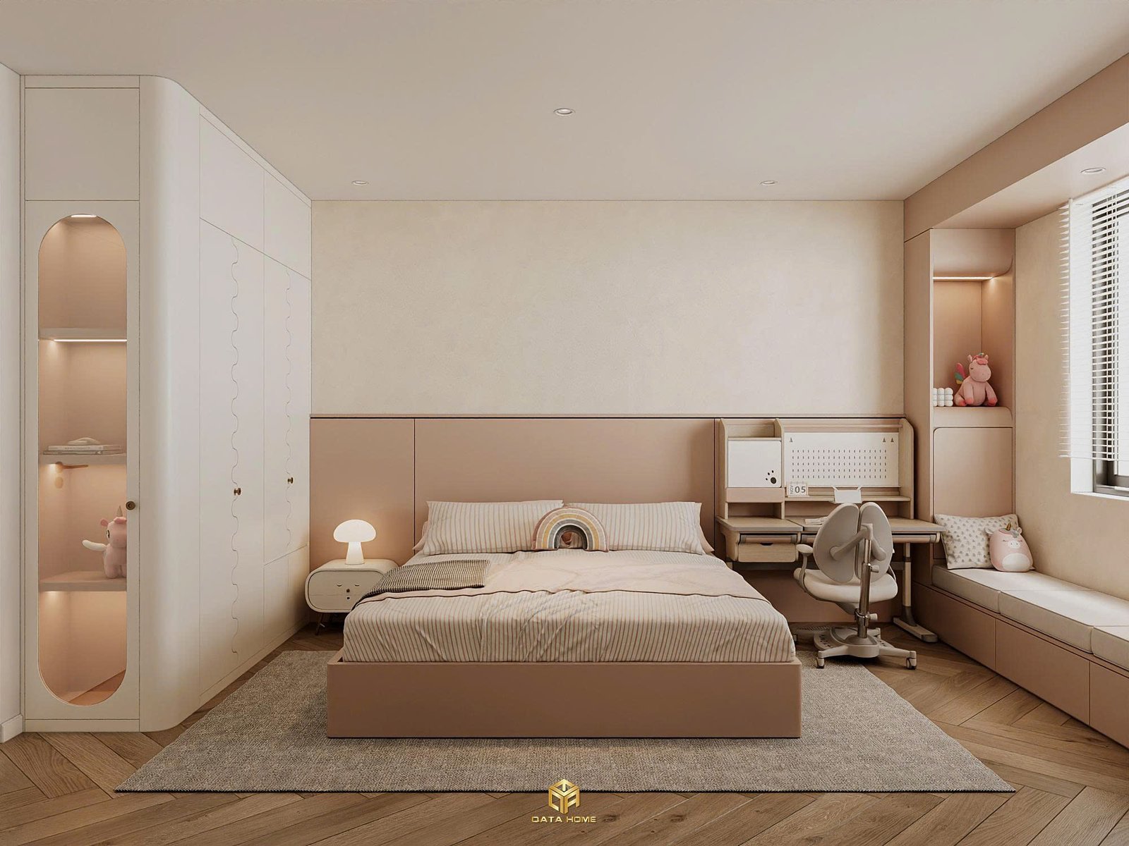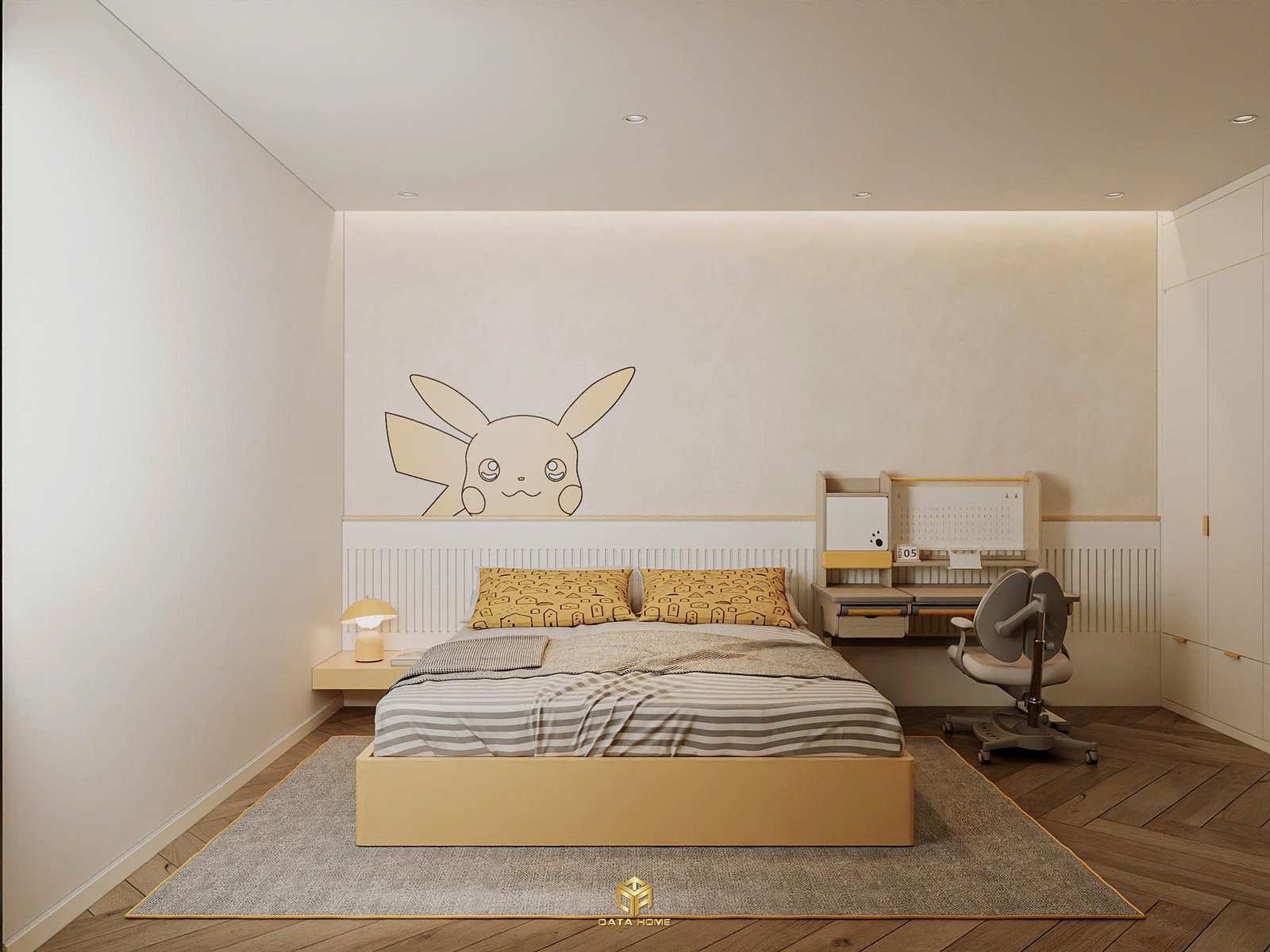 Qata Home còn dành sự chăm chút đặc biệt cho phòng trẻ. Tone màu pastel nhẹ nhàng, giường liền tủ lưu trữ thông minh, bàn học ergonomics và khu vực chơi riêng. Chiếc tường Pikachu hoặc kệ trưng bày gấu bông unicorn đều được thiết kế để khơi dậy trí tưởng tượng mà vẫn giữ sự gọn gàng và hiện đại.