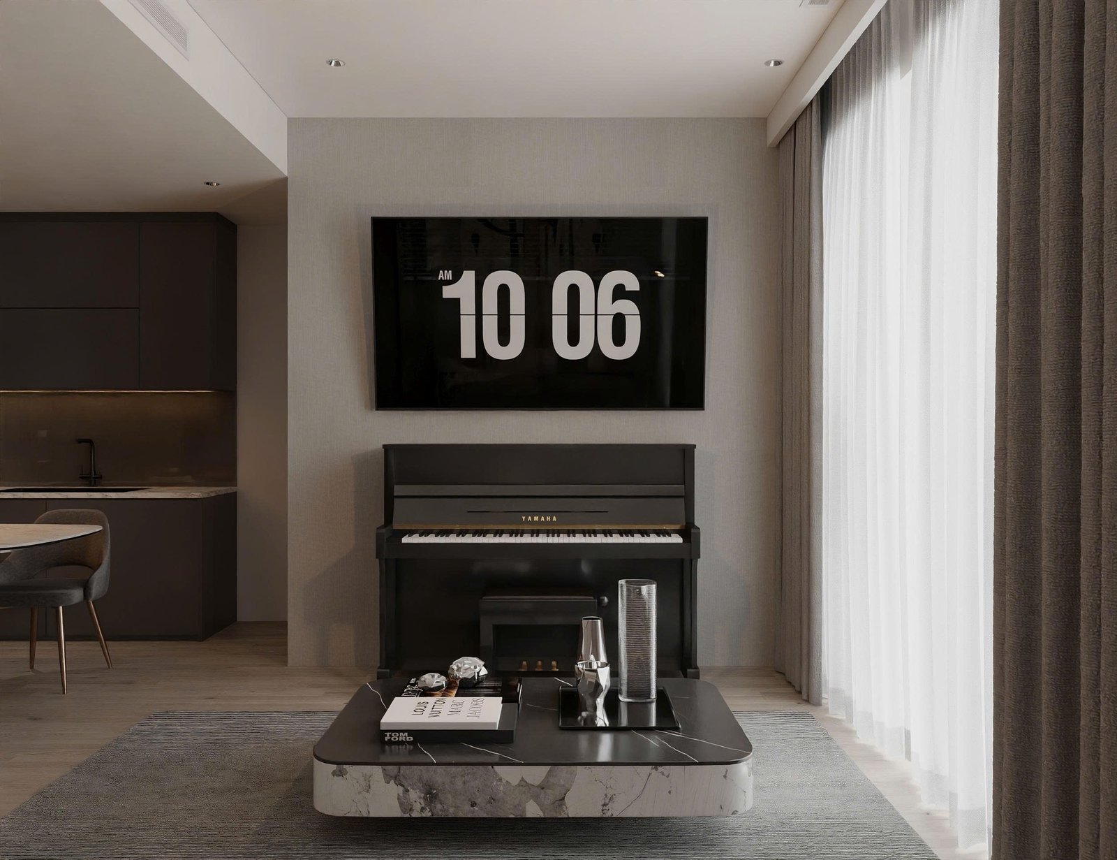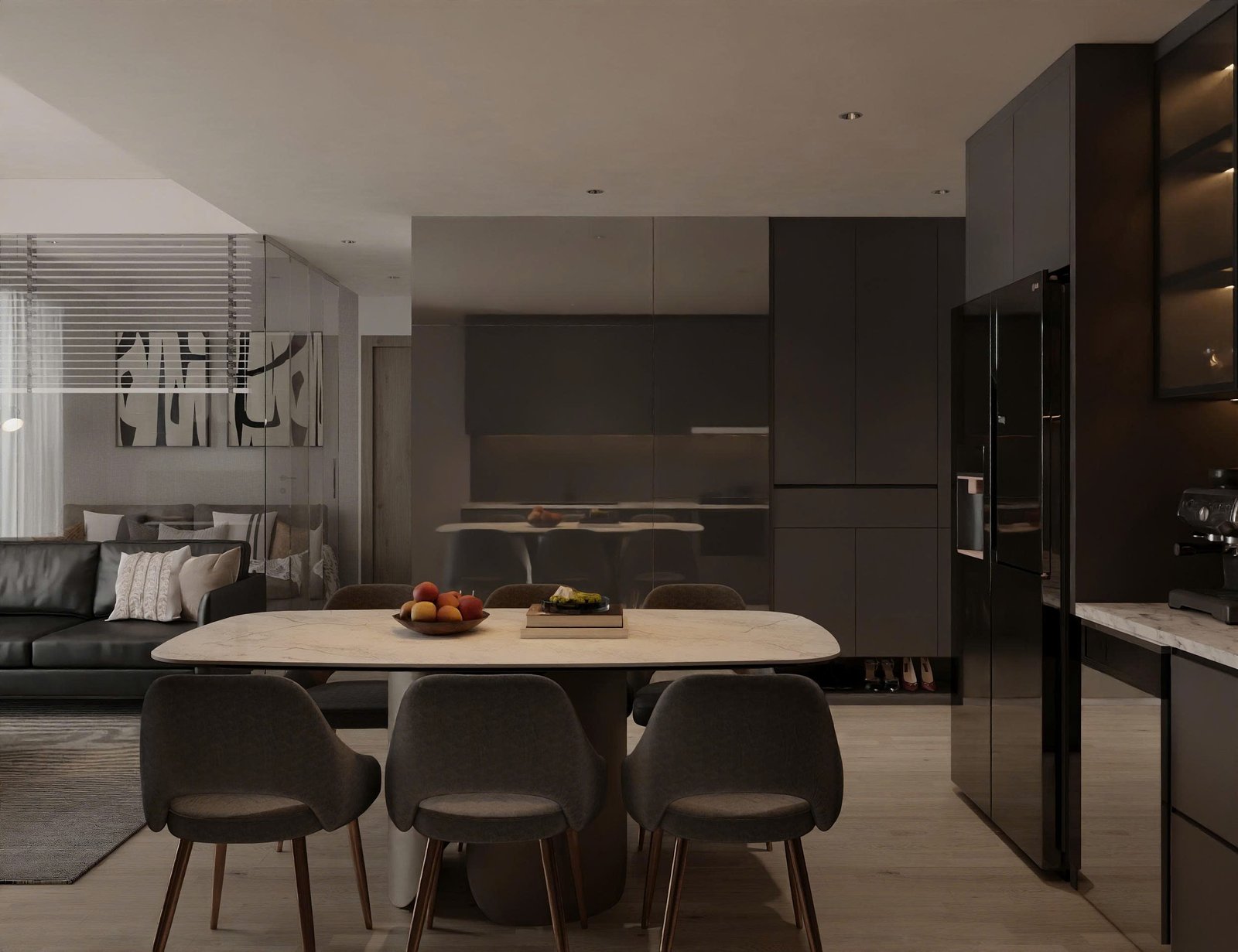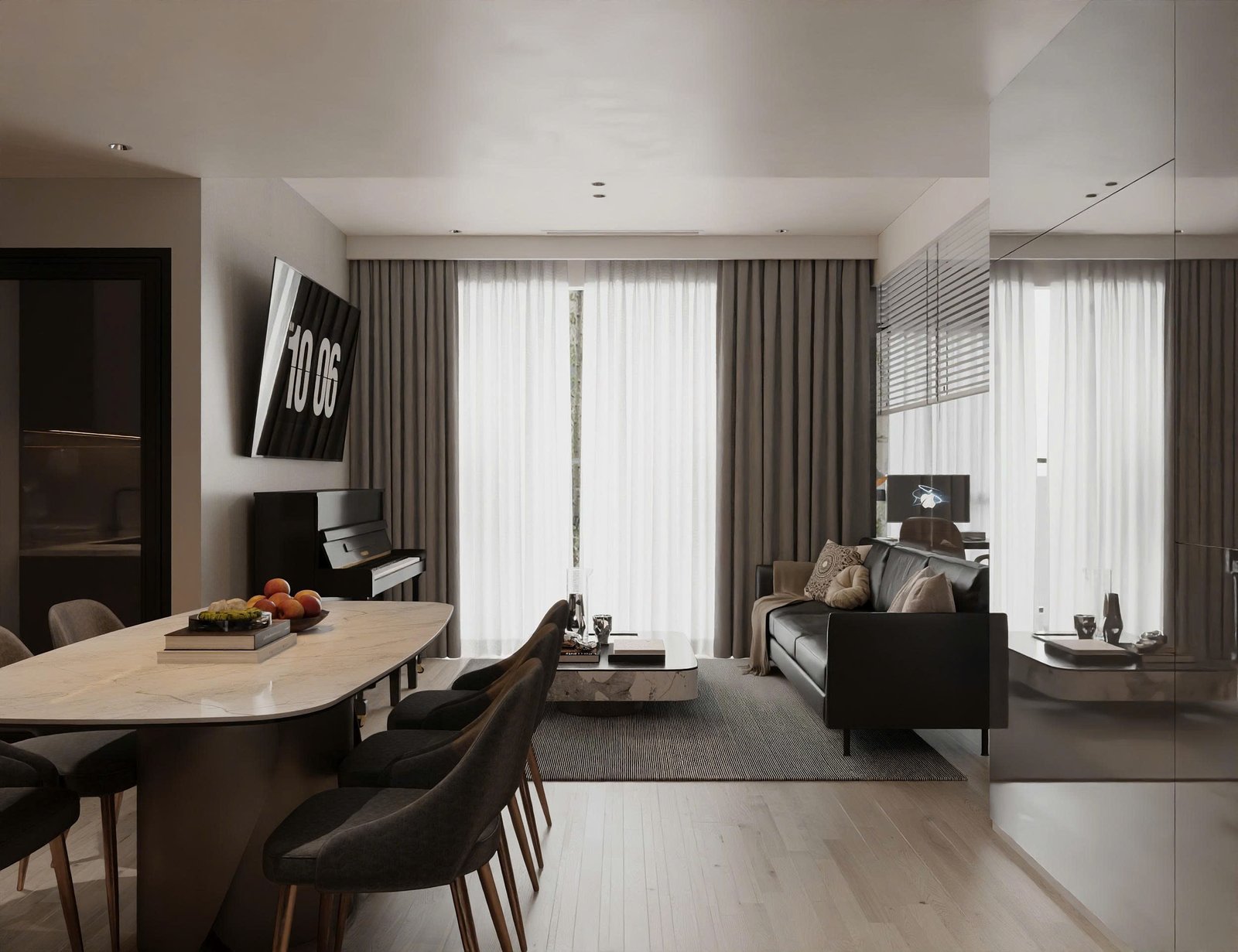 Nhìn tổng thể, căn hộ mang hơi hướng minimalism hiện đại, nhưng không lạnh lẽo. Sự ấm áp được tạo nên từ chất liệu gỗ, ánh sáng tự nhiên và bảng màu trung tính như xám – be – nâu.