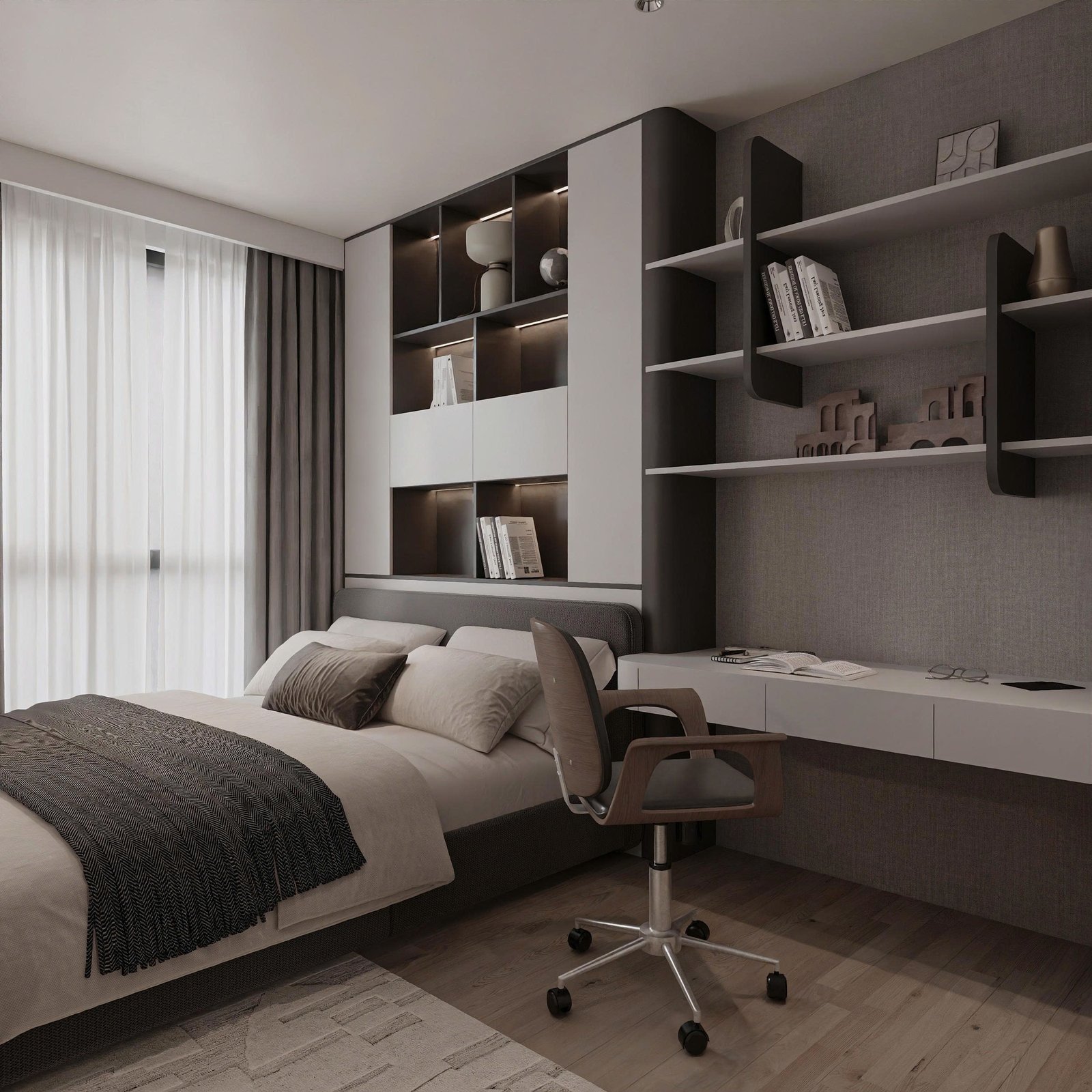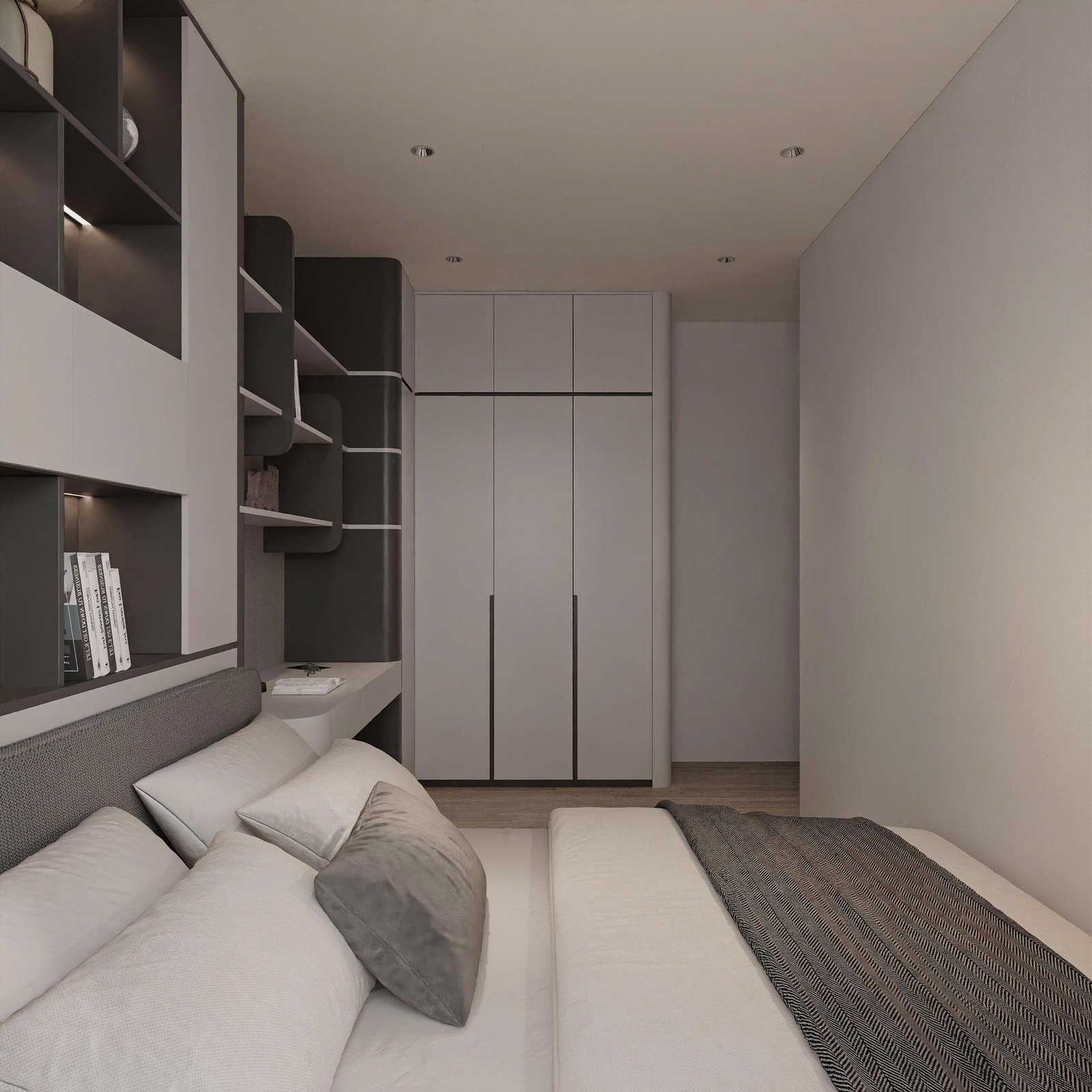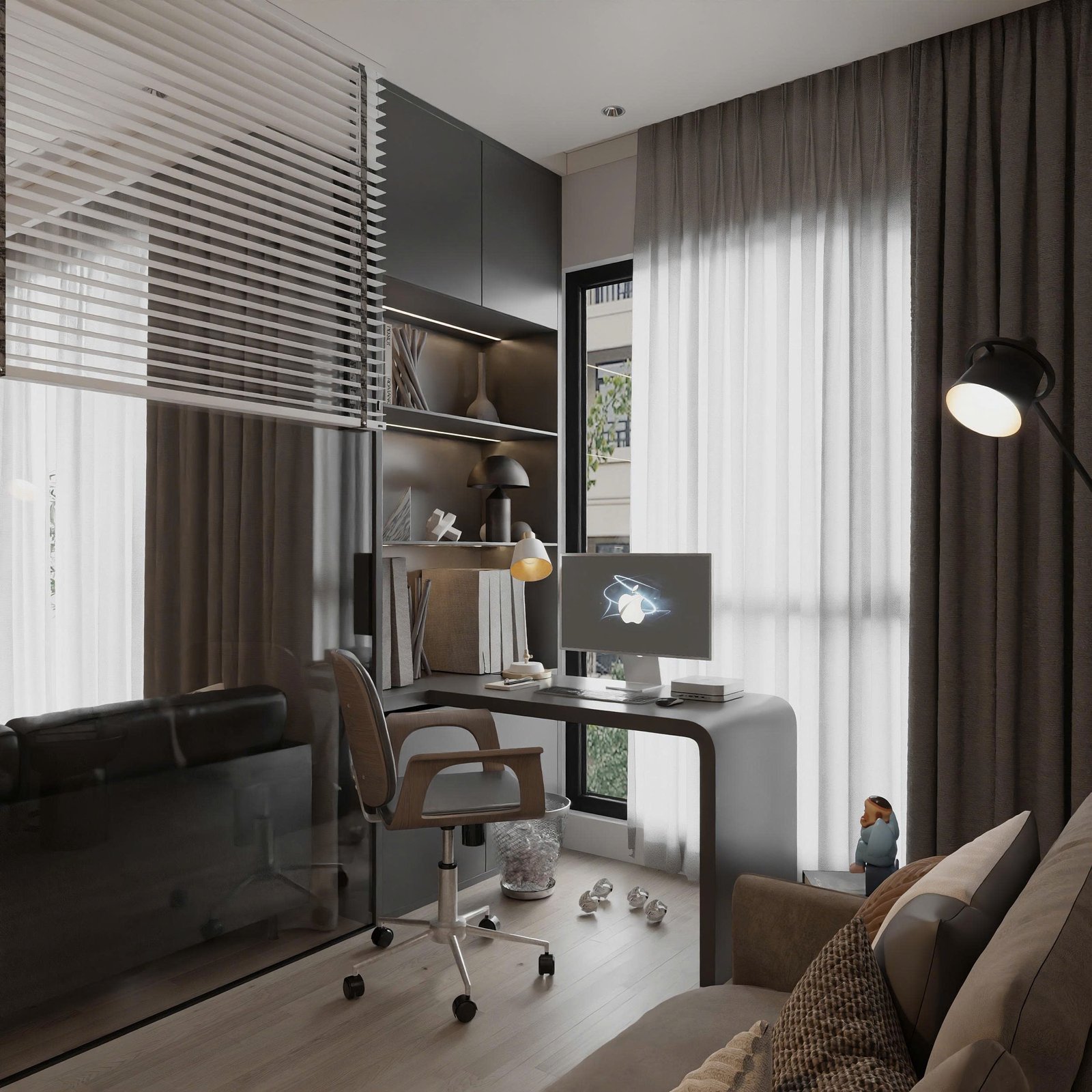 Nhìn tổng thể, căn hộ mang hơi hướng minimalism hiện đại, nhưng không lạnh lẽo. Sự ấm áp được tạo nên từ chất liệu gỗ, ánh sáng tự nhiên và bảng màu trung tính như xám – be – nâu.