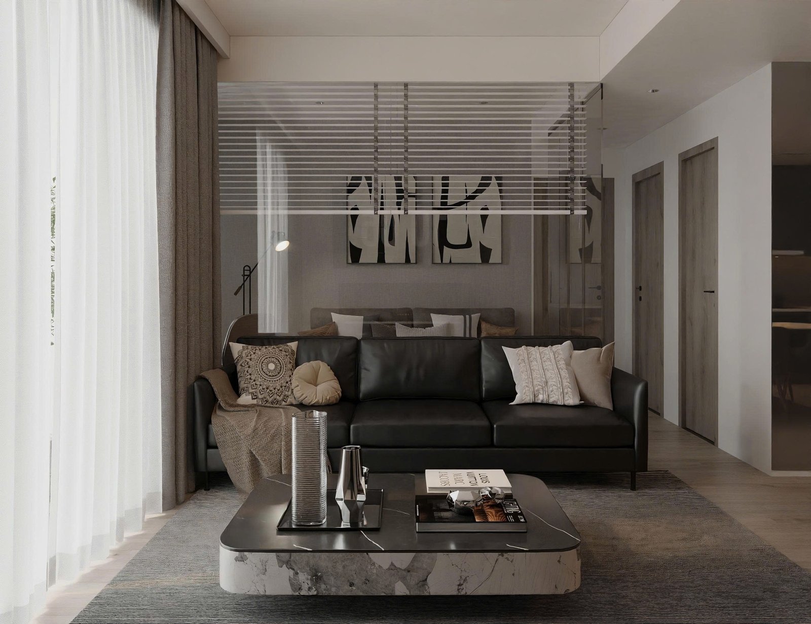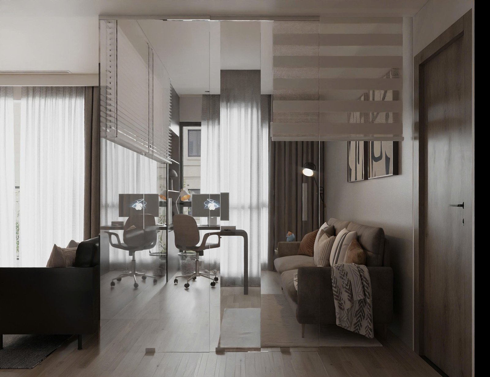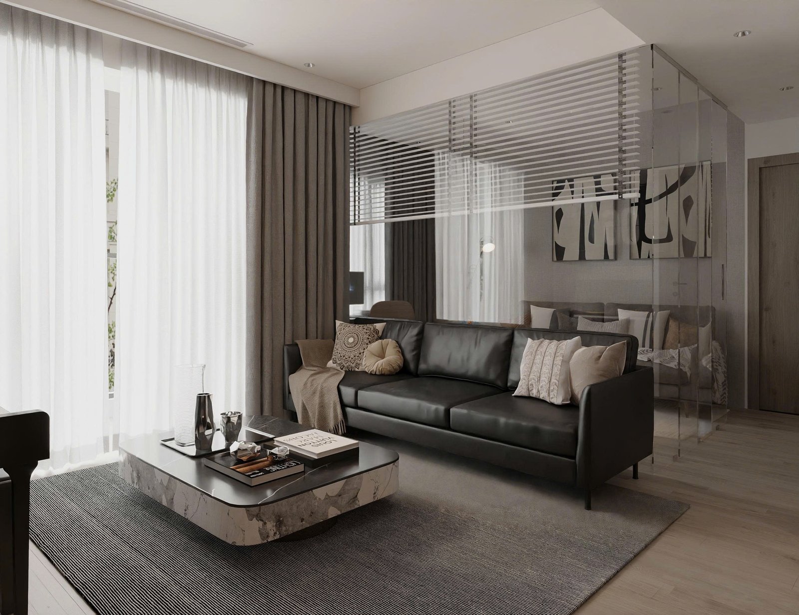 Những vách kính kết hợp rèm sáo giúp phân chia không gian một cách linh hoạt mà vẫn đảm bảo sự xuyên suốt thị giác – một giải pháp thông minh cho các căn hộ diện tích vừa phải.