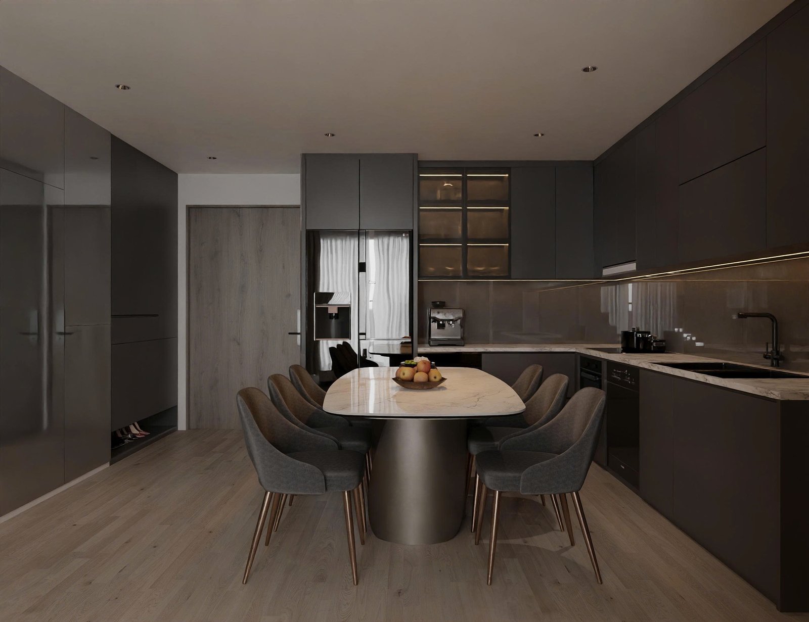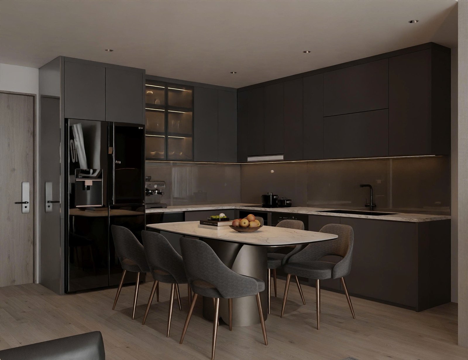Bếp được thiết kế theo dạng chữ L với hệ tủ kịch trần, tối ưu lưu trữ mà vẫn gọn gàng. Tông màu tối của tủ bếp kết hợp mặt đá sáng tạo nên sự tương phản tinh tế.