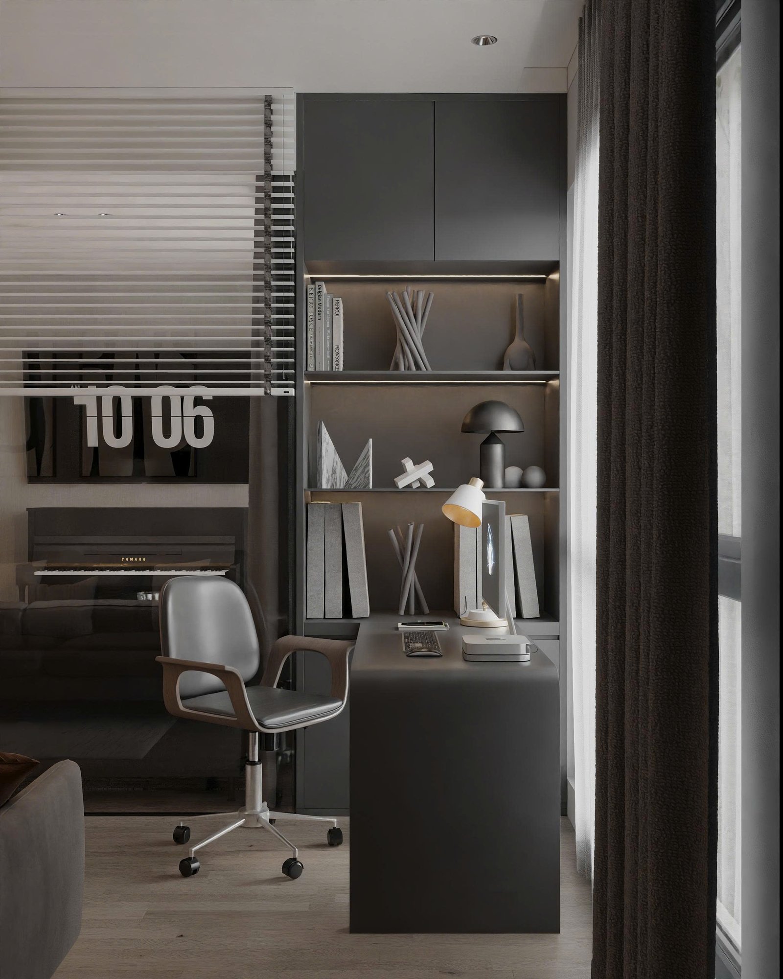 Một trong những chi tiết thú vị của căn hộ là góc làm việc được bố trí phía sau vách kính.