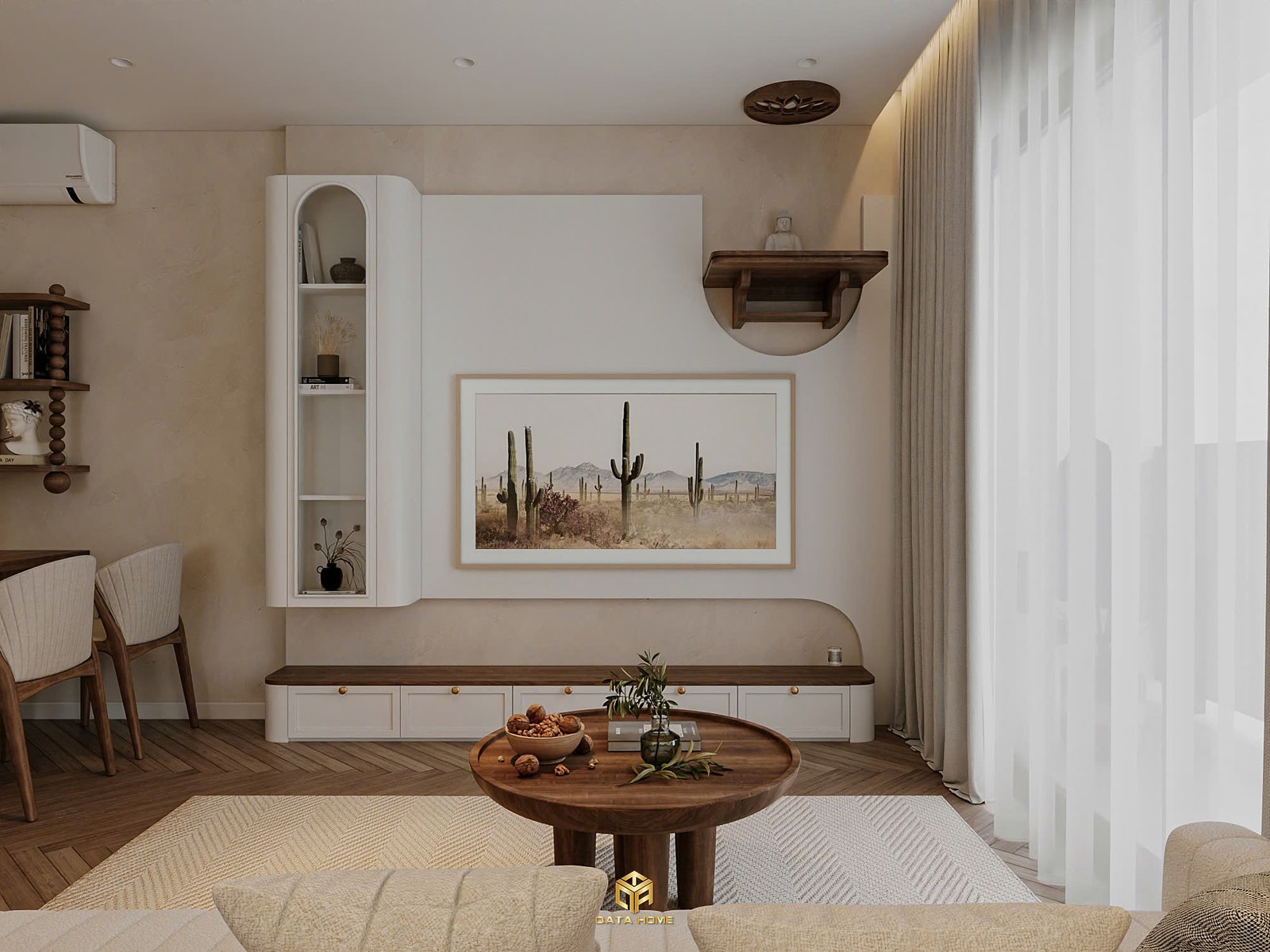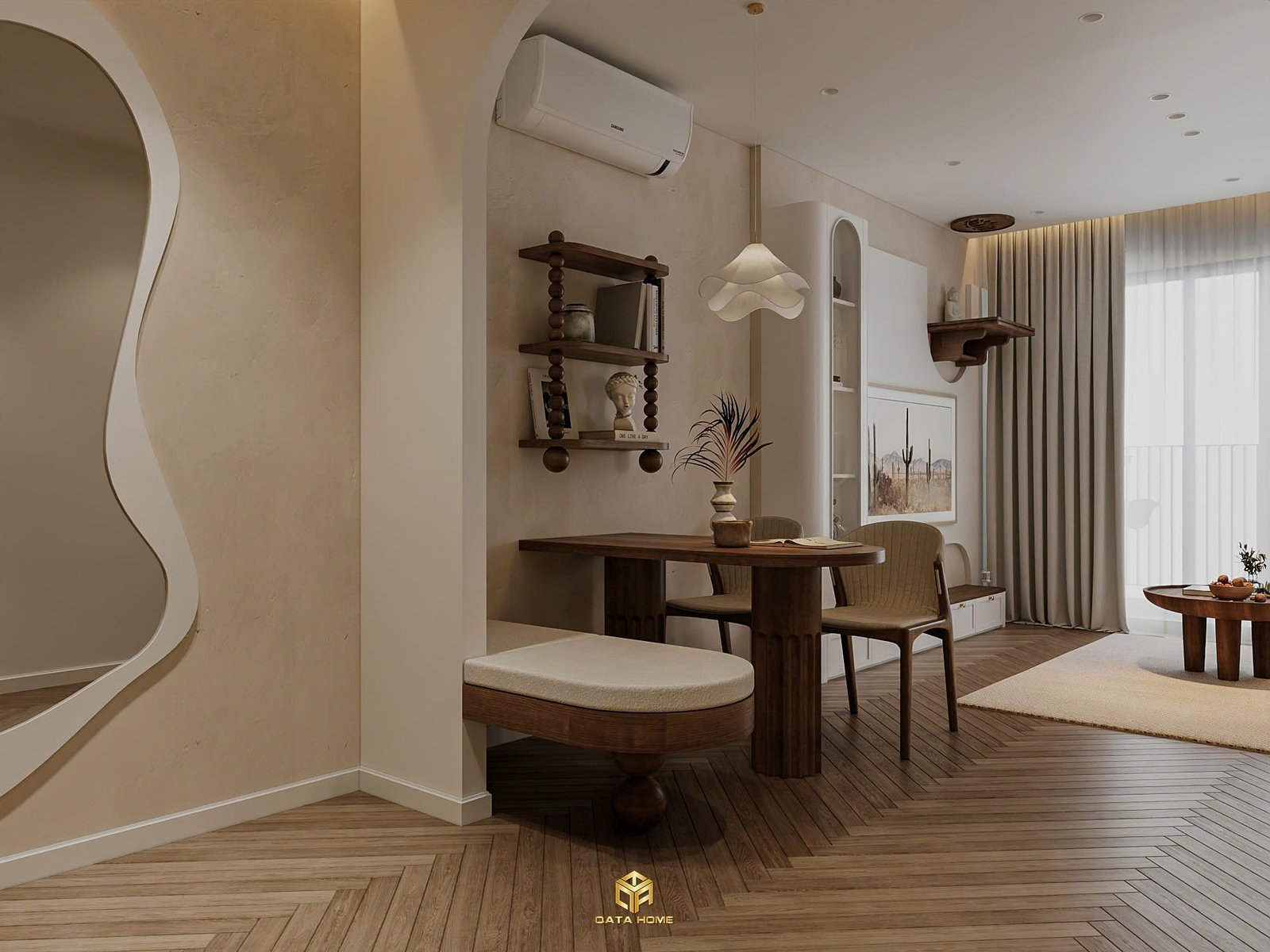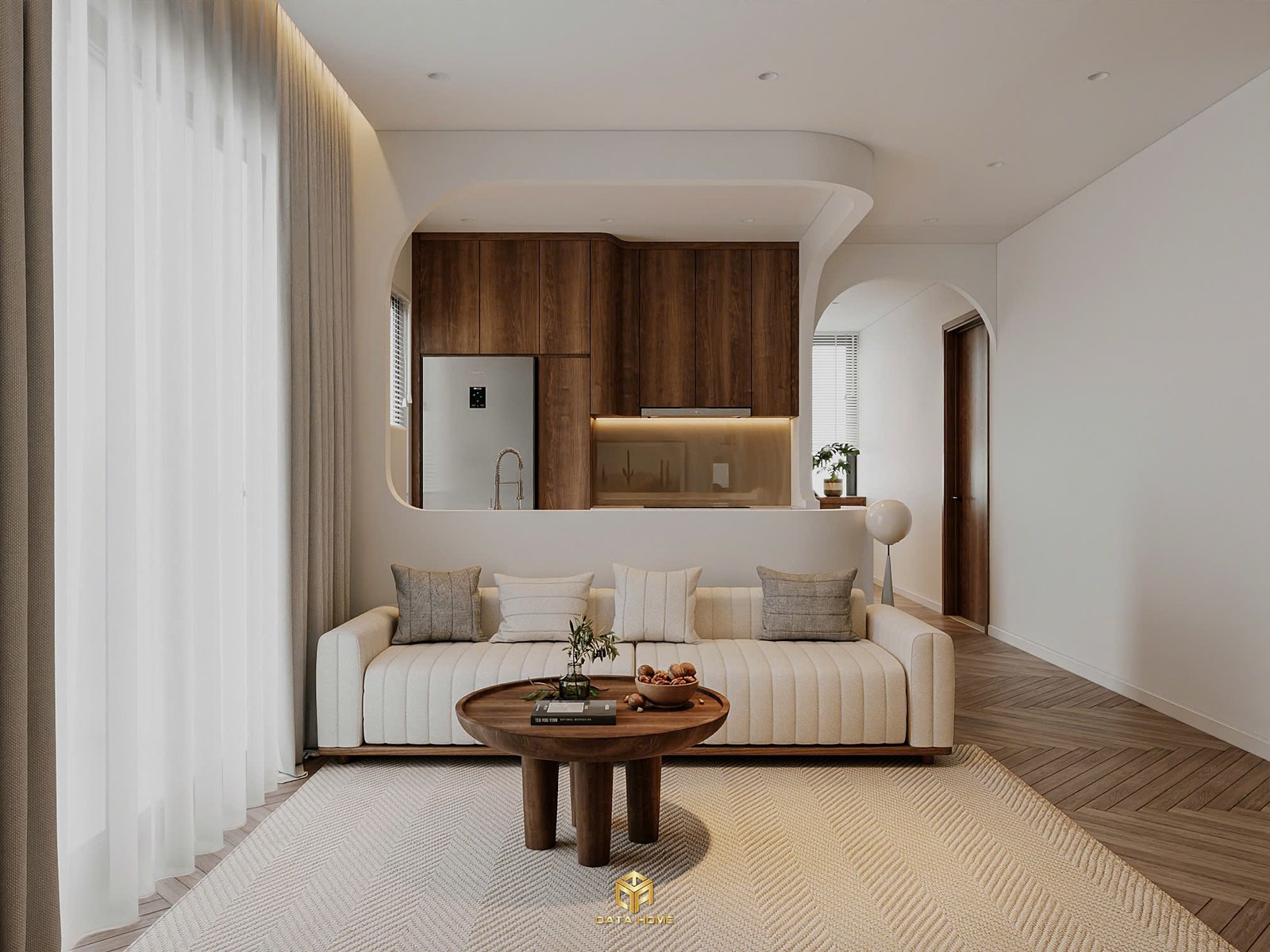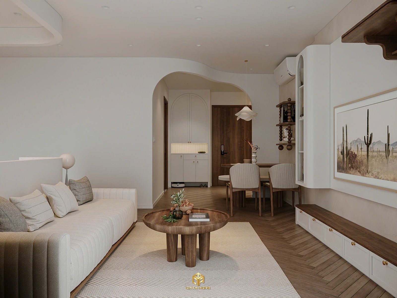 Toàn bộ căn hộ sử dụng gam màu be – trắng – nâu gỗ làm chủ đạo, tạo nên cảm giác nhẹ nhàng, thư giãn. Đường cong mềm mại xuất hiện xuyên suốt từ vòm cửa, kệ trang trí đến các chi tiết nội thất, giúp không gian trở nên uyển chuyển và gần gũi hơn.