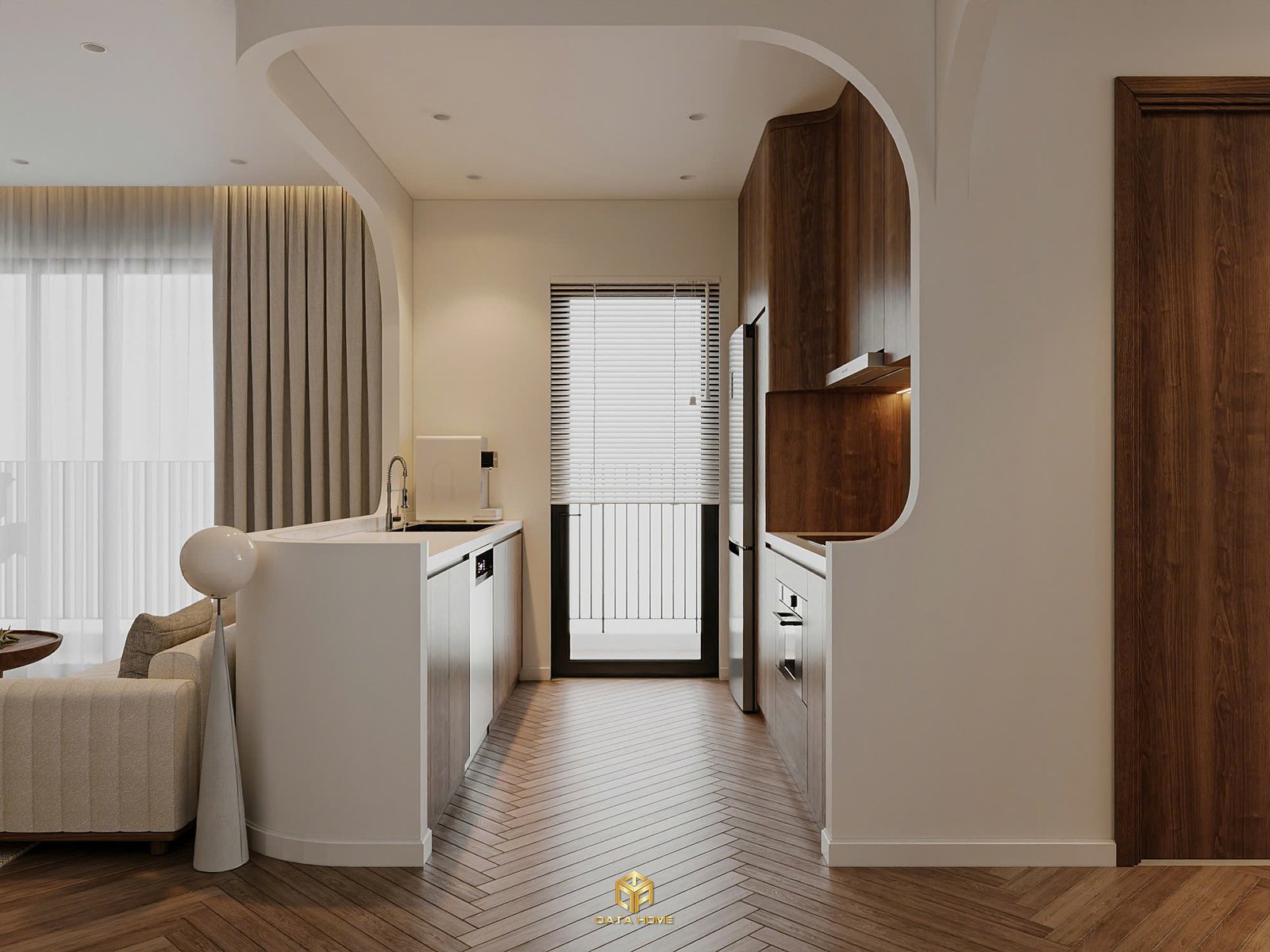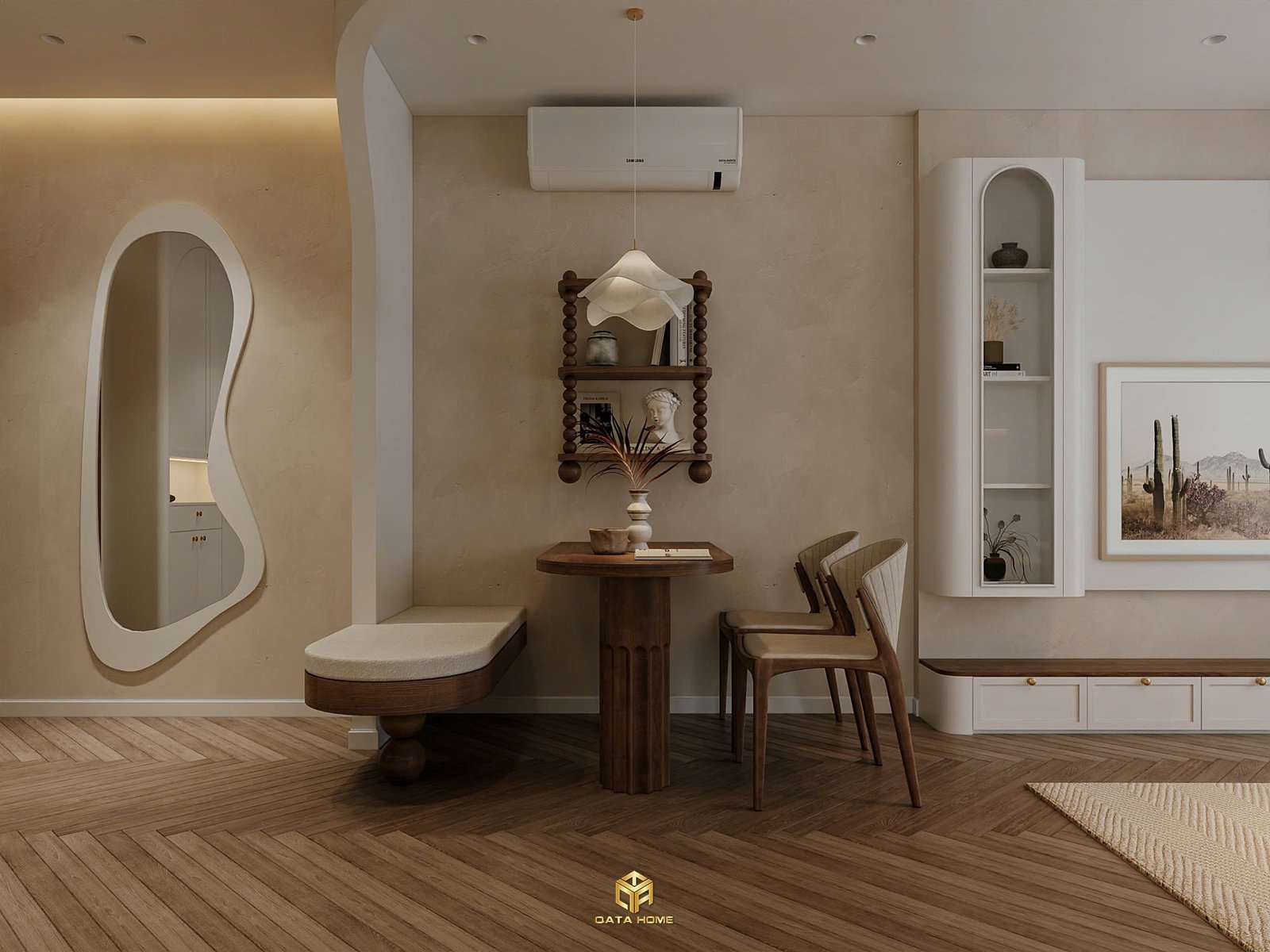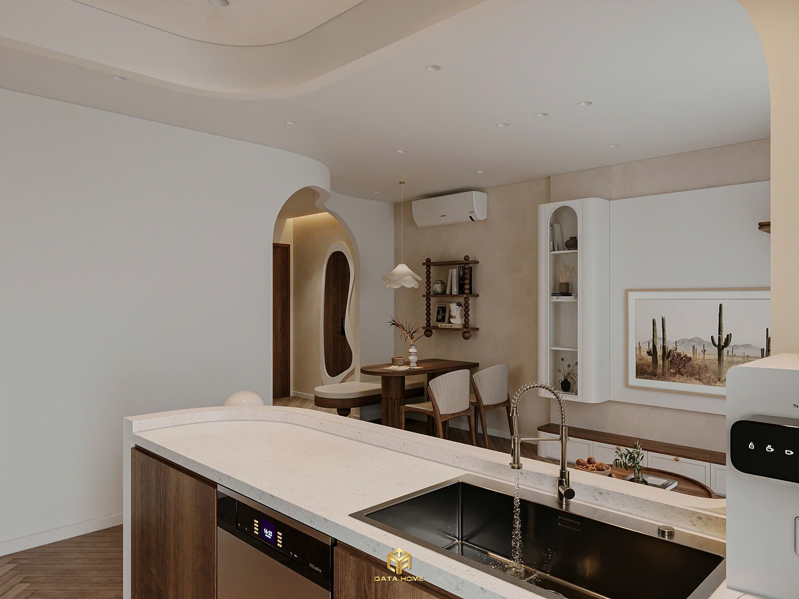 Toàn bộ căn hộ sử dụng gam màu be – trắng – nâu gỗ làm chủ đạo, tạo nên cảm giác nhẹ nhàng, thư giãn. Đường cong mềm mại xuất hiện xuyên suốt từ vòm cửa, kệ trang trí đến các chi tiết nội thất, giúp không gian trở nên uyển chuyển và gần gũi hơn.