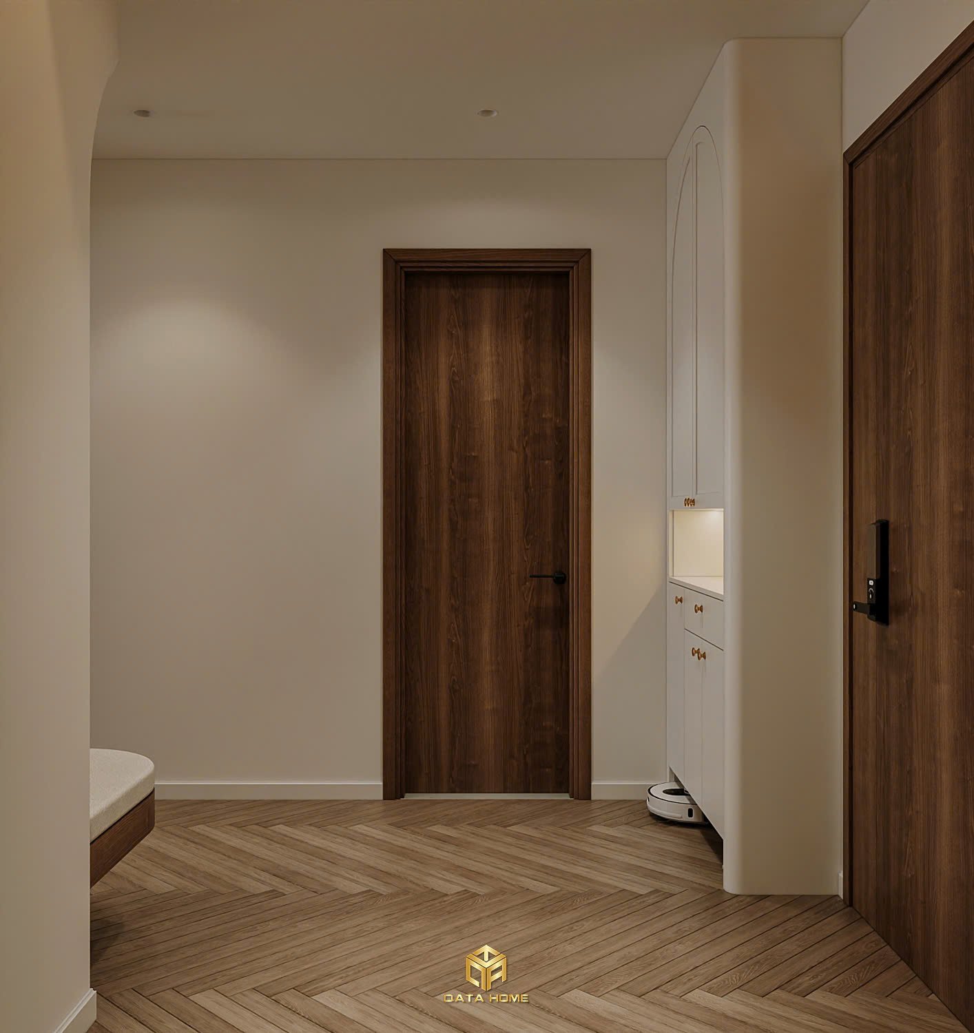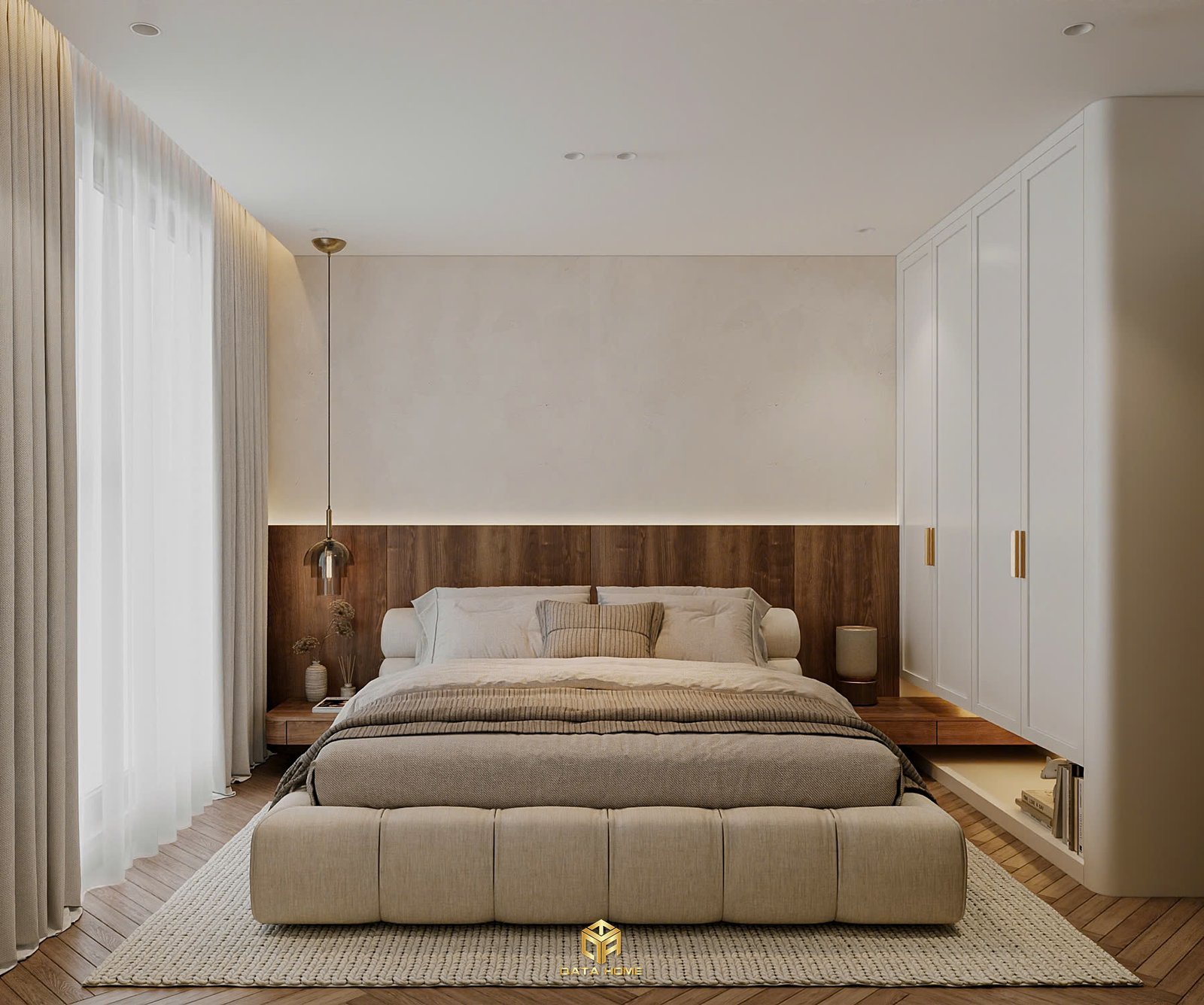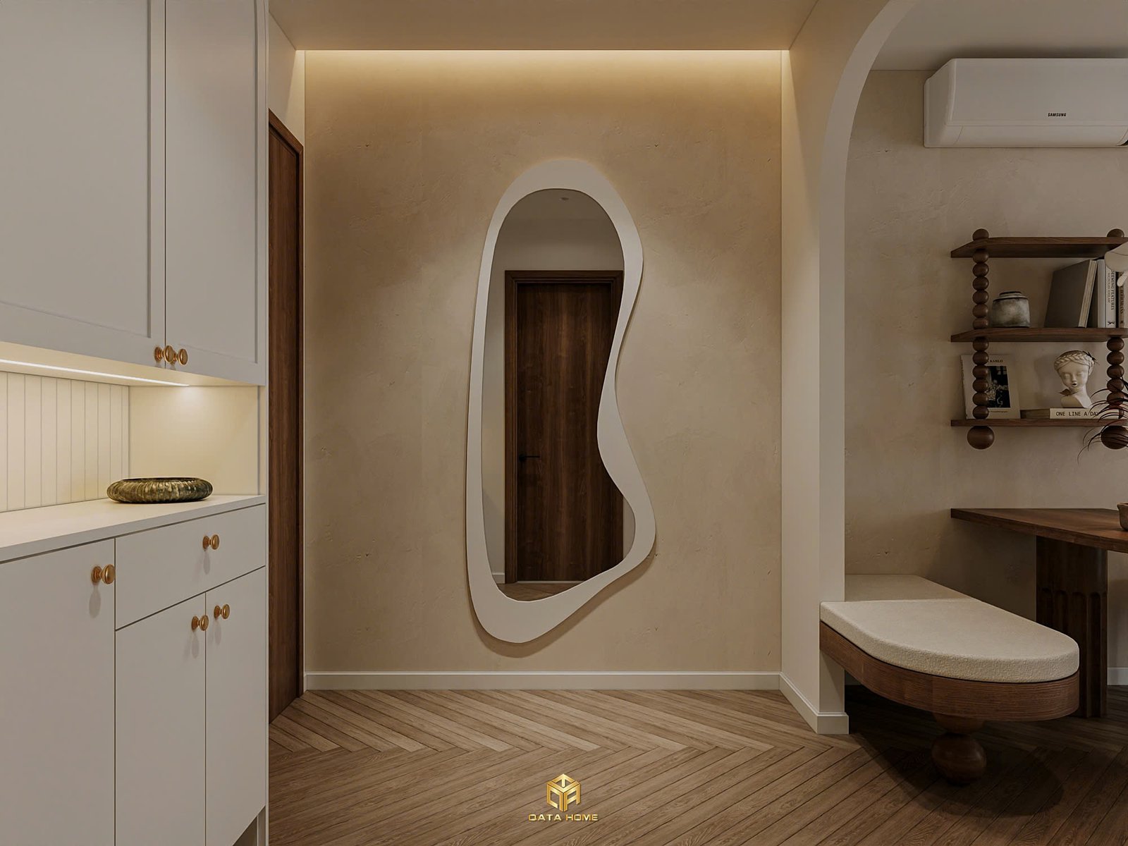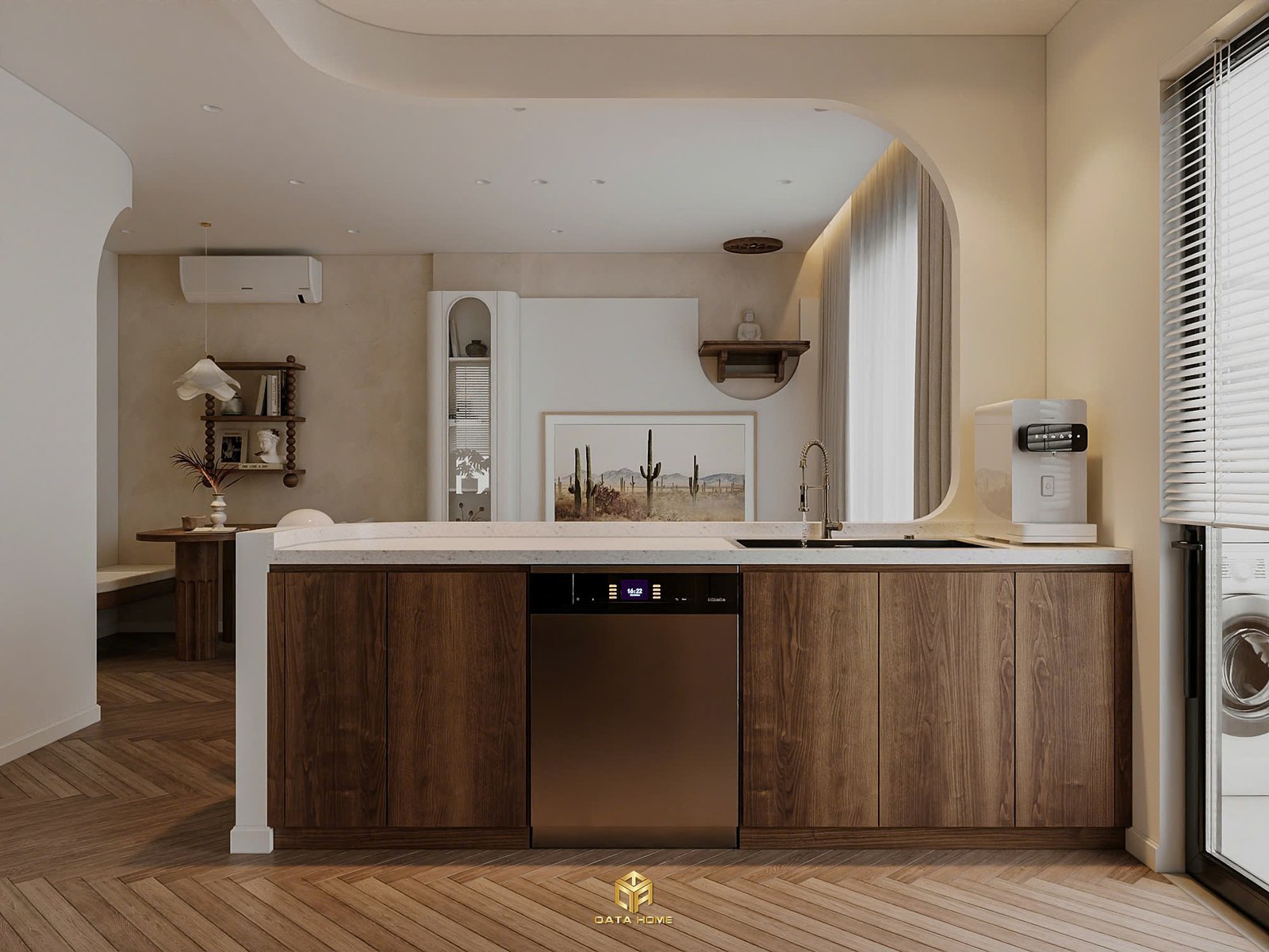 Toàn bộ căn hộ sử dụng gam màu be – trắng – nâu gỗ làm chủ đạo, tạo nên cảm giác nhẹ nhàng, thư giãn. Đường cong mềm mại xuất hiện xuyên suốt từ vòm cửa, kệ trang trí đến các chi tiết nội thất, giúp không gian trở nên uyển chuyển và gần gũi hơn.