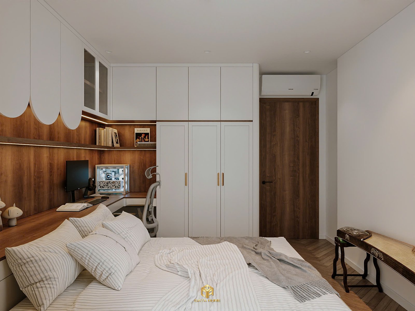 Hệ tủ âm tường kết hợp bàn làm việc giúp tối ưu diện tích mà vẫn đảm bảo tính thẩm mỹ. Tất cả tạo nên một không gian nghỉ ngơi lý tưởng – nơi con người có thể tạm rời xa những ồn ào bên ngoài.