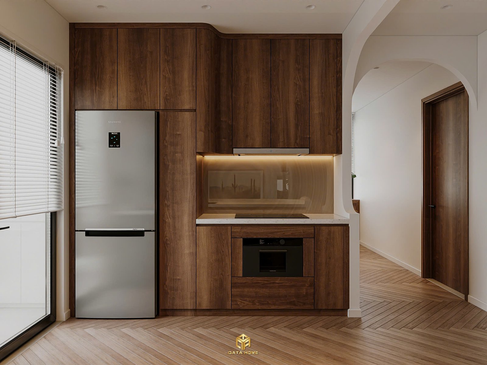 Khu bếp sử dụng hệ tủ gỗ nâu đậm, kết hợp mặt đá sáng màu tạo nên sự tương phản nhẹ nhàng nhưng tinh tế. Các thiết bị được bố trí gọn gàng, tối ưu hóa diện tích sử dụng.