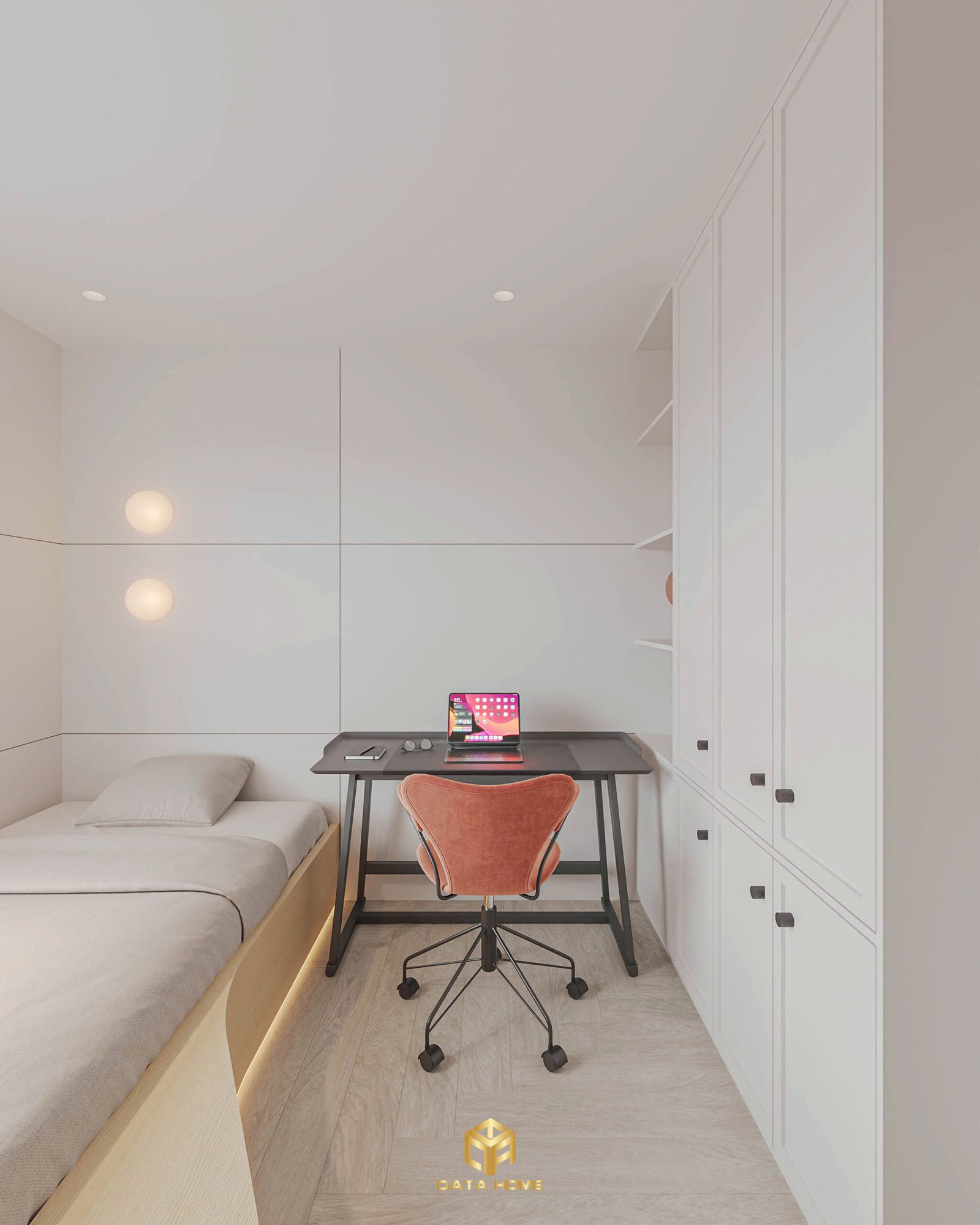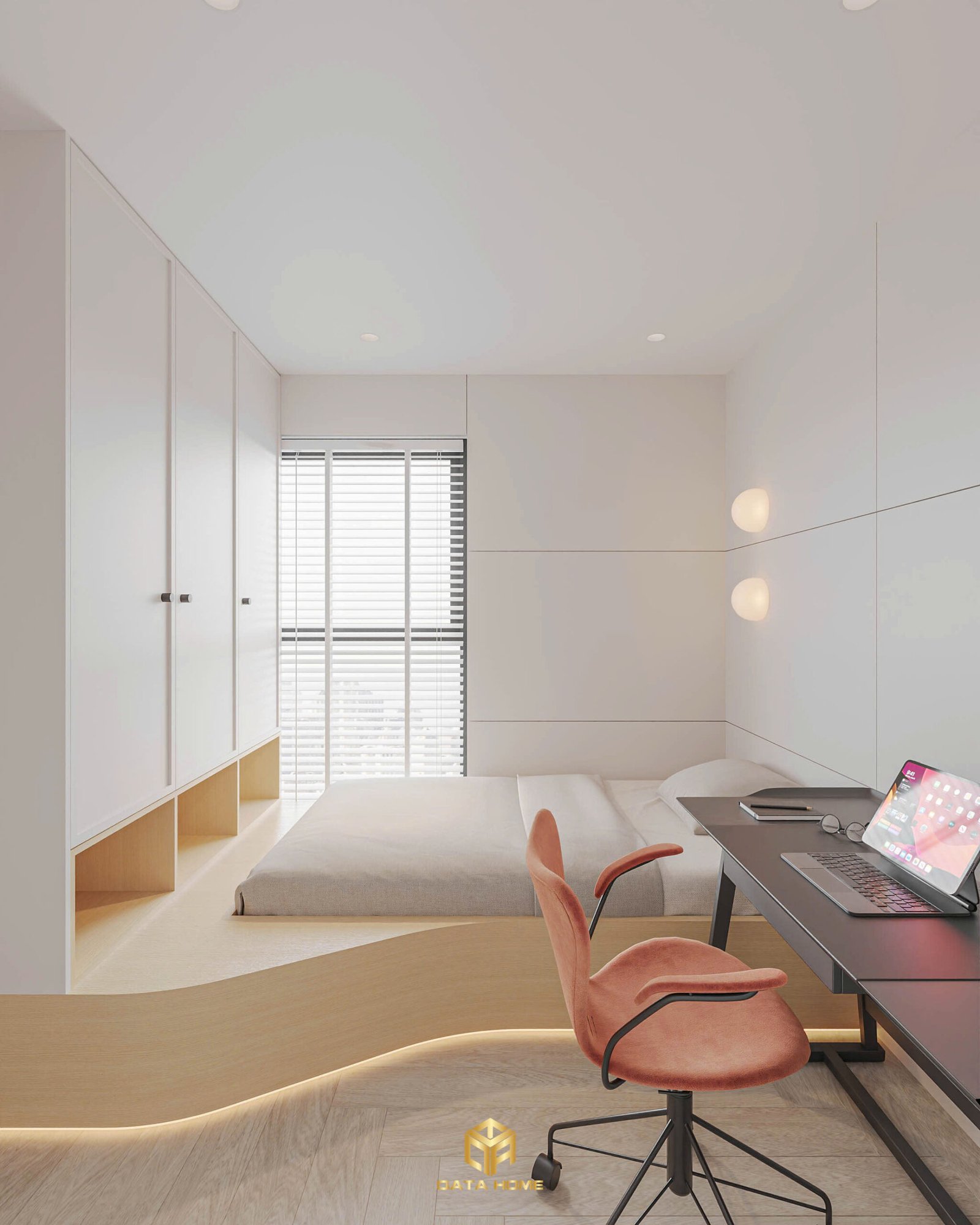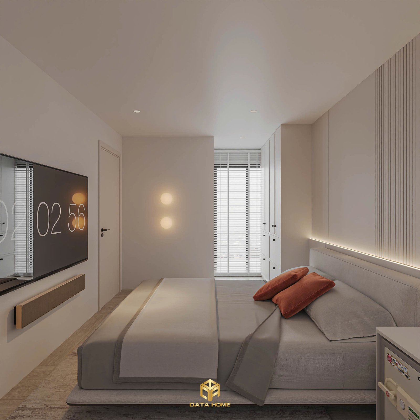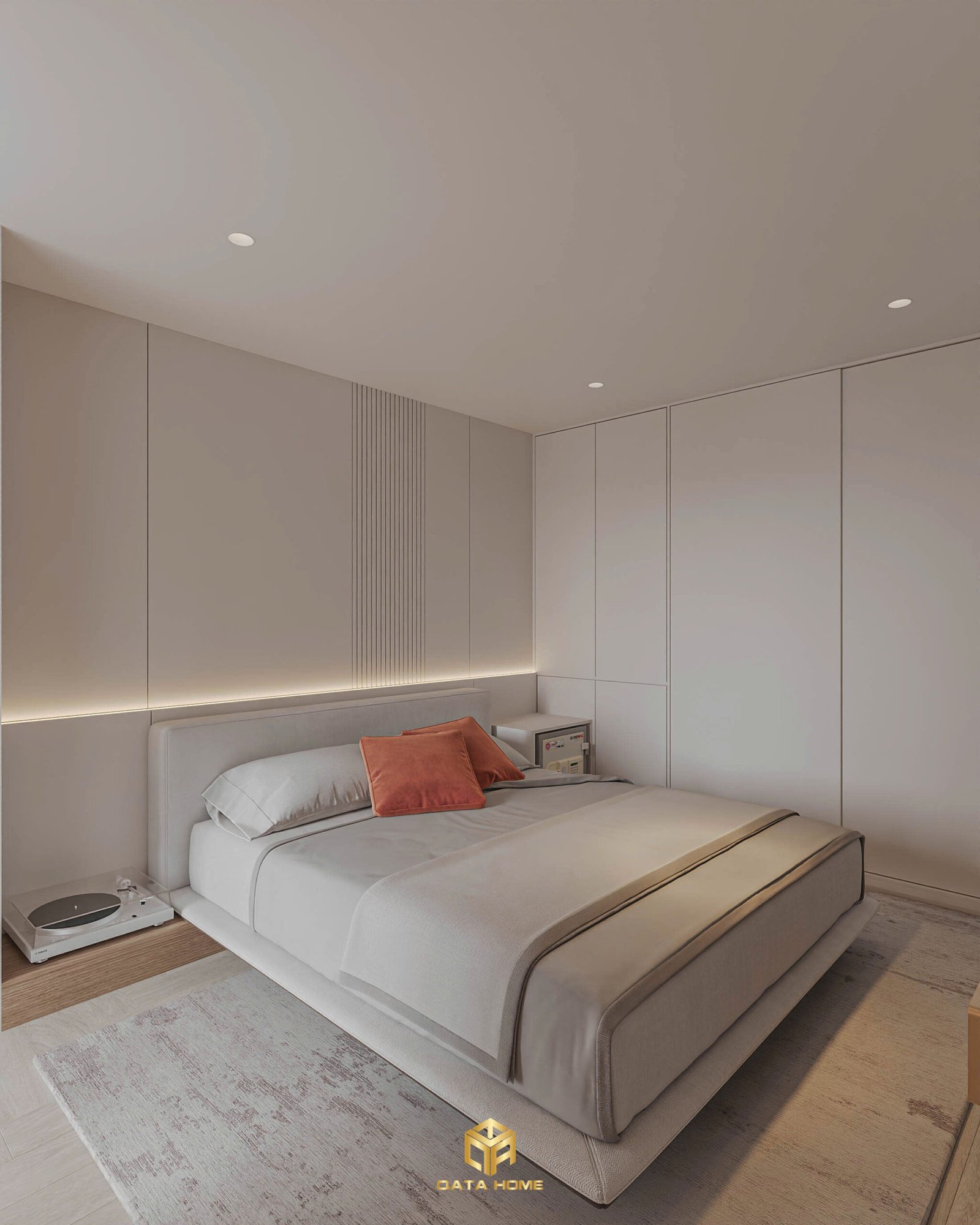 Giường ngủ thấp tạo cảm giác gần gũi. Hệ tủ âm tường giúp không gian luôn gọn gàng. Đèn led chạy dọc đầu giường mang lại hiệu ứng ánh sáng ấm áp.