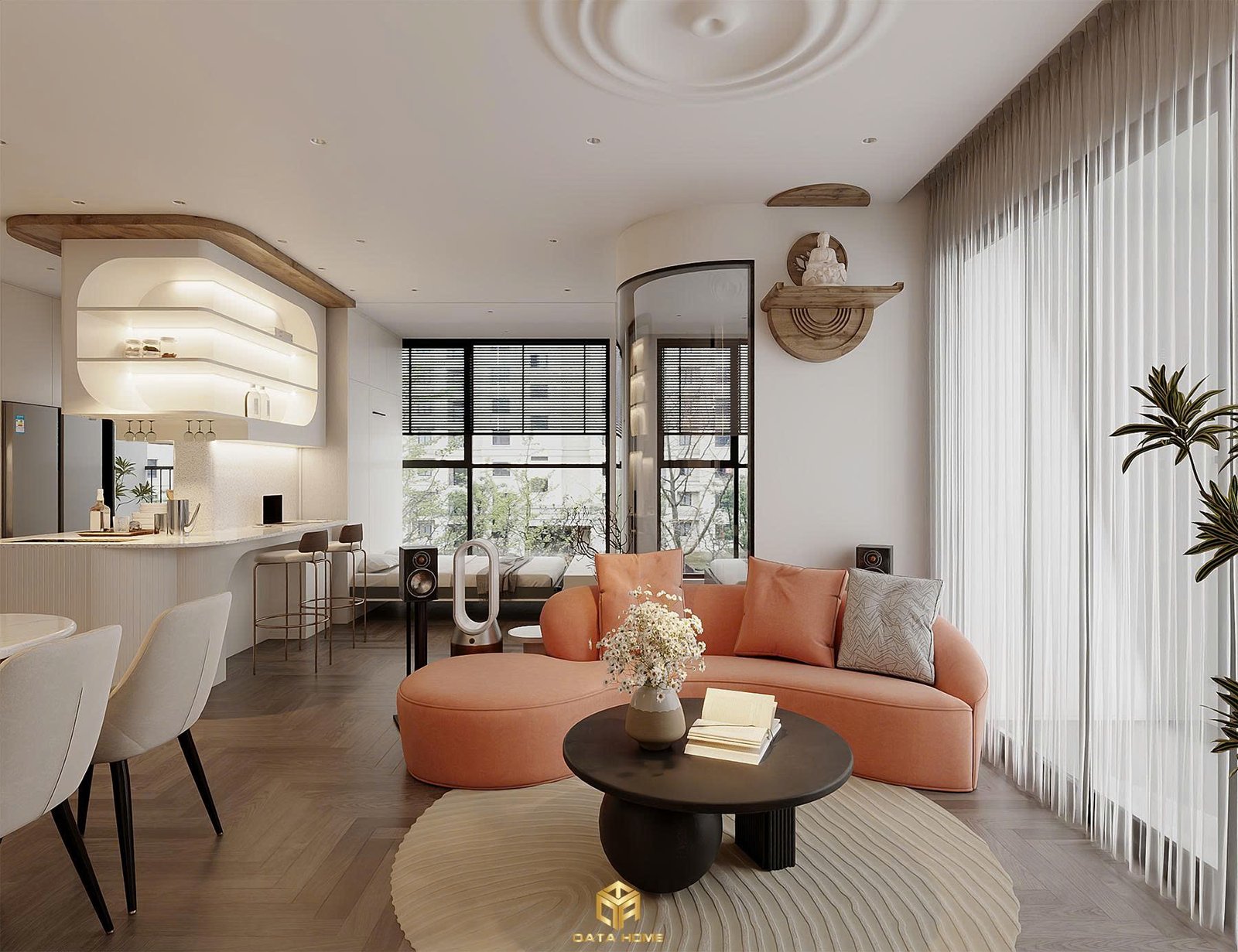Từ cái nhìn đầu tiên, bạn sẽ bị cuốn hút bởi cách Qata Home khéo léo kết hợp màu trắng tinh khôi của tường và tủ bếp với tone gỗ nâu ấm áp của sàn herringbone và mặt bàn. Không gian không lạnh lẽo mà tràn đầy sức sống nhờ những điểm nhấn cam đào trên sofa cong, xanh lá của cây cảnh và xám nhạt của các chi tiết kim loại đen. Mỗi gam màu đều được Qata Home tính toán kỹ lưỡng để tạo nên sự chuyển tiếp mượt mà, giúp căn hộ luôn sáng bừng dù là sáng sớm hay đêm khuya.