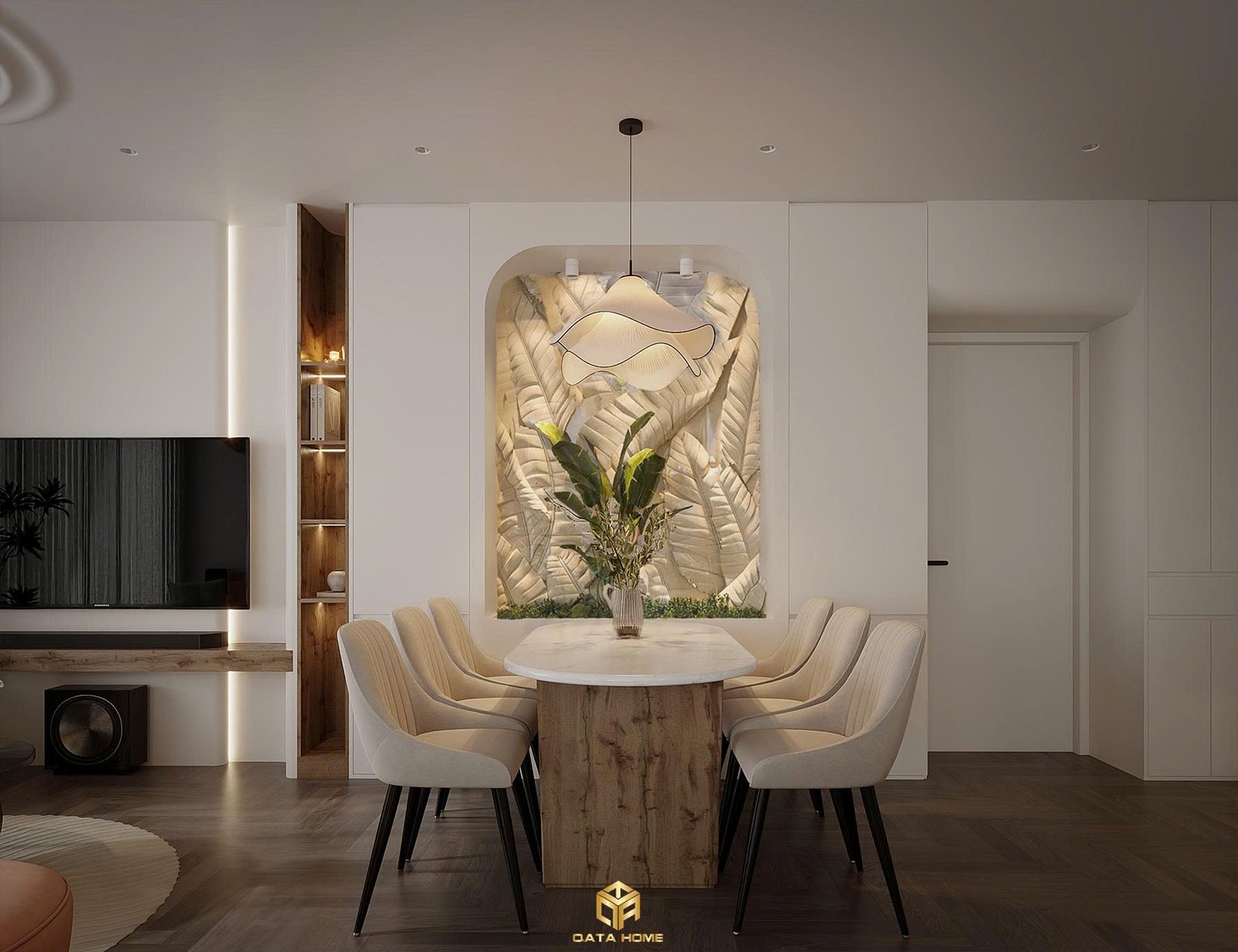 Bên cạnh là phòng ăn với bàn gỗ trắng marble và ghế bọc vải kem nhạt. Tường sau bàn là một hốc tường nghệ thuật với họa tiết lá chuối 3D trắng kem, được chiếu sáng từ trên xuống. Qata Home đã dùng chính tone trắng kem này để tạo chiều sâu, khiến bức tường không chỉ là trang trí mà còn như một tác phẩm điêu khắc sống.