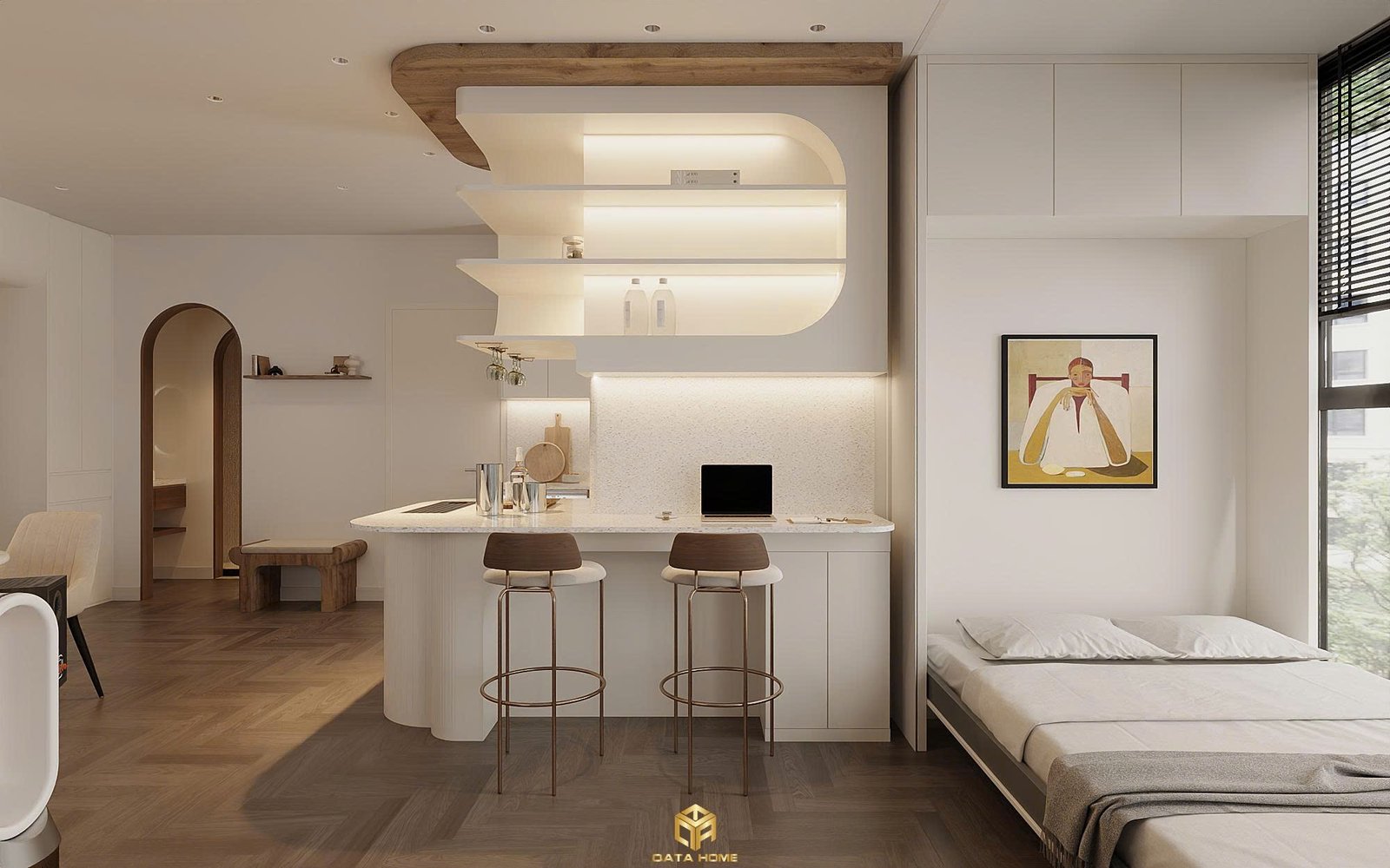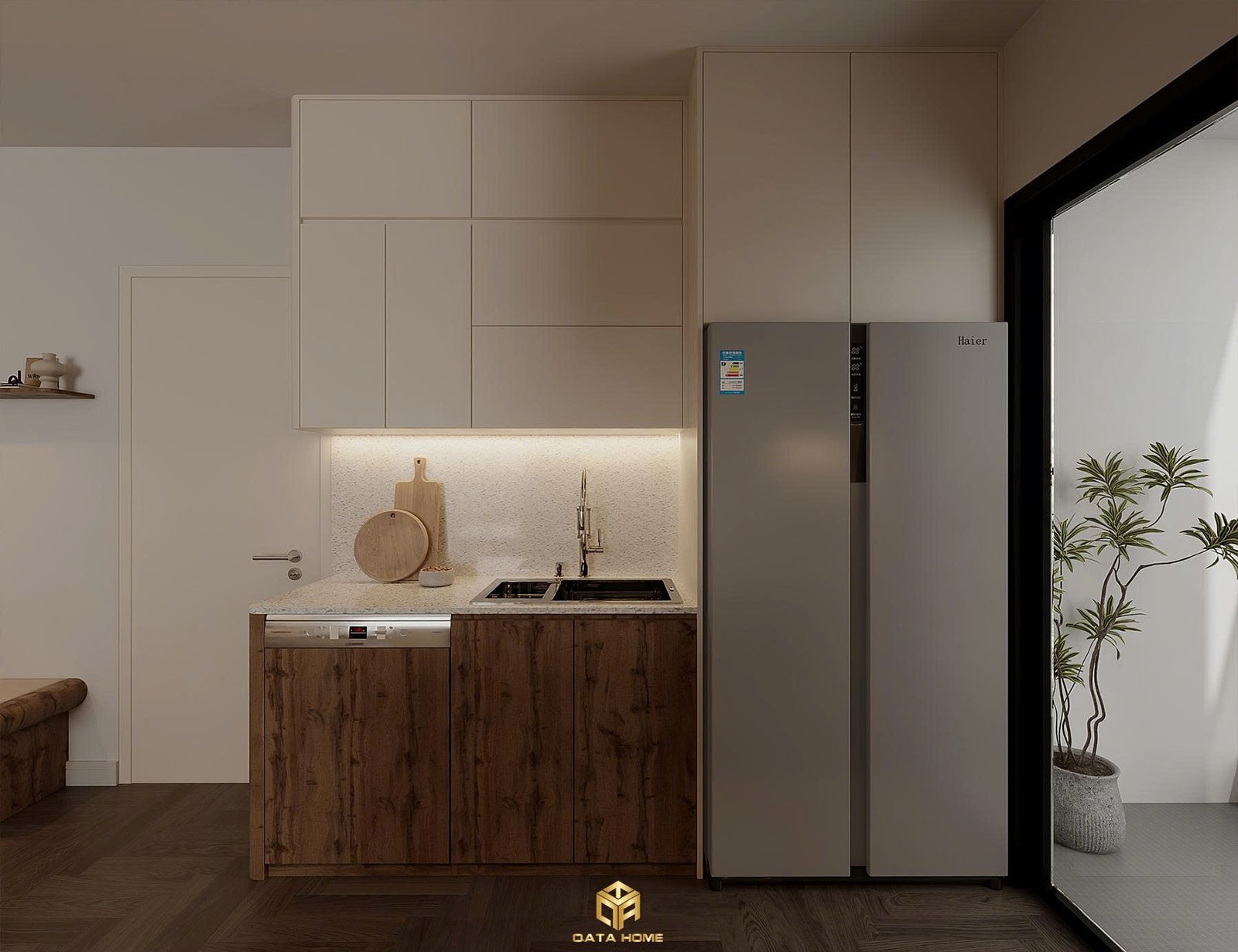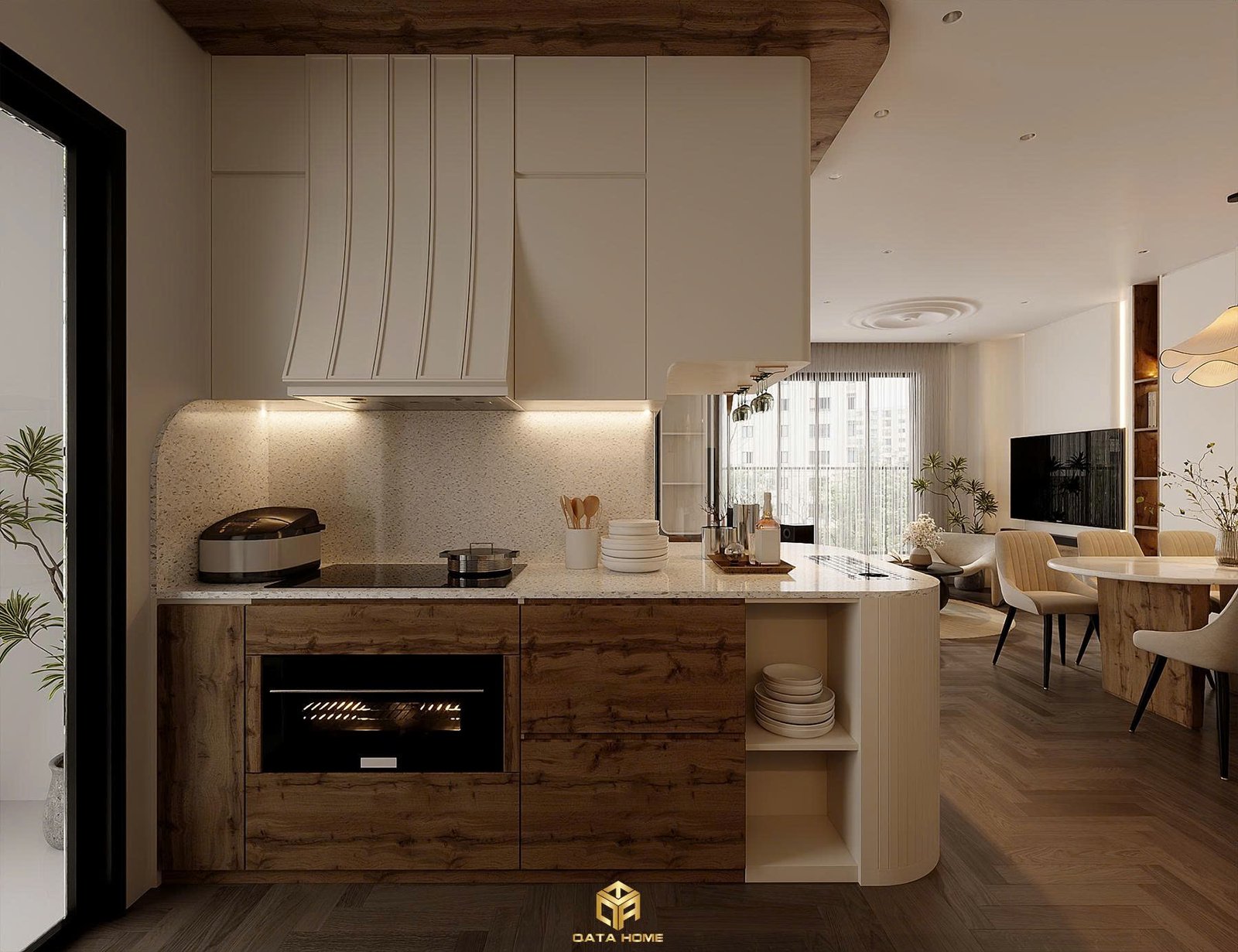 Bếp là trái tim của căn hộ, và Qata Home đã biến nó thành một bức tranh sống động. Đảo bếp cong mềm mại với mặt đá terrazzo trắng-xám điểm những hạt cát nhỏ tạo cảm giác mịn màng, ấm áp dưới ánh đèn. Phần tủ dưới giữ tone gỗ nâu vân đẹp tự nhiên, trong khi tủ trên là trắng phẳng, tạo sự chuyển tiếp mượt mà về màu sắc.