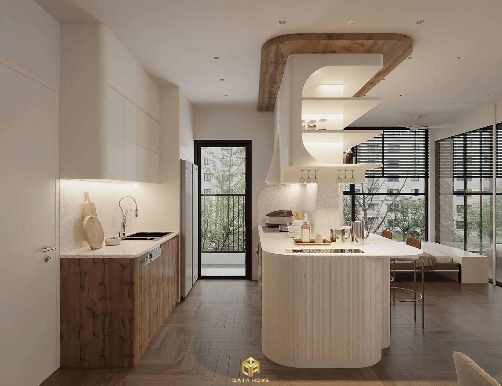 Bếp đảo cong với tone gỗ ấm và trắng kem