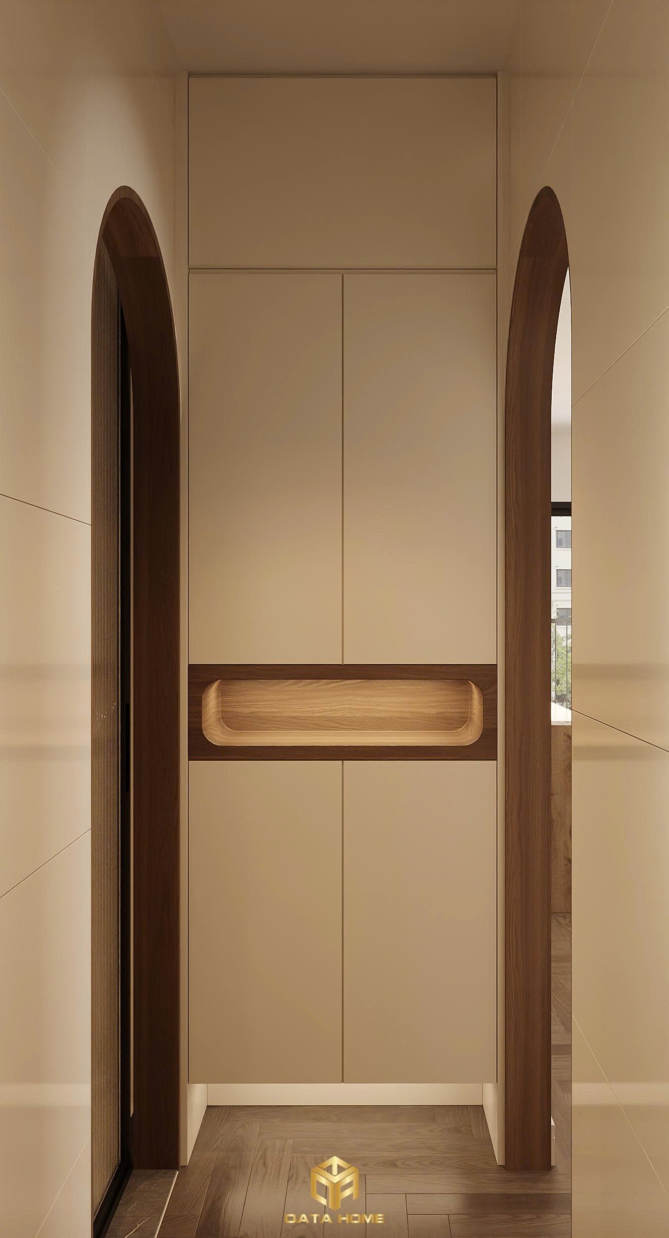 Ngay khi bước qua cánh cửa, bạn sẽ cảm nhận được hơi thở của một không gian mở rộng lớn. Qata Home đã loại bỏ mọi vách ngăn thừa, để ánh sáng tự nhiên từ cửa kính lớn tràn ngập toàn bộ căn hộ. Gam màu chủ đạo là trắng kem trên tường và trần, kết hợp với gỗ óc chó tự nhiên ở sàn và một số chi tiết tủ dưới. Sự tương phản nhẹ nhàng này tạo cảm giác ấm áp mà vẫn thanh lịch.