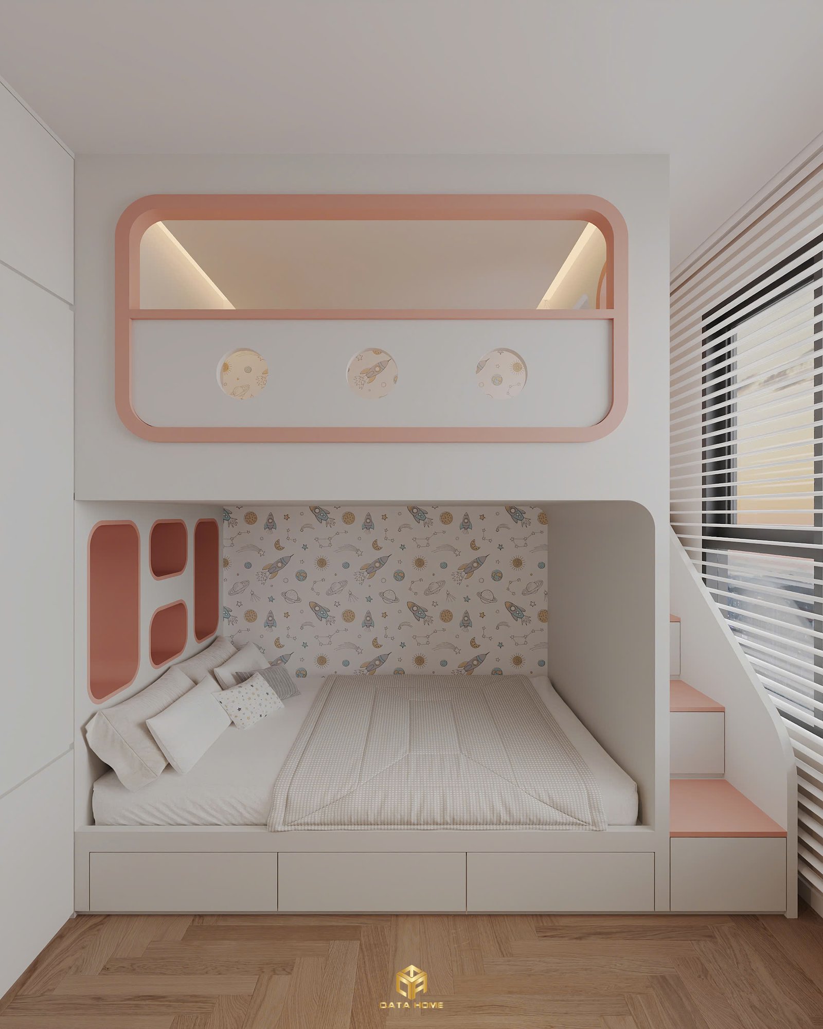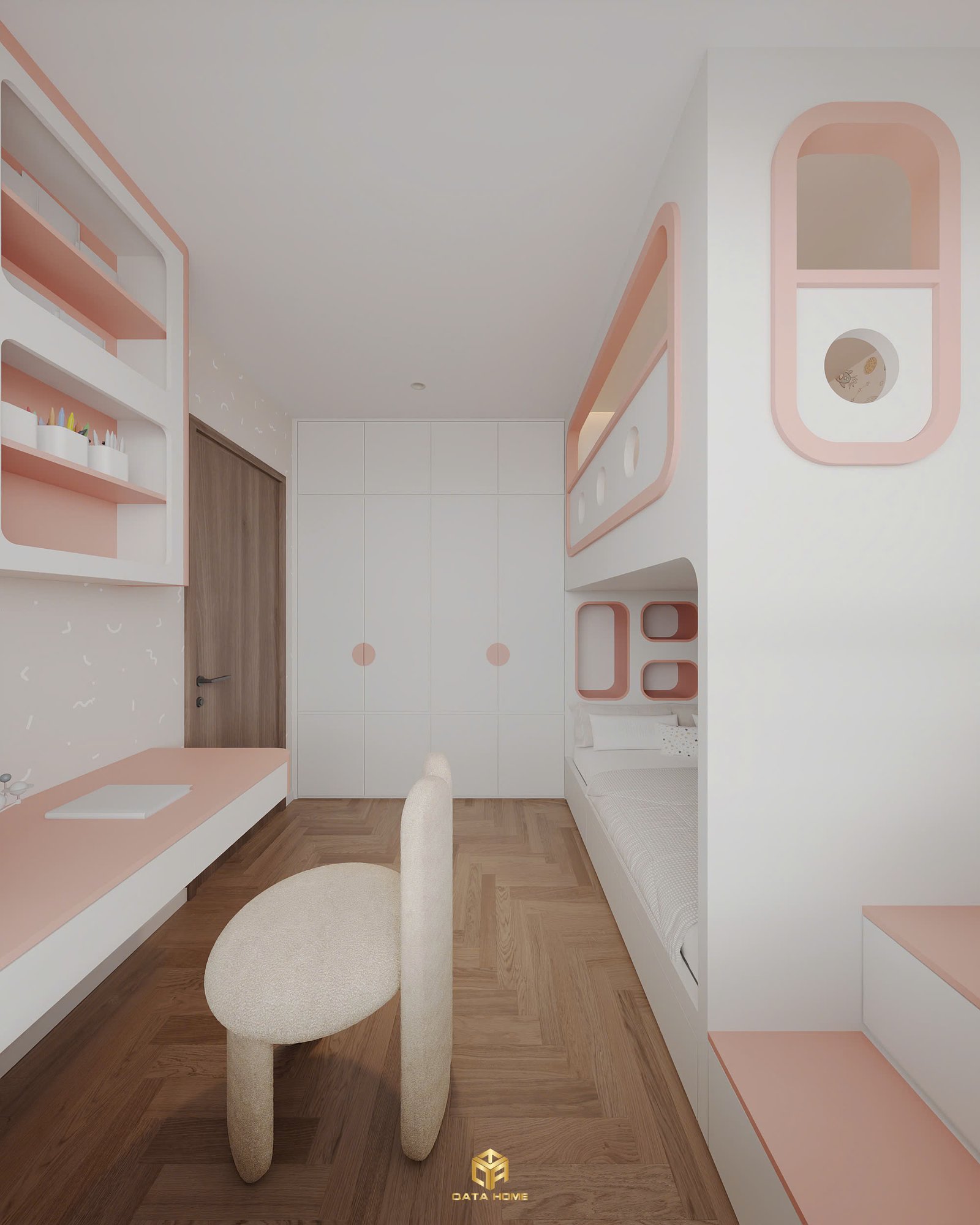 Phòng trẻ em sử dụng tone hồng pastel kết hợp trắng, mang đến sự vui tươi mà không lòe loẹt. Giường tầng tích hợp tủ kệ hình tàu vũ trụ, bàn học gắn tường và ghế nỉ mềm mại tạo nên góc chơi – học lý tưởng.