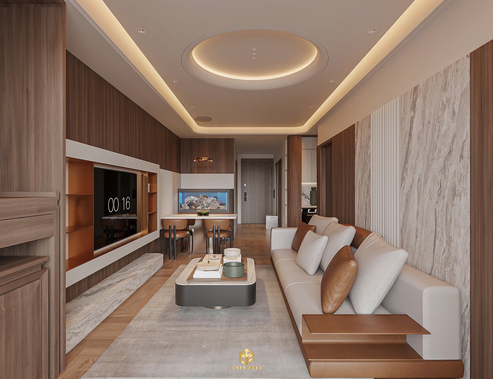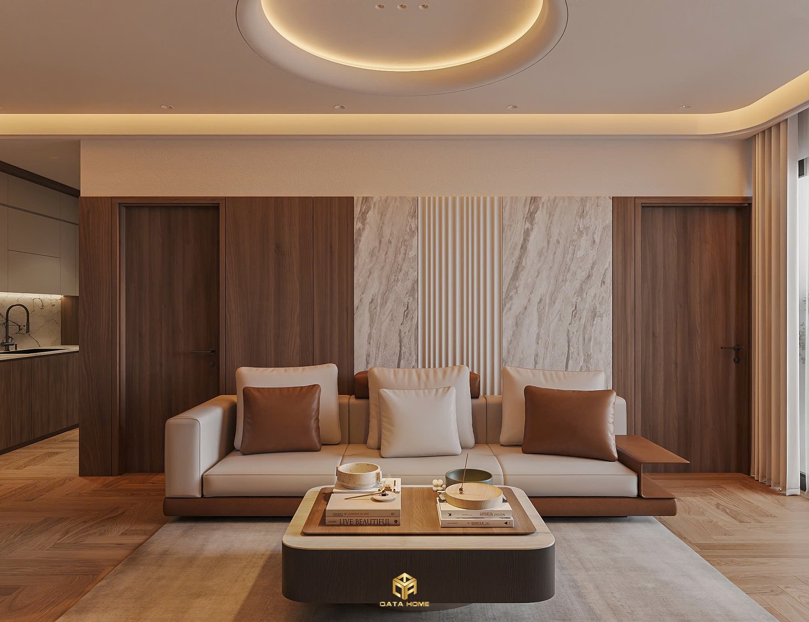 Sofa bọc da kết hợp nệm vải êm ái, bàn trà gỗ bo góc mềm mại, mảng tường ốp gỗ và đá vân tự nhiên tạo điểm nhấn, cùng hệ trần giật cấp tích hợp ánh sáng hắt tinh tế.