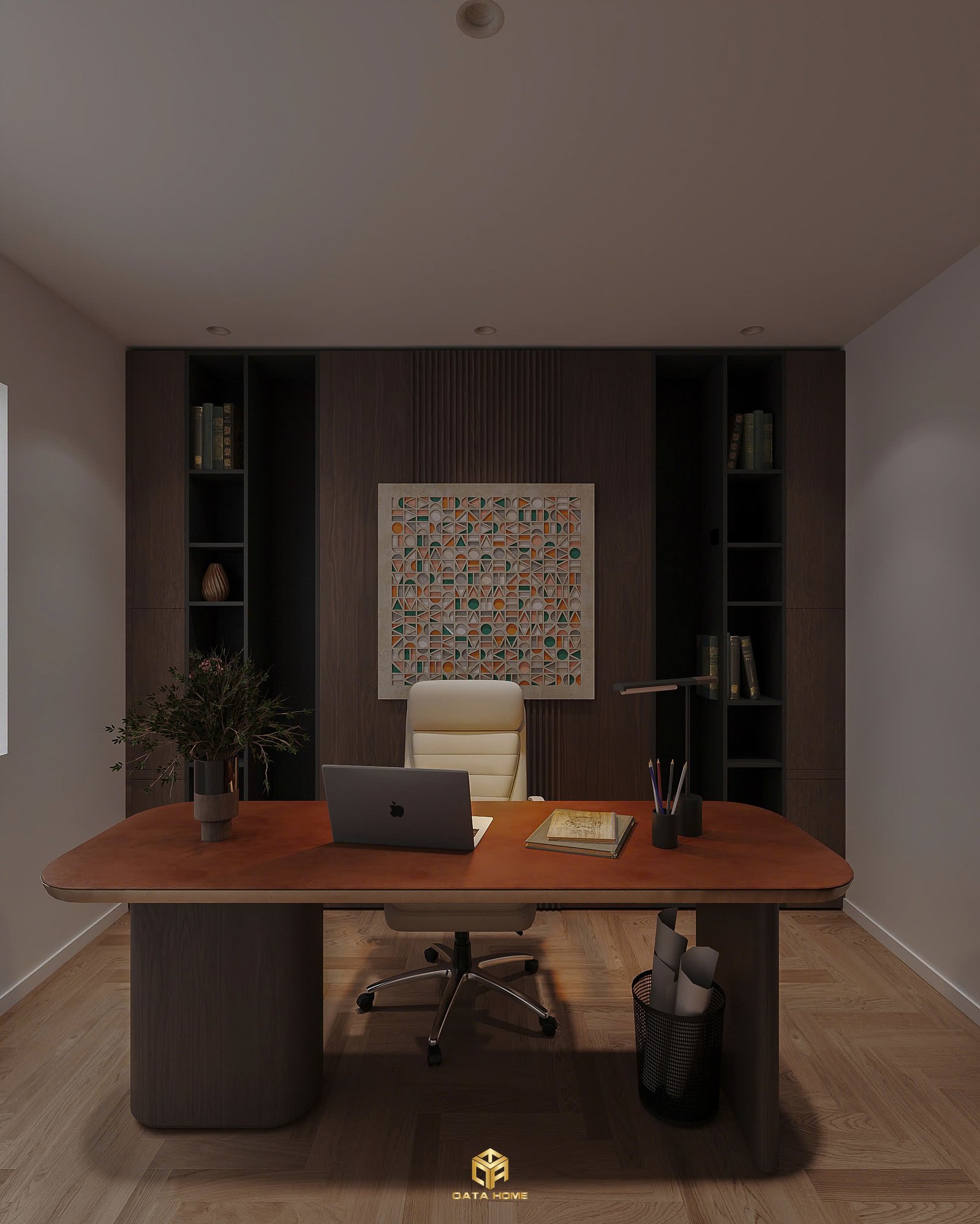 Phòng làm việc mang tone tối sang trọng với bàn gỗ lớn, ghế da trắng và kệ sách hai bên. Bức tranh nghệ thuật trừu tượng trên tường gỗ tạo điểm nhấn văn hóa, trong khi ánh sáng tập trung từ đèn bàn và trần giúp tập trung cao độ.