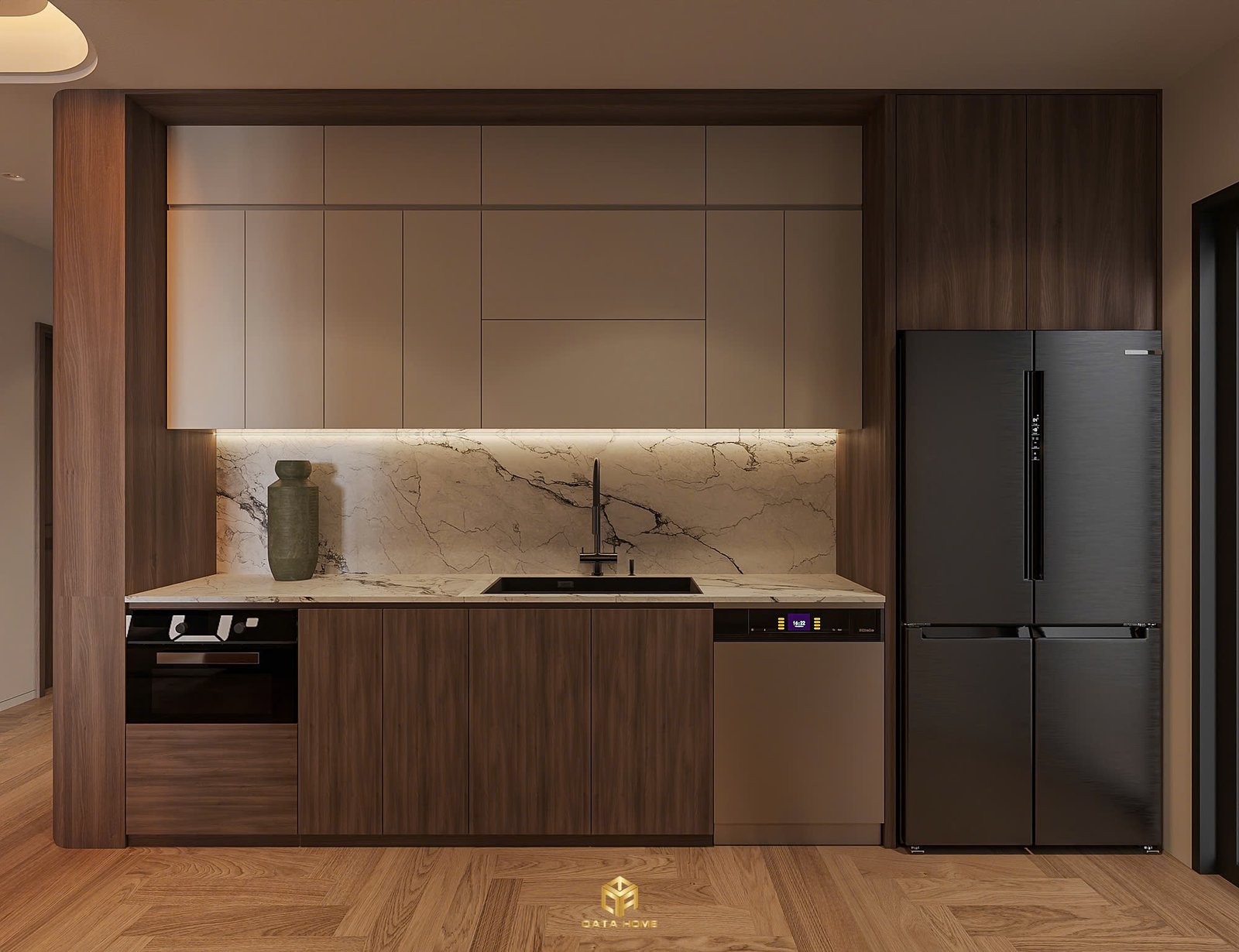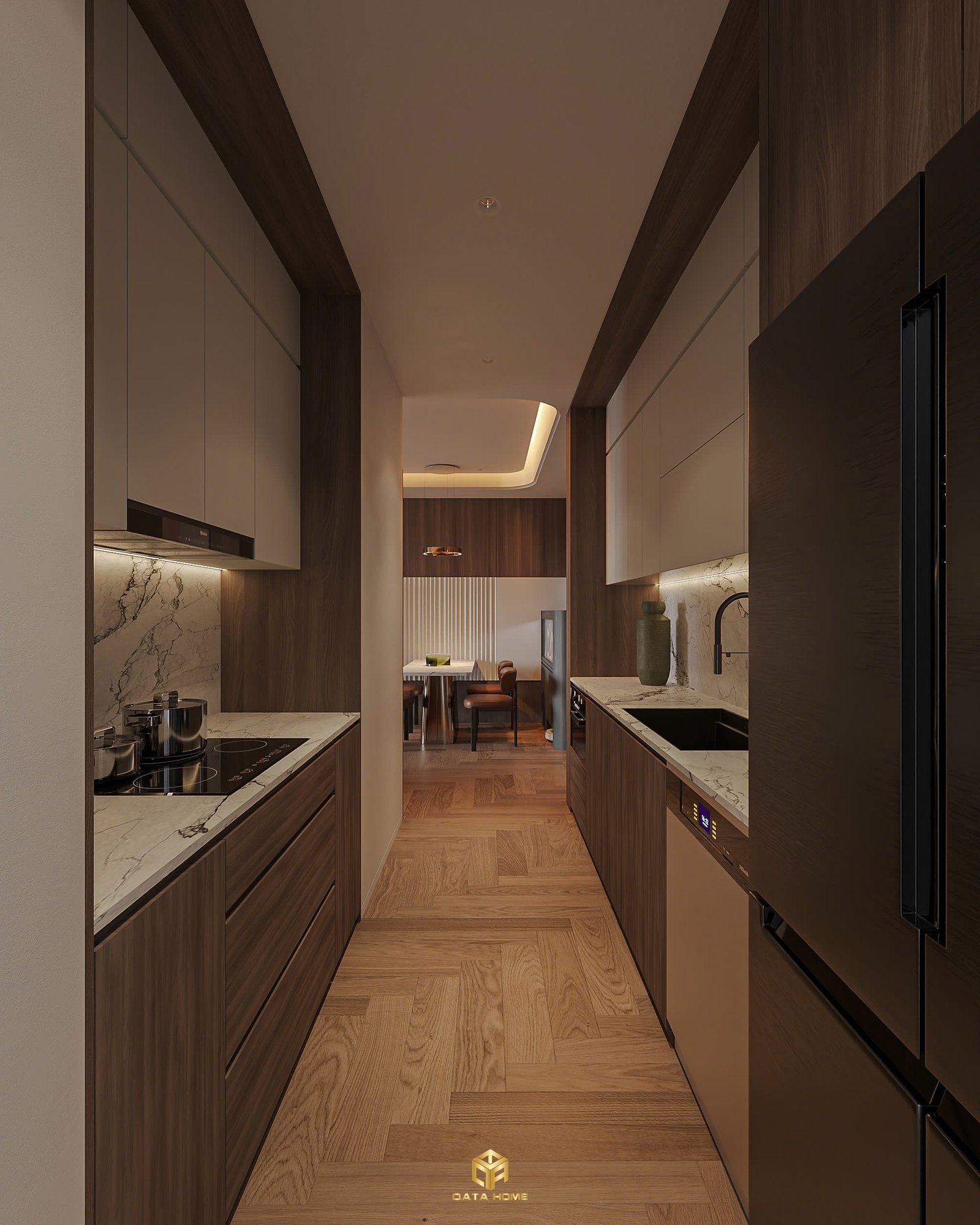 Bếp được xử lý liền mạch với tủ gỗ tối màu, mặt đá marble veined nhẹ và đèn led dưới tủ tạo cảm giác sạch sẽ, hiện đại. Hành lang bếp dài với tủ âm tường và thiết bị tích hợp giúp tối ưu diện tích mà vẫn giữ được vẻ đẹp tinh tế.
