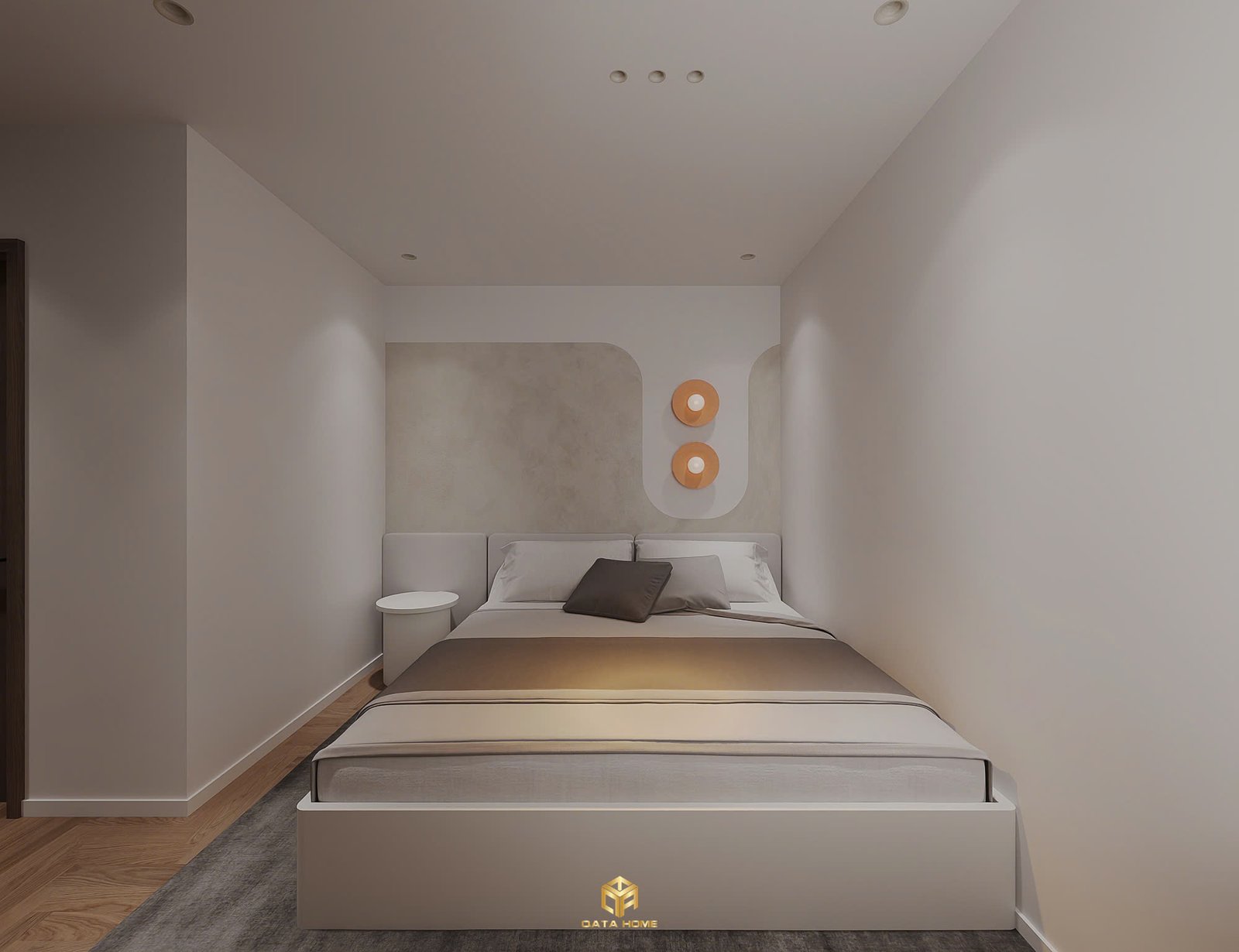 Phòng ngủ chủ đạo tone trắng kem với giường bệt thấp, đèn led giấu sau đầu giường và hai bức tranh tròn trang trí tường. Cửa sổ lớn mang ánh sáng tự nhiên vào, kết hợp rèm mỏng giúp không gian luôn thoáng đãng.