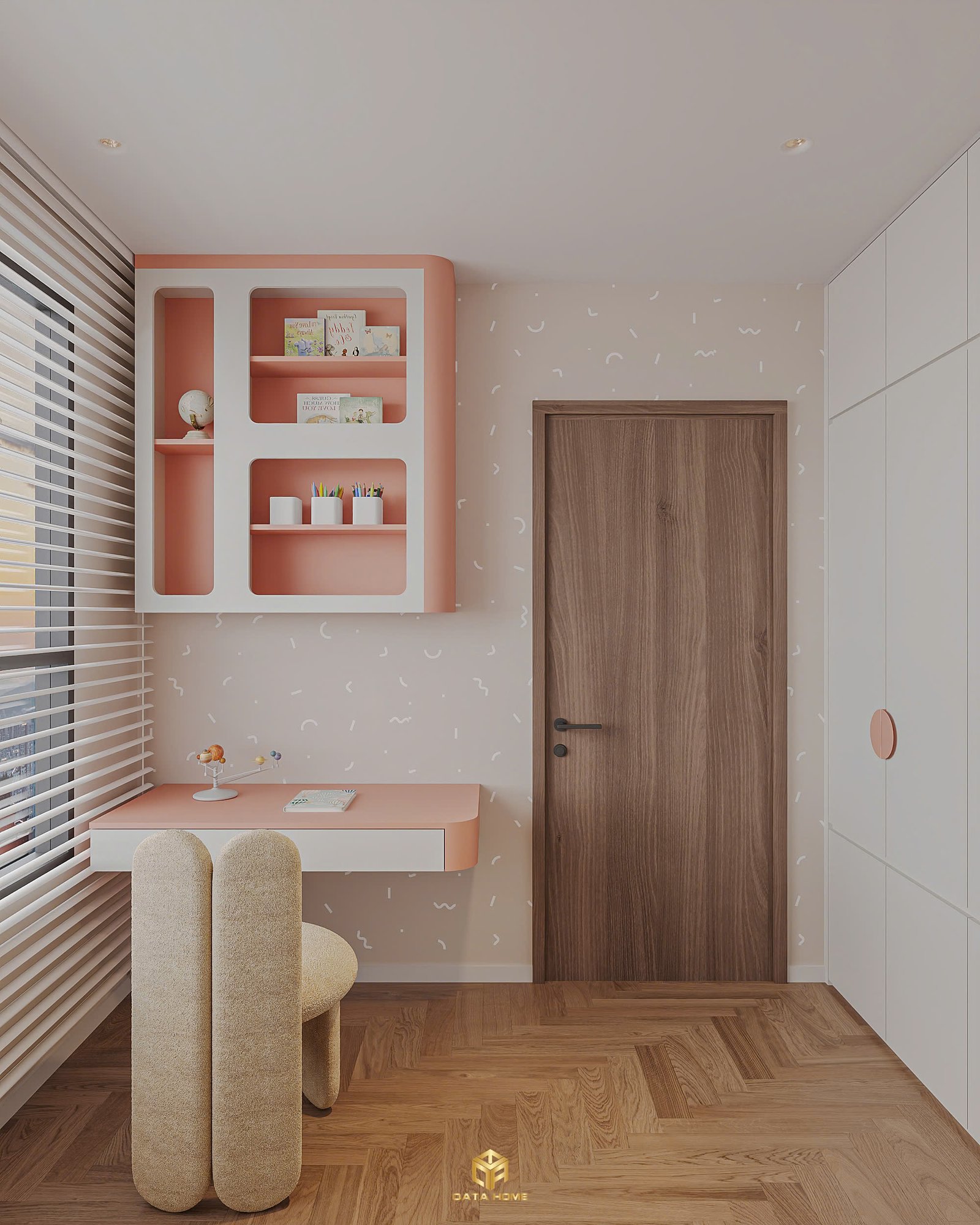 Bàn học treo bo góc sơn màu pastel kết hợp kệ trang trí âm tường phối hai tông trắng – cam, ghế bọc nỉ mềm dáng trụ tròn; tủ cánh phẳng và cửa gỗ vân tự nhiên đi cùng sàn gỗ xương cá, tạo tổng thể gọn gàng, ấm áp và thân thiện.