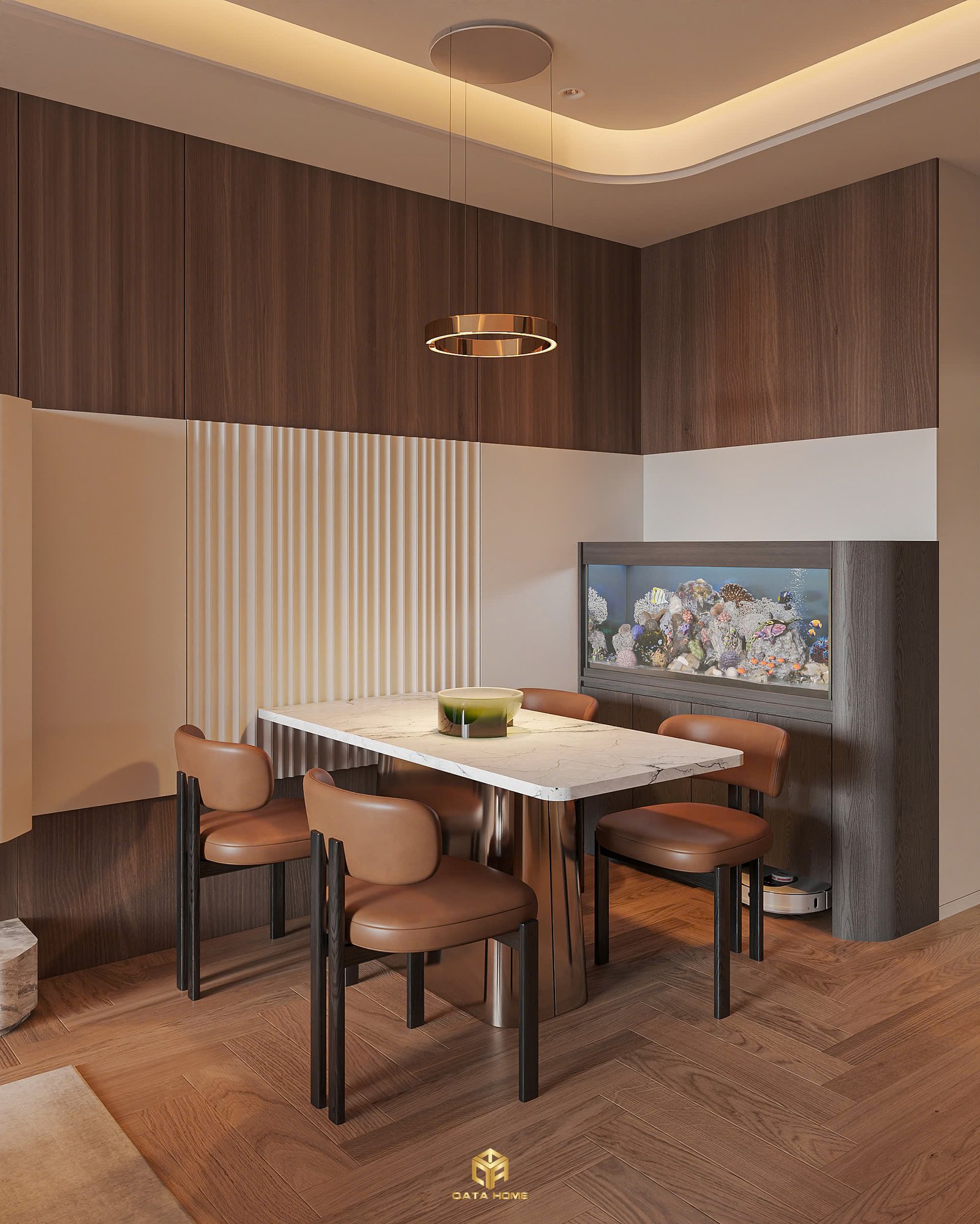 Phía sau là bể cá cảnh tích hợp trong tủ kệ gỗ, mang lại sự thư giãn mỗi bữa ăn.