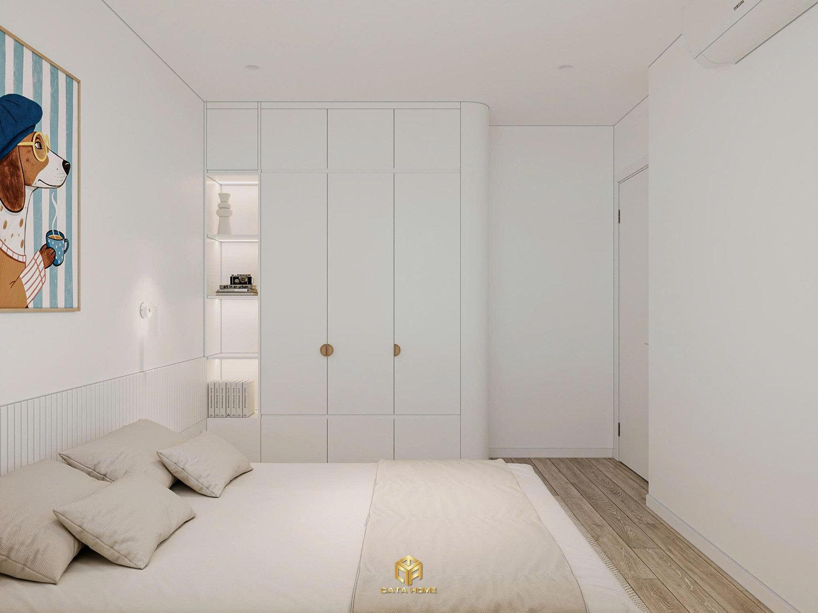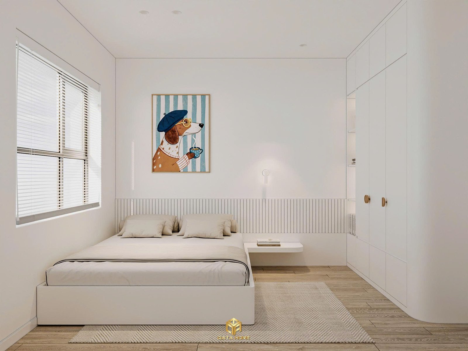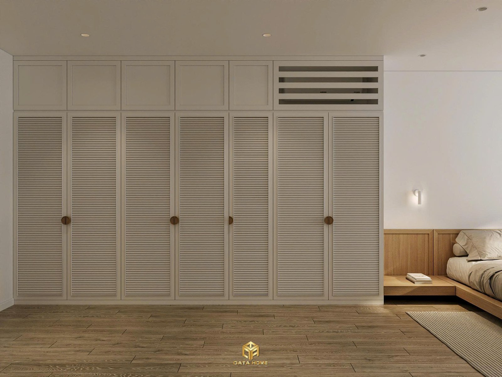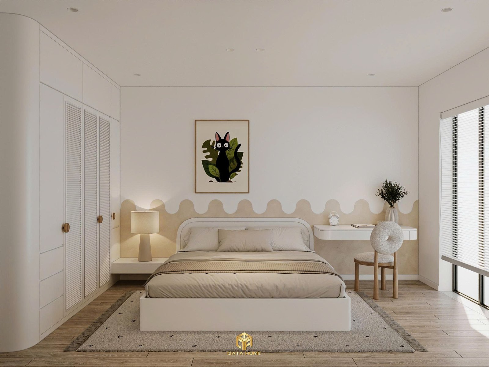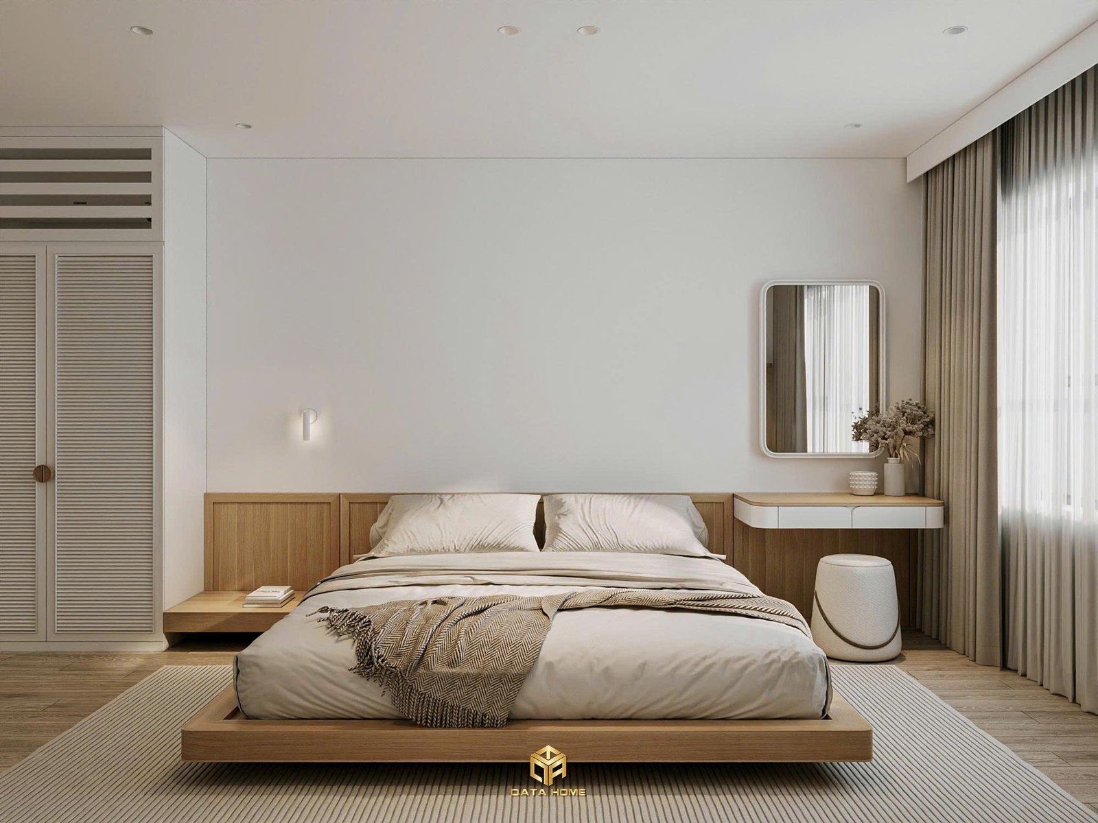 Phòng ngủ chính mang đến cảm giác bình yên tuyệt đối. Giường thấp kiểu platform kết hợp đầu giường gỗ sáng, vách sau trang trí đường cong sóng nhẹ nhàng. Tủ quần áo louvered trắng cao đến trần vừa tối ưu lưu trữ vừa giữ sự thông thoáng.