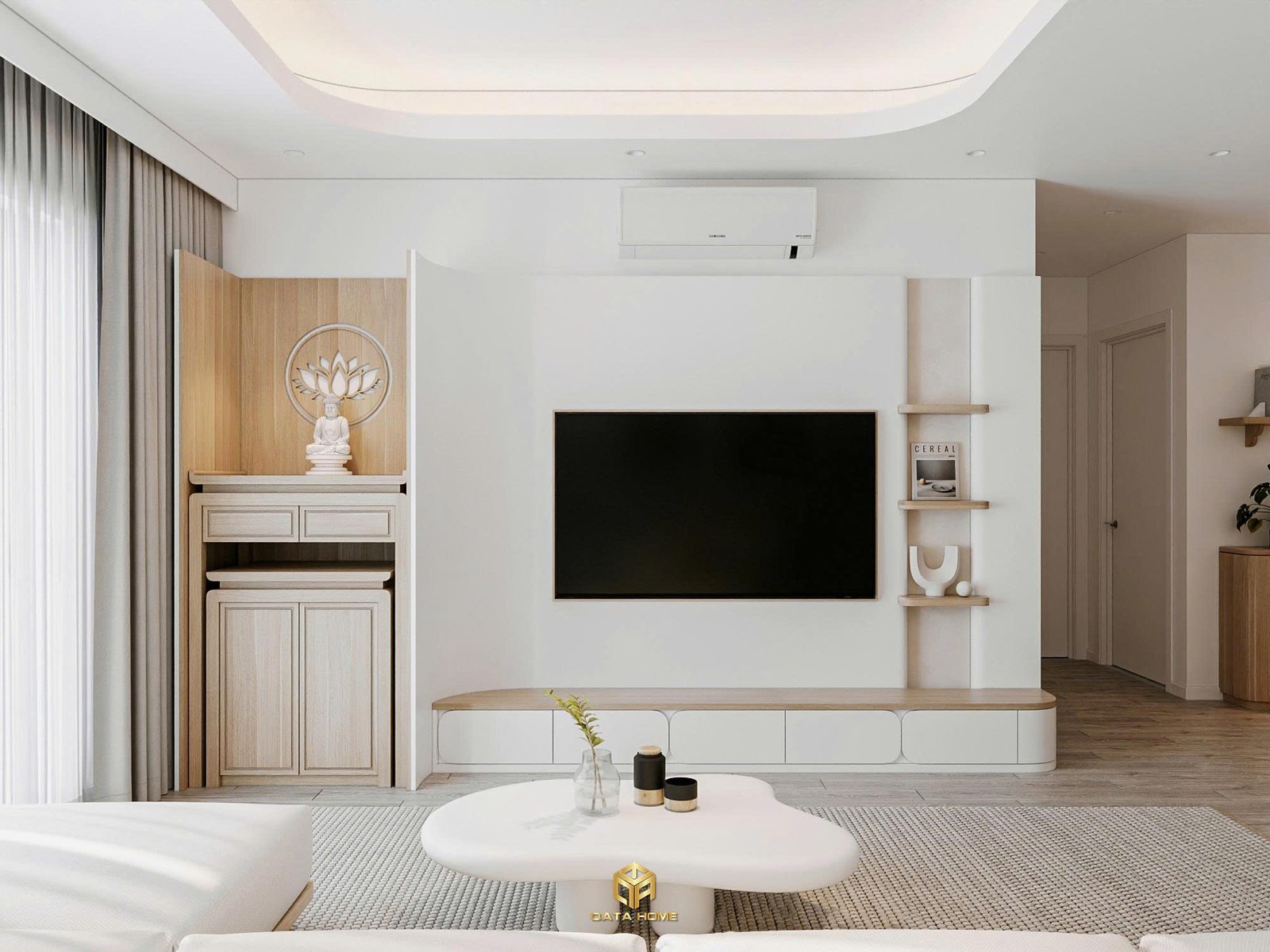 Phòng khách là nơi đầu tiên gây ấn tượng mạnh mẽ. Tường TV trắng phẳng liền mạch, kết hợp kệ âm nhẹ nhàng, tạo cảm giác sạch sẽ và hiện đại. Bên trái là góc thờ Phật ấm áp với gỗ tự nhiên và tượng trắng tinh khiết, vừa giữ nét truyền thống vừa hòa quyện hoàn hảo với phong cách hiện đại.