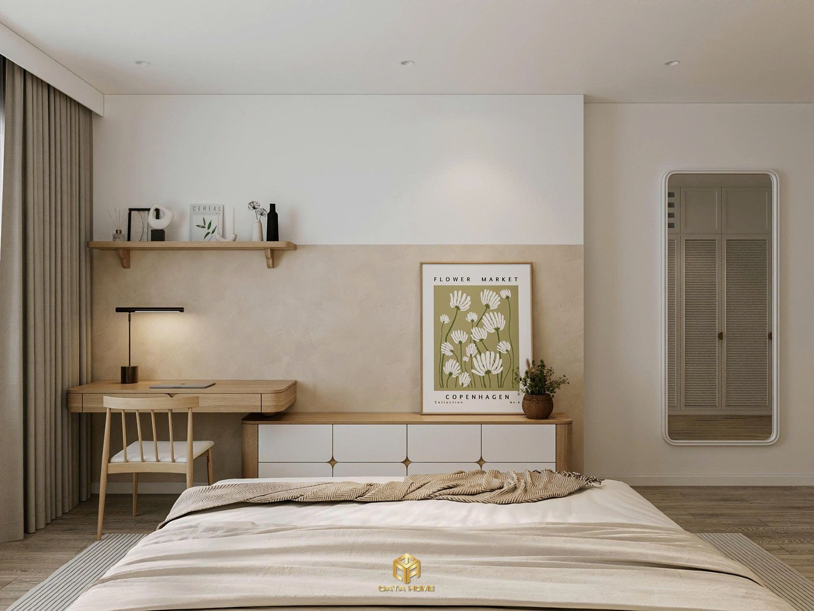 Phòng ngủ phong cách hiện đại tối giản với giường thấp khung gỗ tự nhiên, kết hợp tab đầu giường và bàn trang điểm liền khối. Tông màu be – trắng nhẹ nhàng, chất liệu gỗ ấm áp cùng vải linen tạo cảm giác thư giãn, tinh tế và thanh lịch.
