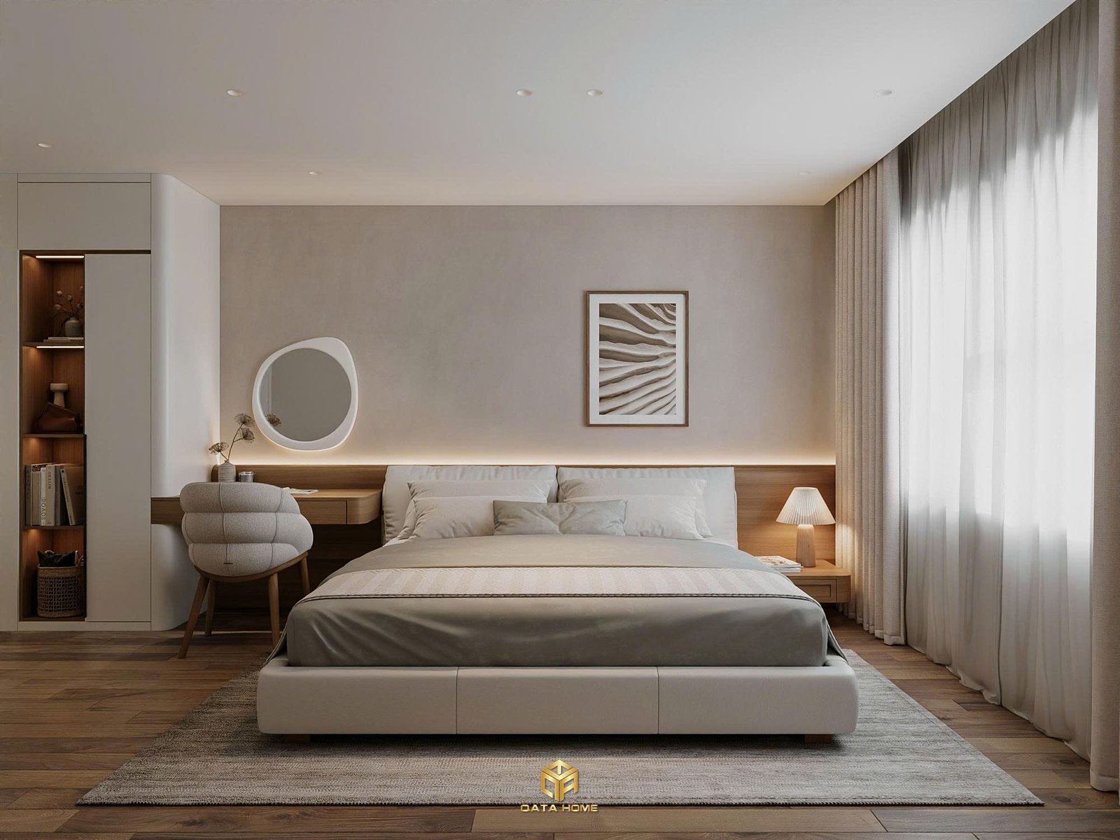 Phòng ngủ là chốn bình yên riêng tư. Giường da kem rộng rãi với chăn ga màu be nhạt, kết hợp bàn trang điểm gỗ và ghế bọc vải êm ái. Gương tròn treo tường phát sáng nhẹ nhàng, phản chiếu ánh sáng từ dải led sau đầu giường.