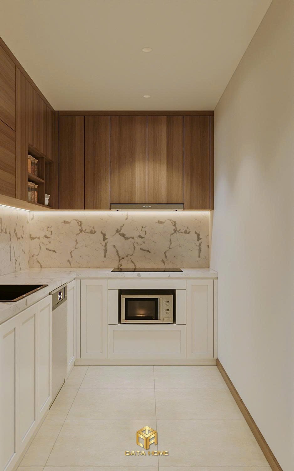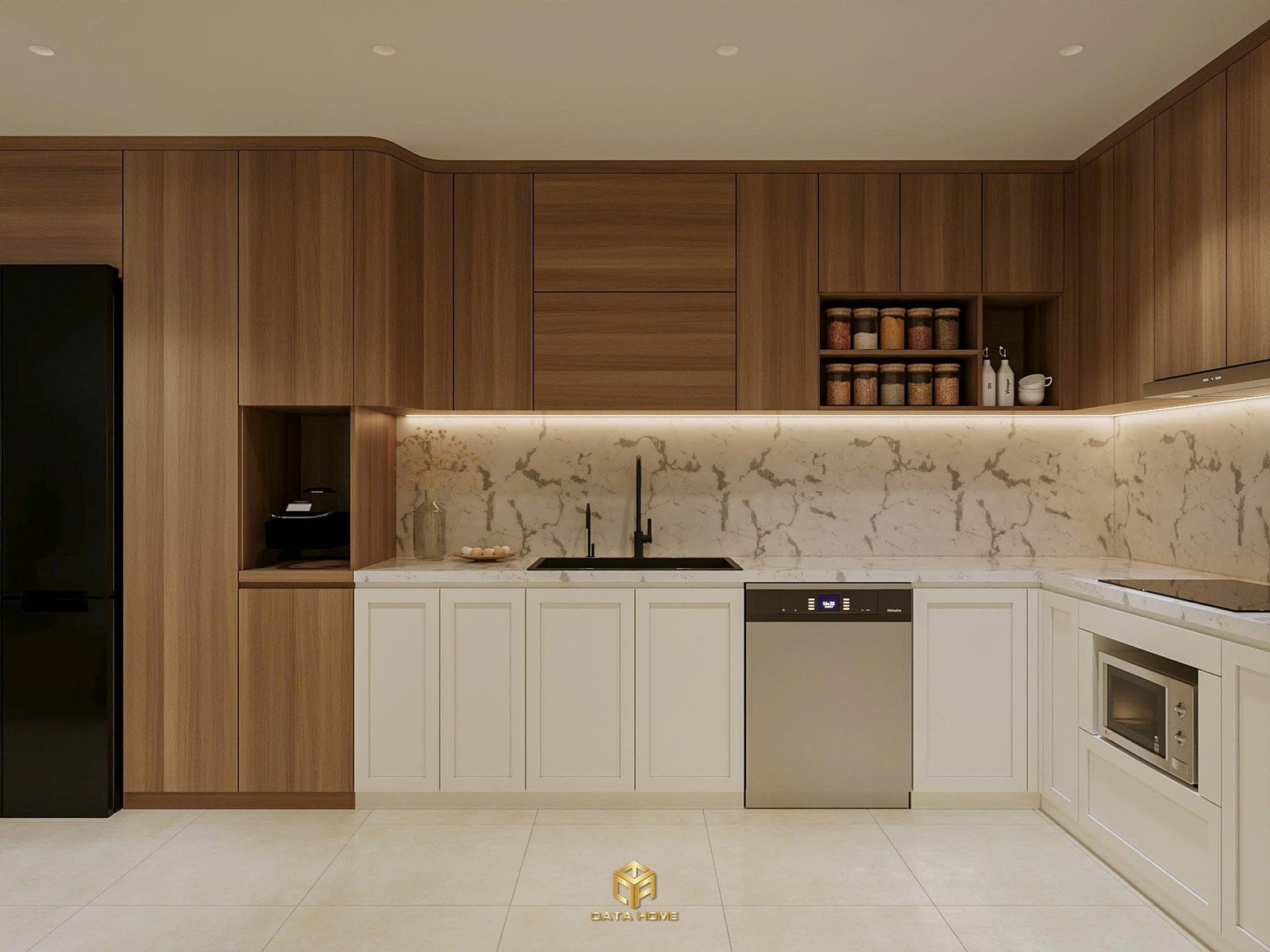 Bếp là nơi Qata Home thể hiện rõ nhất sự tinh tế. Tủ bếp gỗ óc chó cao cấp kết hợp hài hòa với tủ dưới màu trắng kem, tạo chiều sâu cho không gian. Backsplash marble vân xám nhẹ nhàng phản chiếu ánh sáng led ẩn, biến khu vực nấu nướng thành bức tranh sống động.