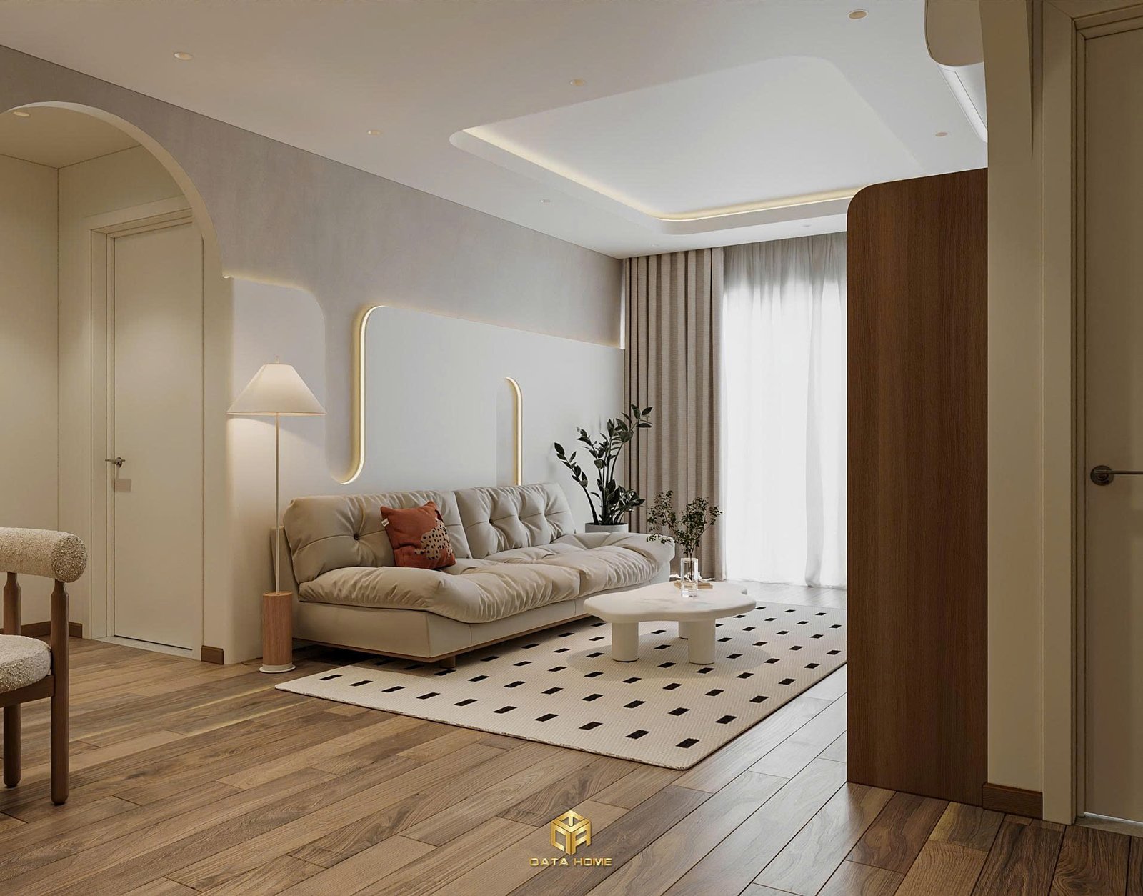Ghế sofa da màu kem êm ái, thảm họa tiết đen trắng đơn giản và bàn trà hình dáng tự nhiên như đám mây trắng nằm giữa phòng. Ánh sáng từ trần thạch cao cong vút lan tỏa dịu dàng, khiến bạn chỉ muốn ngồi xuống, nhâm nhi tách trà và ngắm nhìn cây xanh bên cửa sổ.
