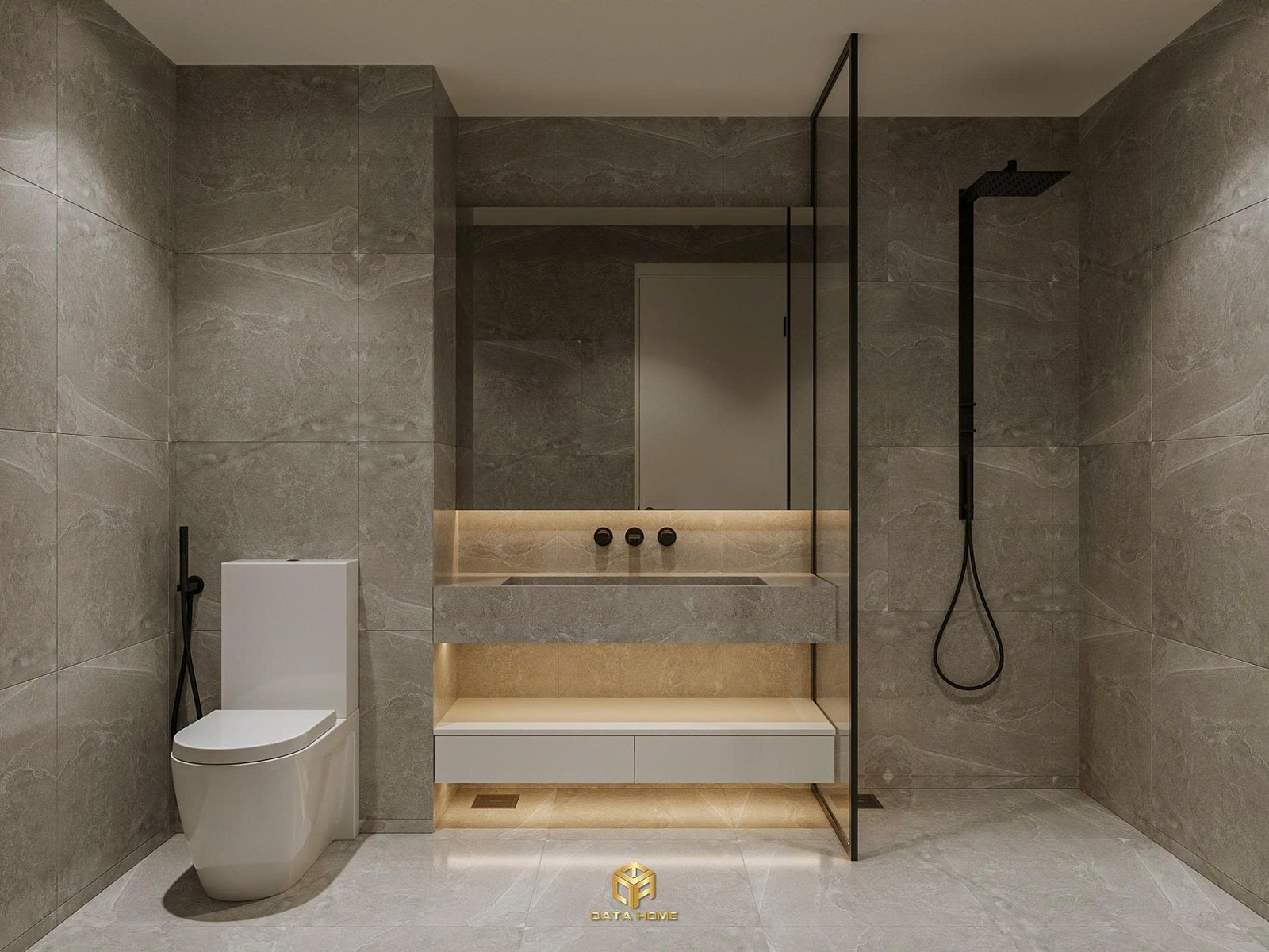 Phòng tắm được ốp đá marble xám toàn bộ, tạo cảm giác sang trọng và thư thái. Bồn rửa nổi với gương lớn, vòi sen đen matte và vách kính trong suốt chia không gian tắm khô – ướt rõ ràng.