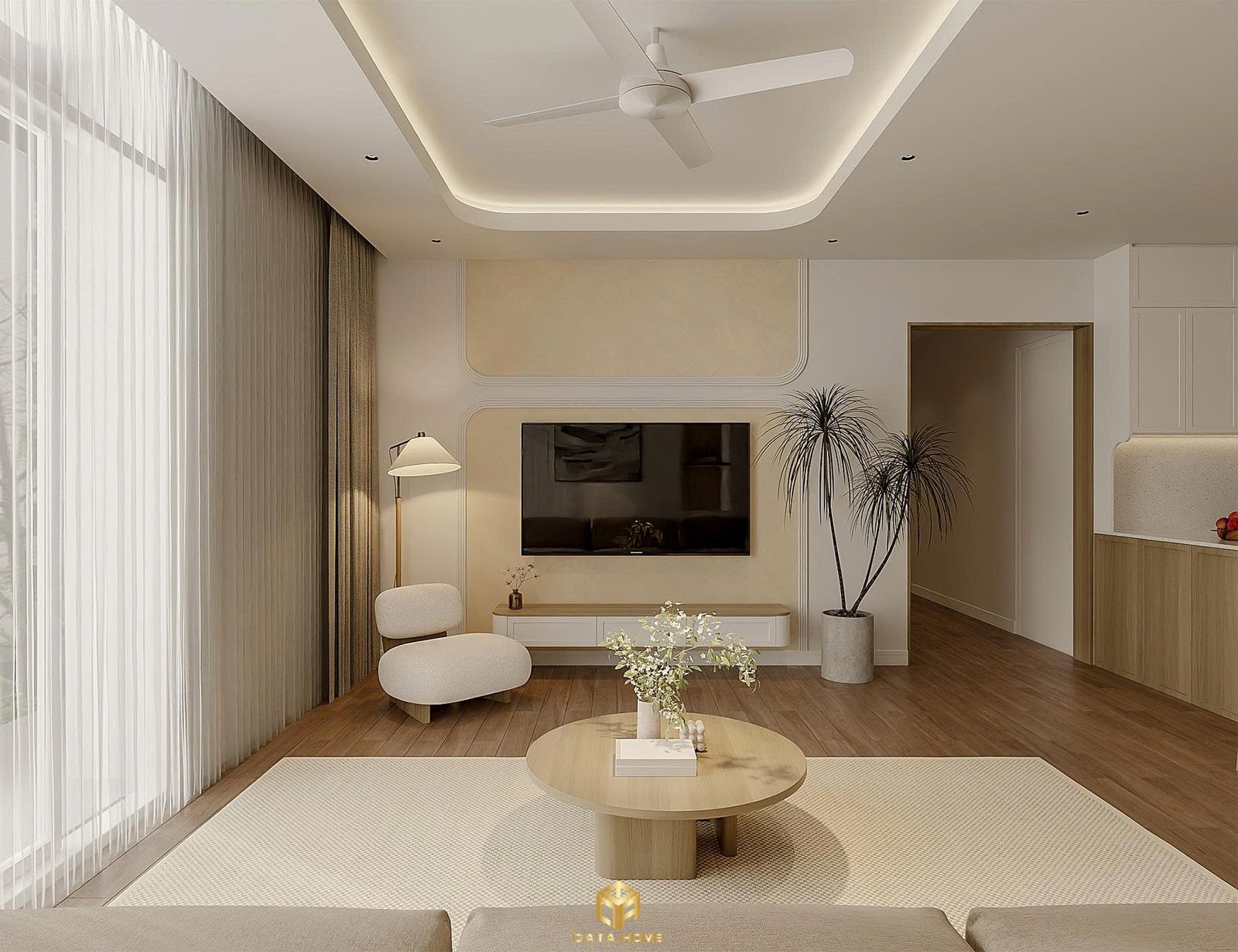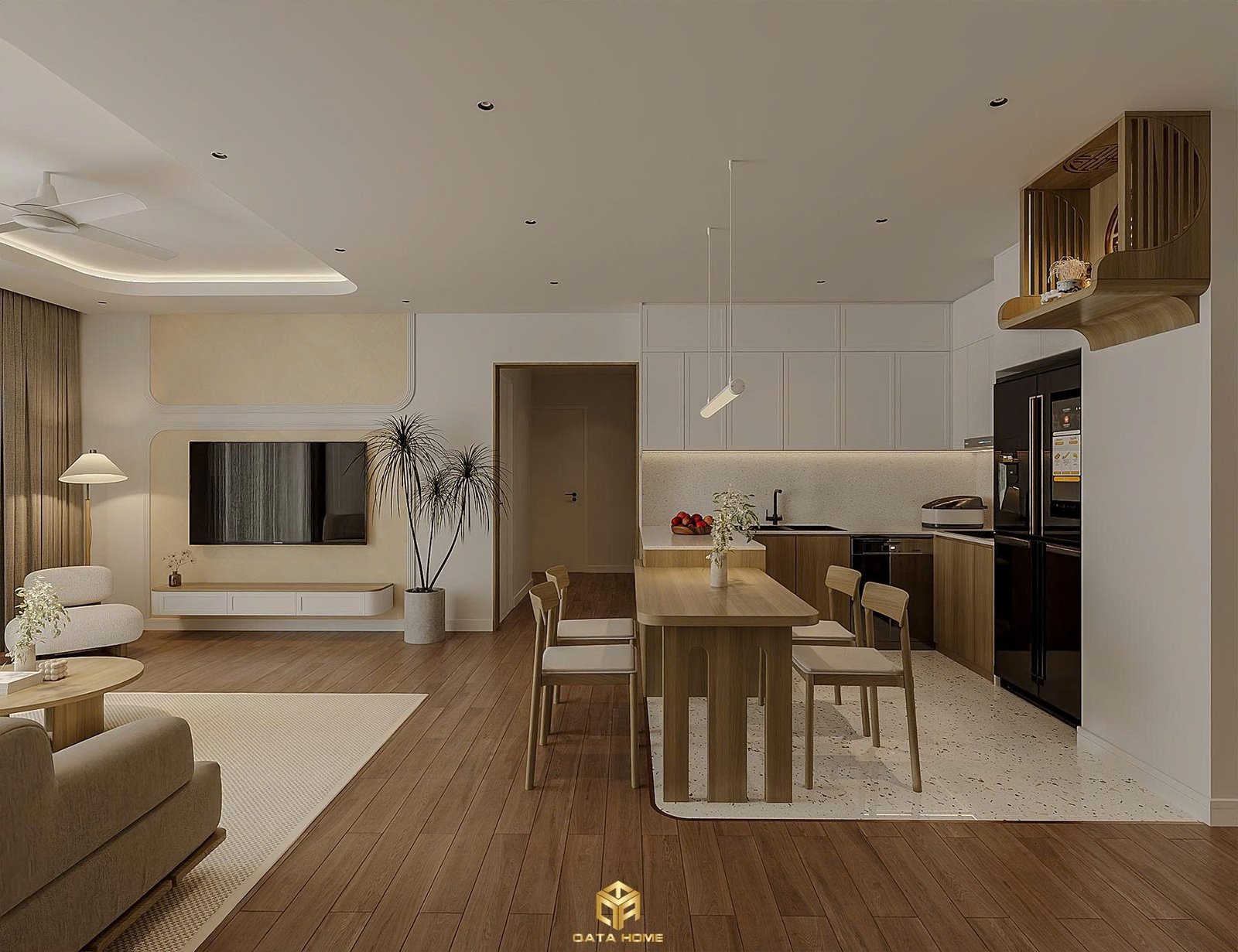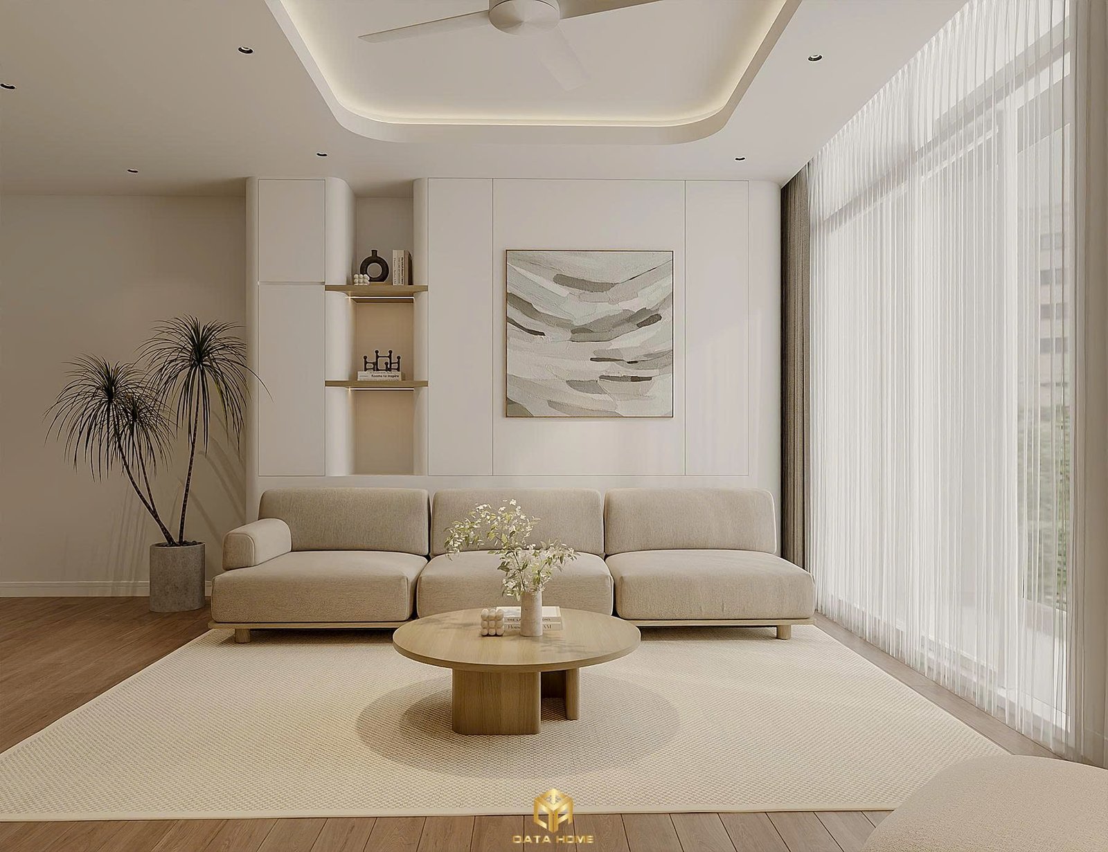 Phòng khách chính là nơi Qata Home thể hiện rõ nhất tinh thần hiện đại. Bức tường TV được thiết kế với đường phào tinh tế, kết hợp kệ trắng tối giản và hai chậu cây xanh cao vút tạo điểm nhấn sinh động. Bộ sofa vải boucle mềm mại ôm trọn không gian, kết hợp bàn trà tròn gỗ tự nhiên mang đến cảm giác gần gũi nhưng vẫn sang trọng.