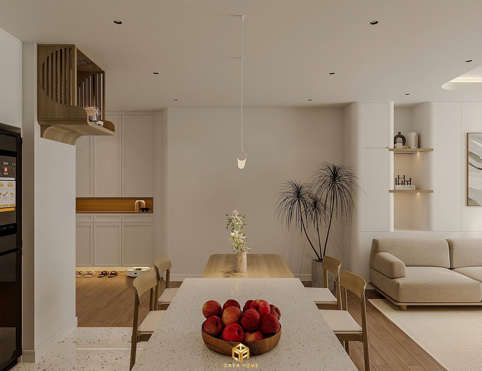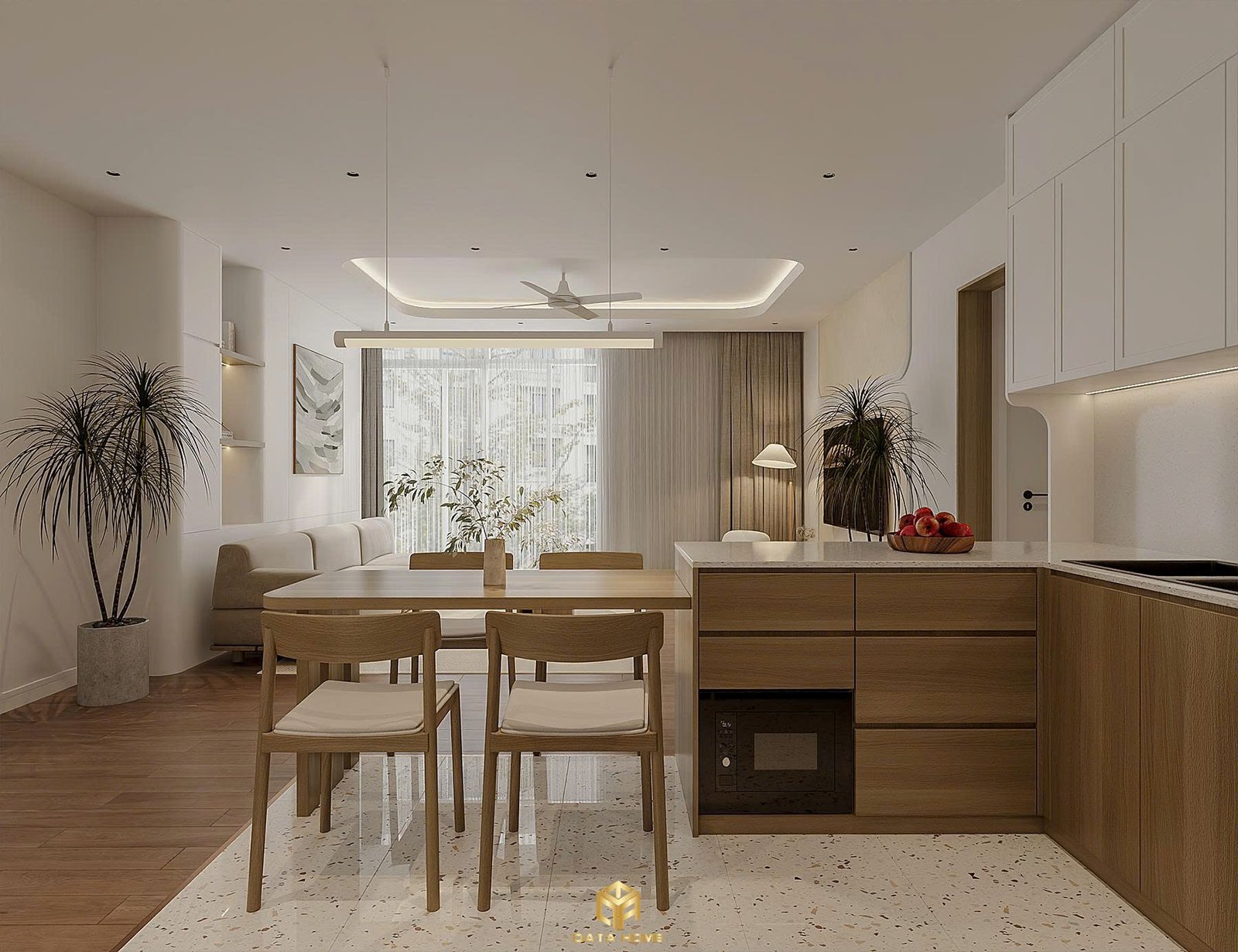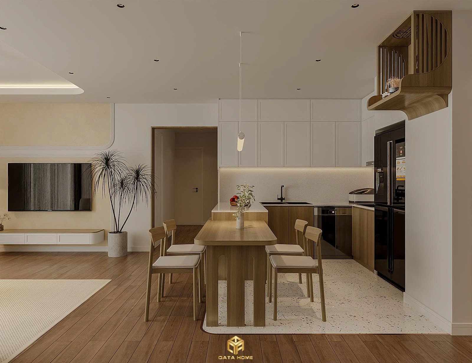 Qata Home đã khéo léo mở liên thông bếp – phòng ăn – phòng khách, tạo nên một không gian liền mạch đầy cuốn hút. Đảo bếp đá terrazzo trắng điểm những đường vân tinh tế, kết hợp tủ gỗ óc chó ấm áp. Bàn ăn gỗ dài với ghế tựa hiện đại và đèn thả trần tối giản biến mỗi bữa cơm thành khoảnh khắc đáng nhớ.