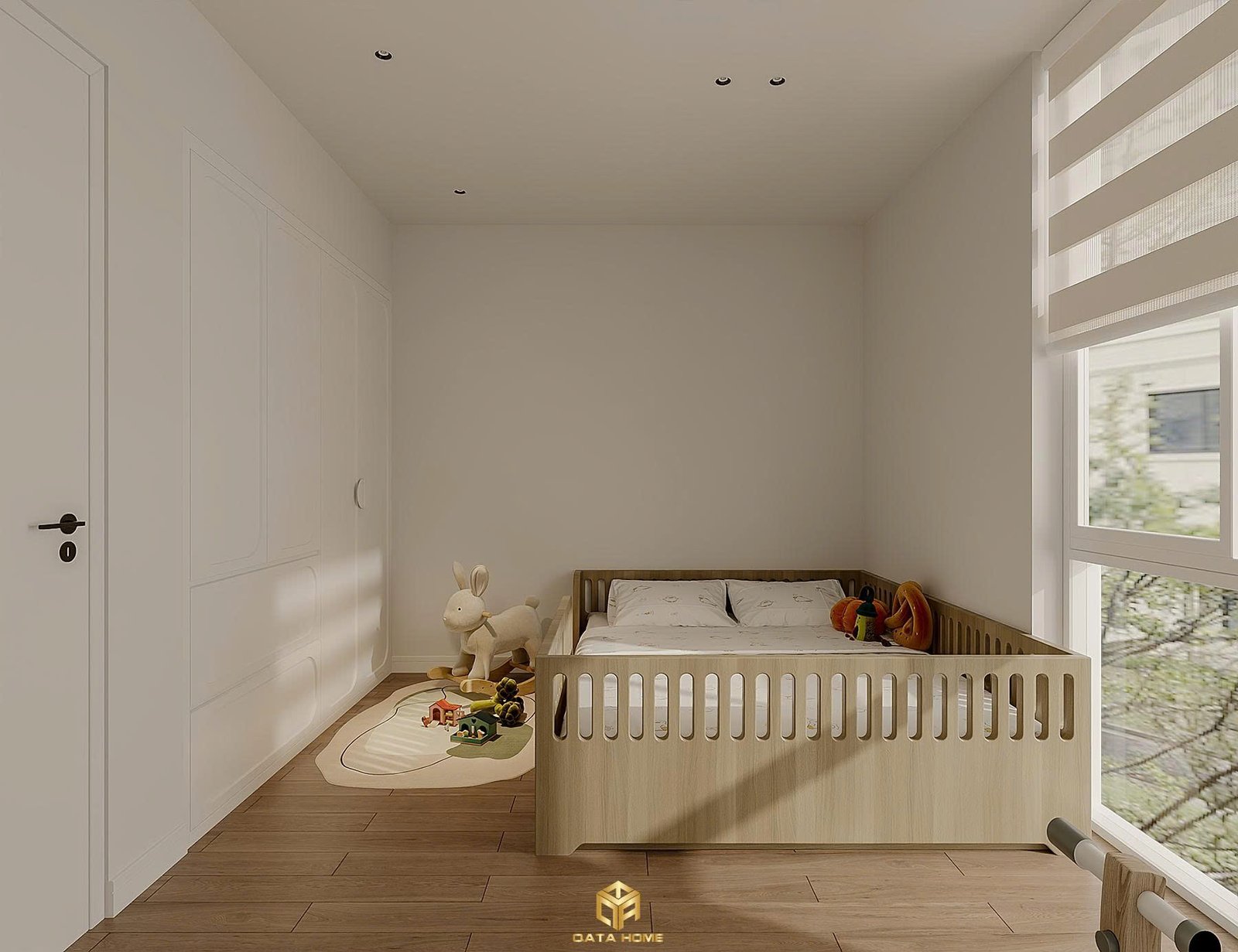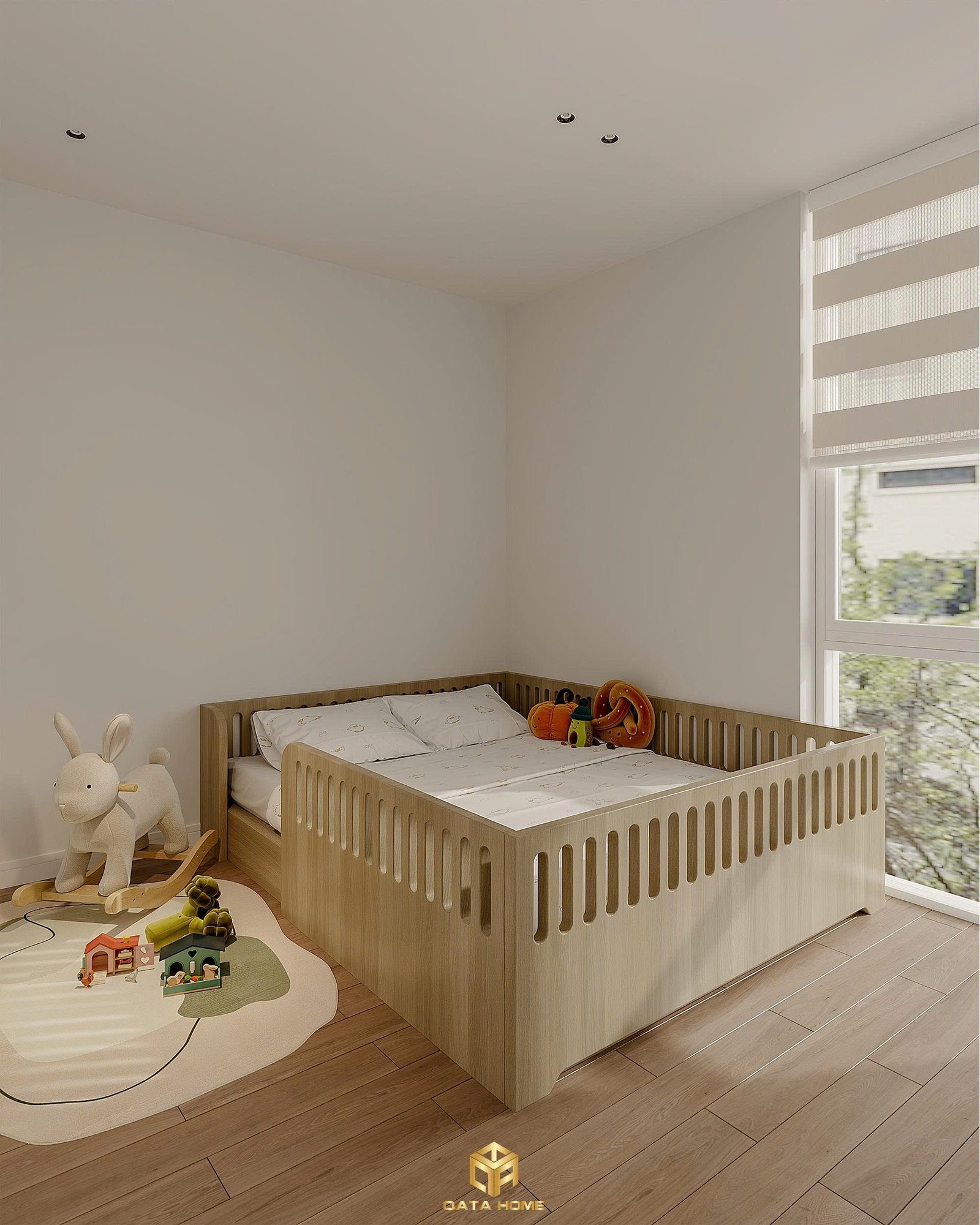 Mỗi góc nhỏ đều khuyến khích bé khám phá: từ ghế xoay văn phòng êm ái đến khu vực chơi với thảm xốp và đồ chơi gỗ tự nhiên
