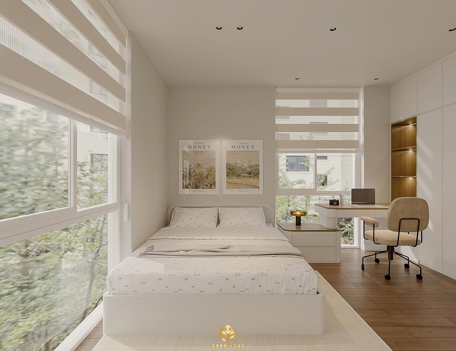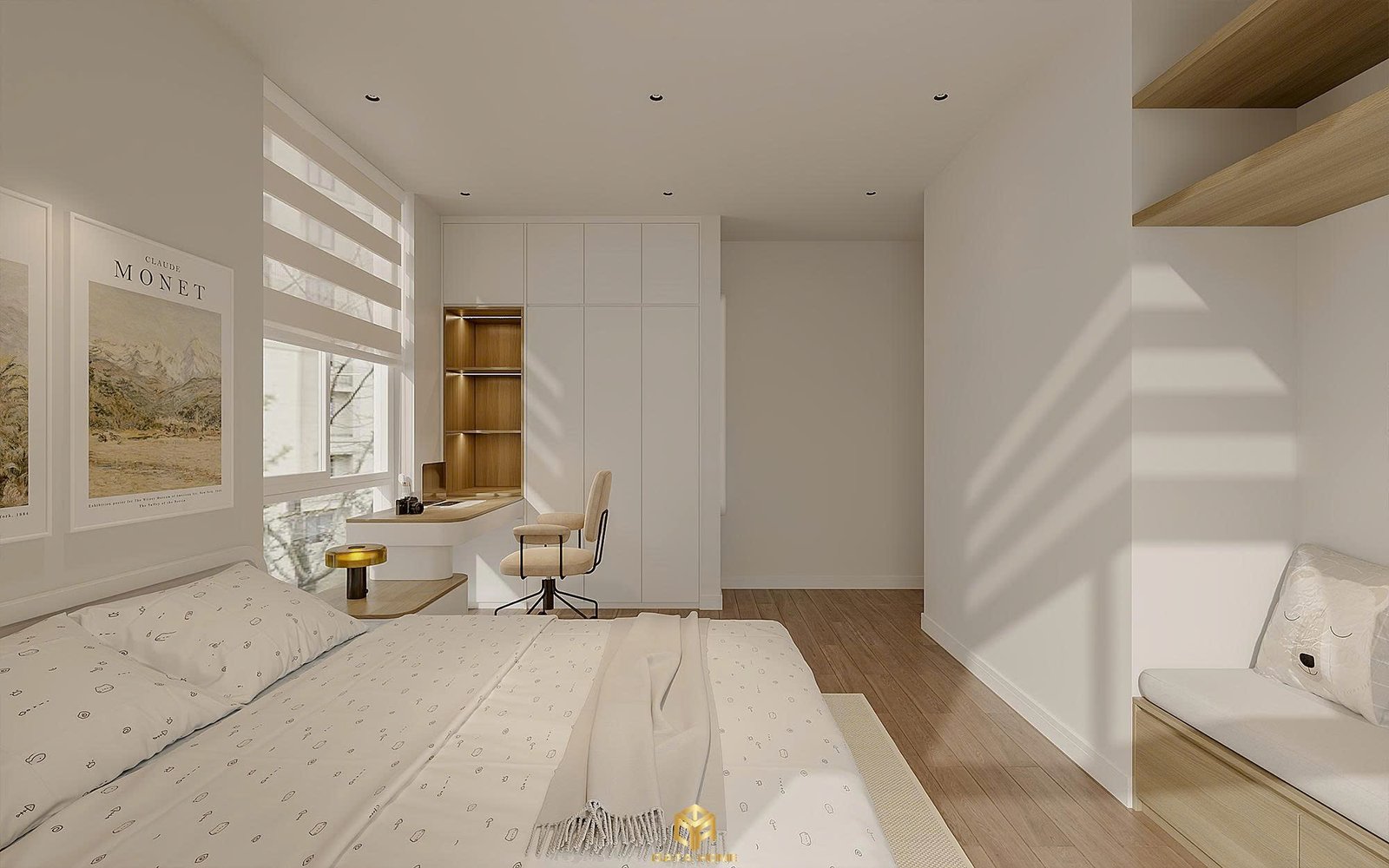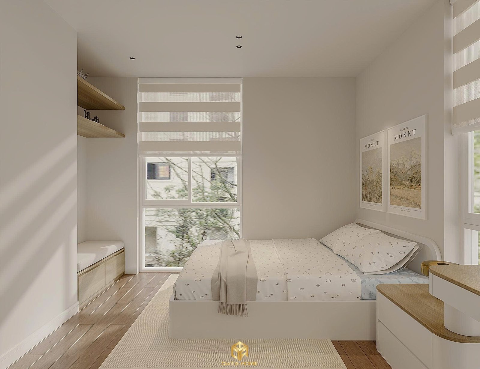 Phòng ngủ cho bé được thiết kế với giường thấp an toàn, hệ kệ treo tường và bàn học đa năng. Hai bức tranh Claude Monet treo đối xứng mang đến nguồn cảm hứng nghệ thuật ngay từ nhỏ. Rèm roman blinds kiểm soát ánh sáng dịu nhẹ, kết hợp với hệ tủ âm tường giữ cho không gian luôn gọn gàng.