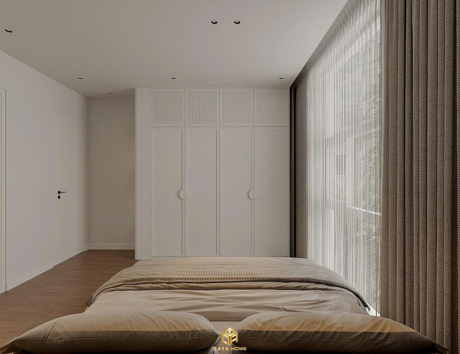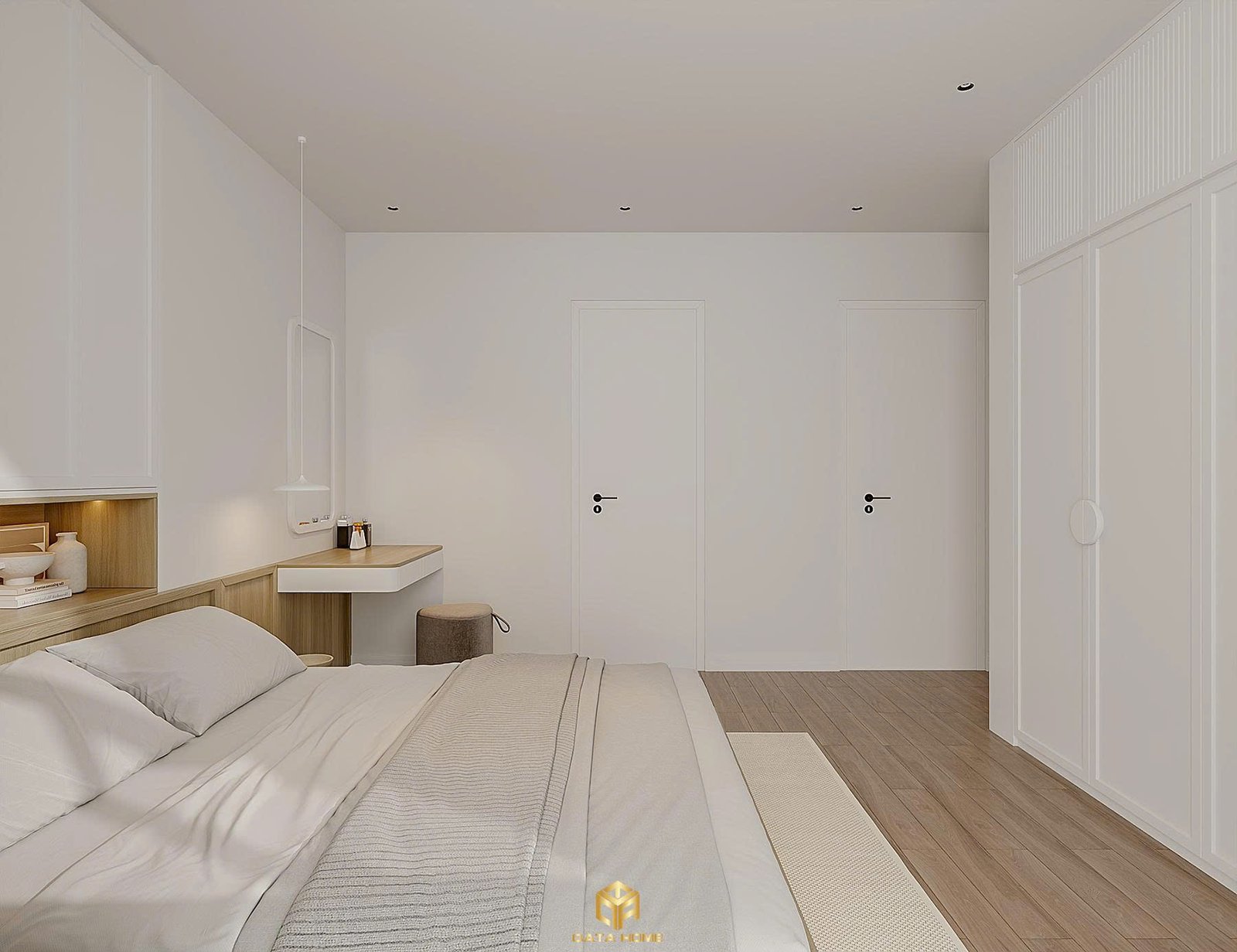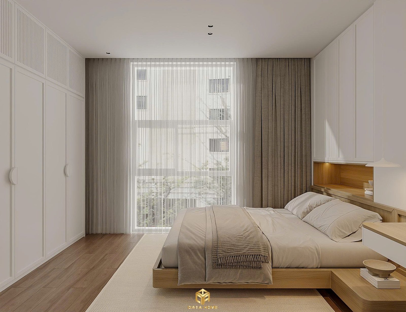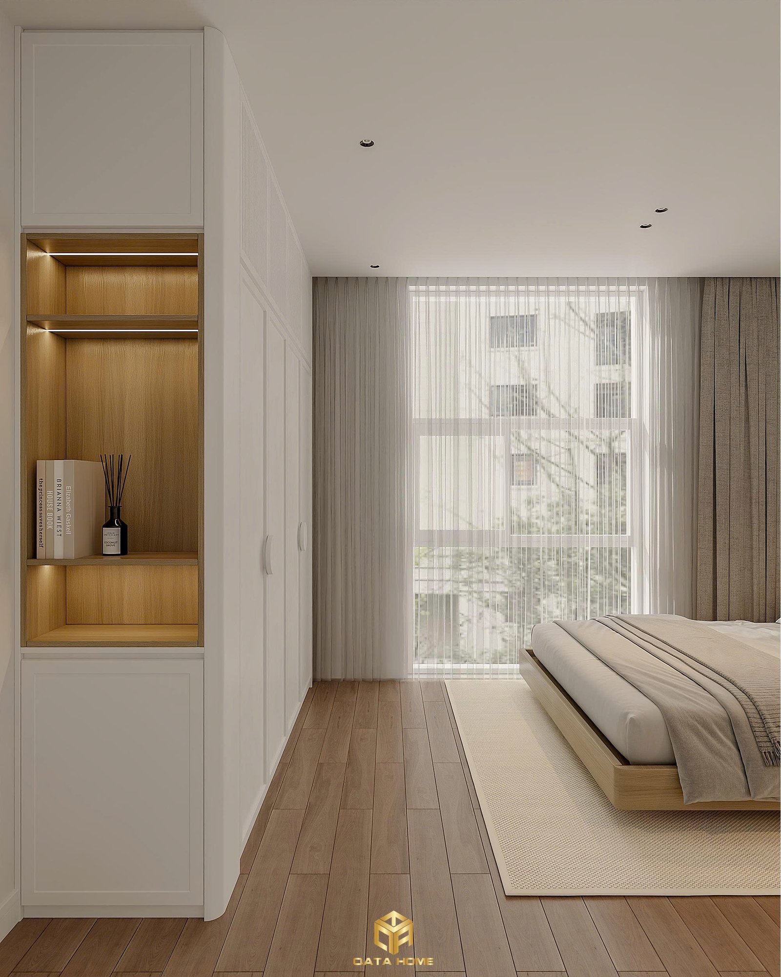 Phòng ngủ chính mang đến cảm giác bình yên tuyệt đối. Giường ngủ thấp kiểu floating bed với đầu giường tích hợp kệ gỗ ấm áp, kết hợp tủ âm tường liền mạch từ sàn đến trần. Bàn trang điểm tối giản đặt bên cửa sổ lớn, nơi ánh sáng tự nhiên chiếu rọi vào gương trang điểm tròn viền trắng.